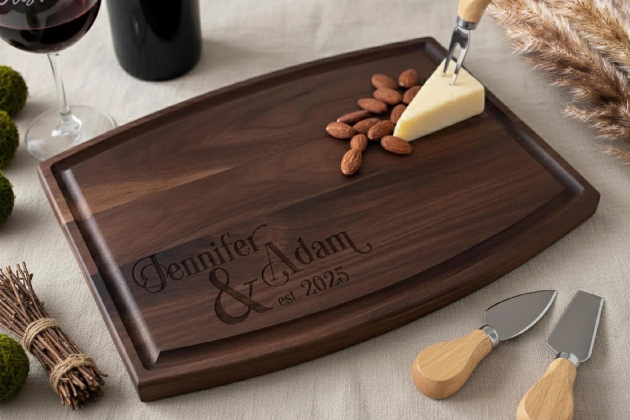 Elegant Custom Engraving: Our cutting board is thoughtfully engraved with the couple’s names and their special date, creating a personalized tribute that symbolizes their journey together. This refined detail adds an emotional touch, making the board a lasting reminder of their love.