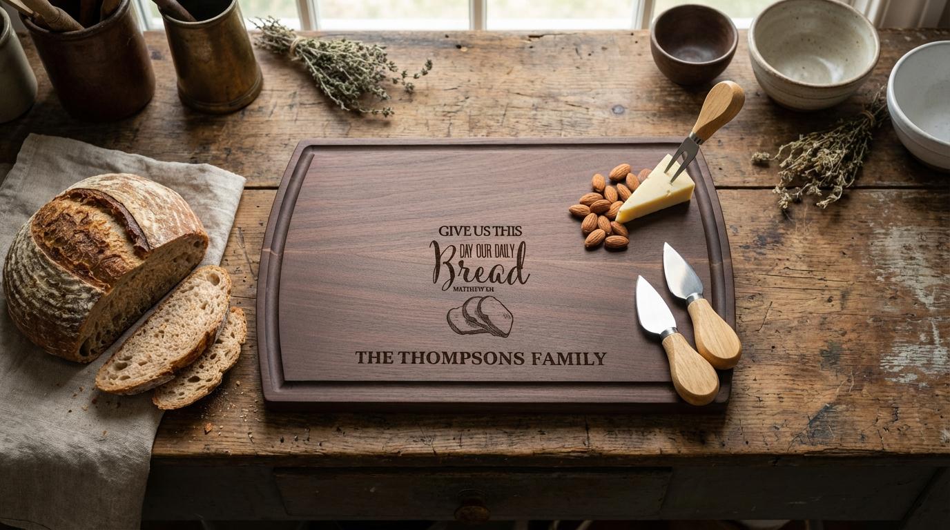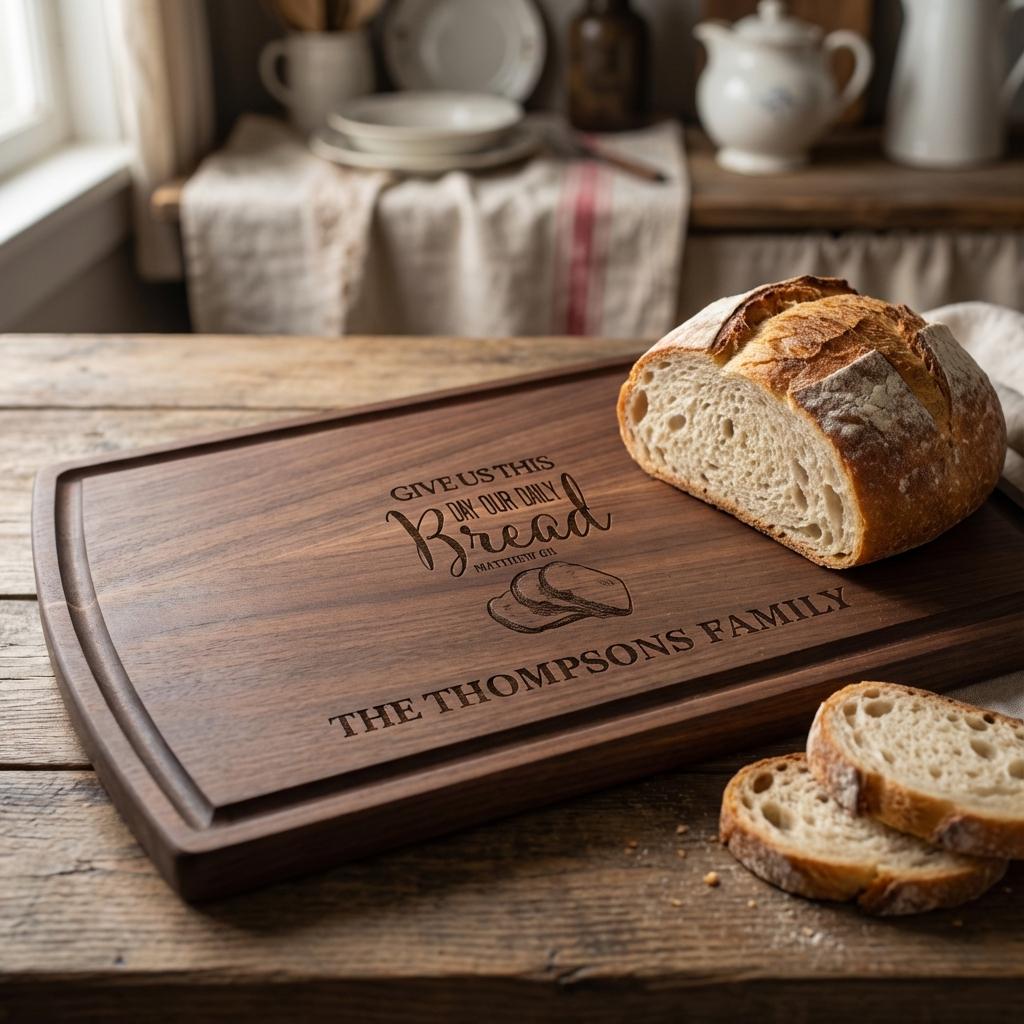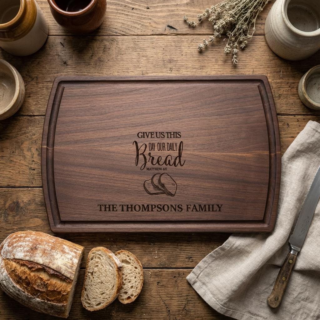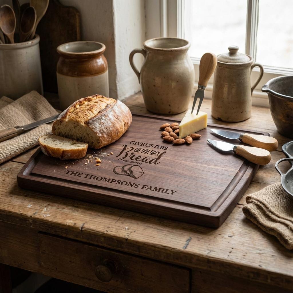 Elegant Custom Engraving: The beloved Bible verse “Give Us This Day Our Daily Bread” and your family name are beautifully engraved and seamlessly incorporated, creating a one-of-a-kind keepsake that celebrates faith and family. The detailed engraving adds a spiritual and stylish element to any kitchen or dining space.