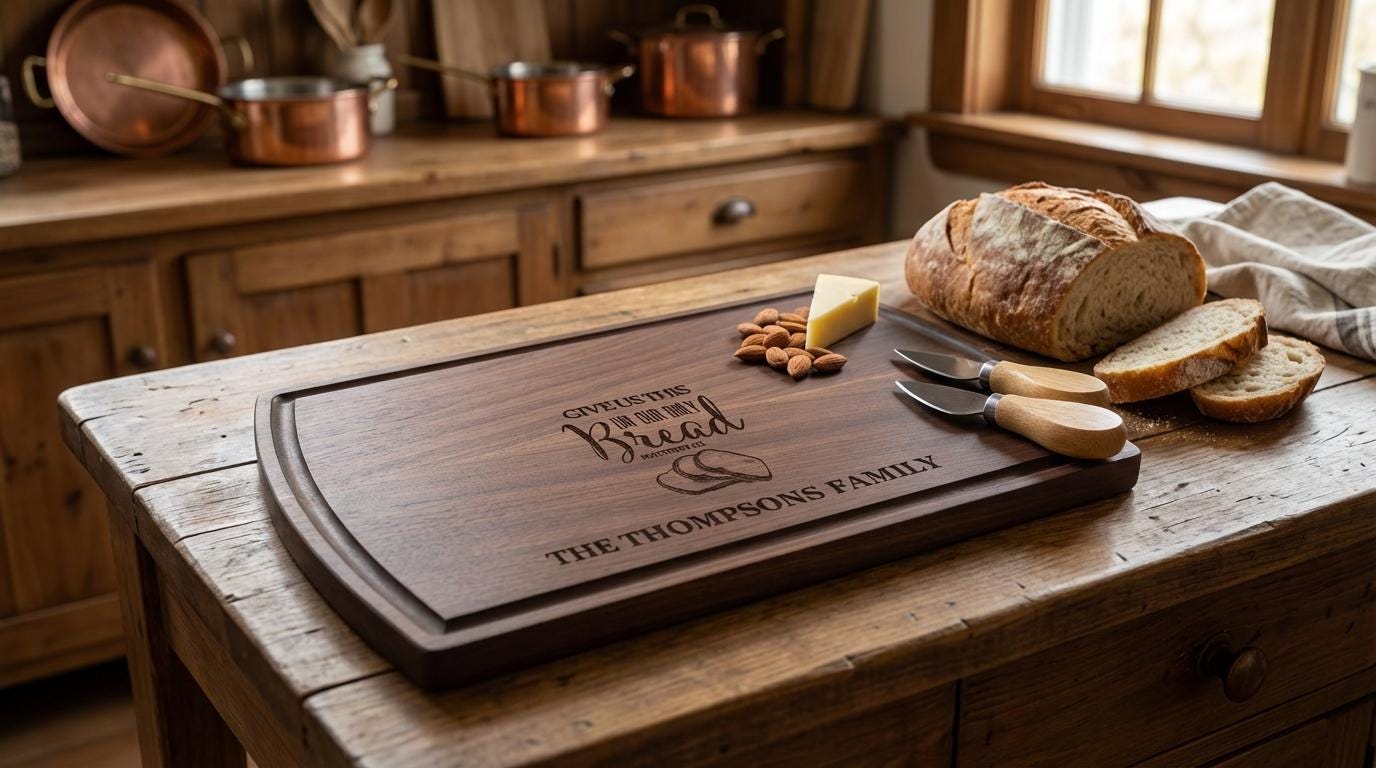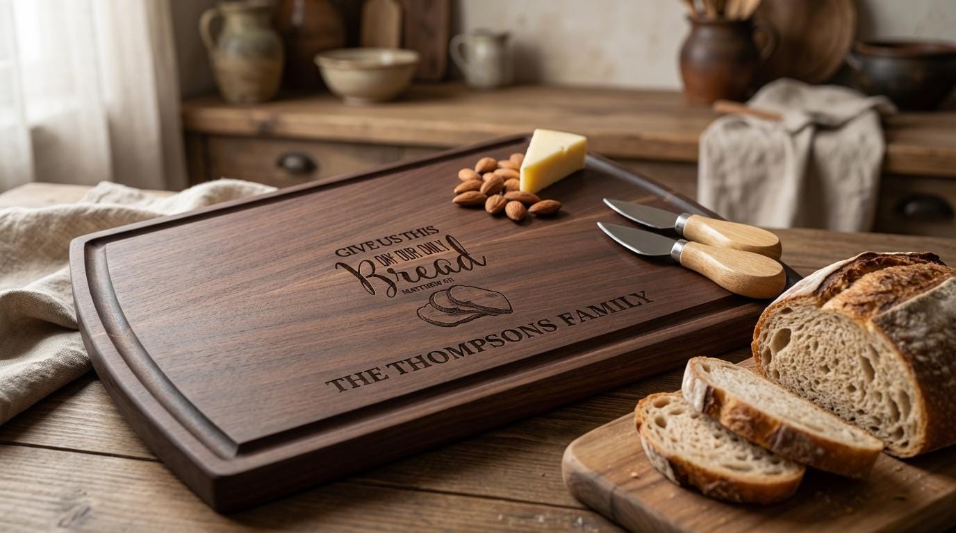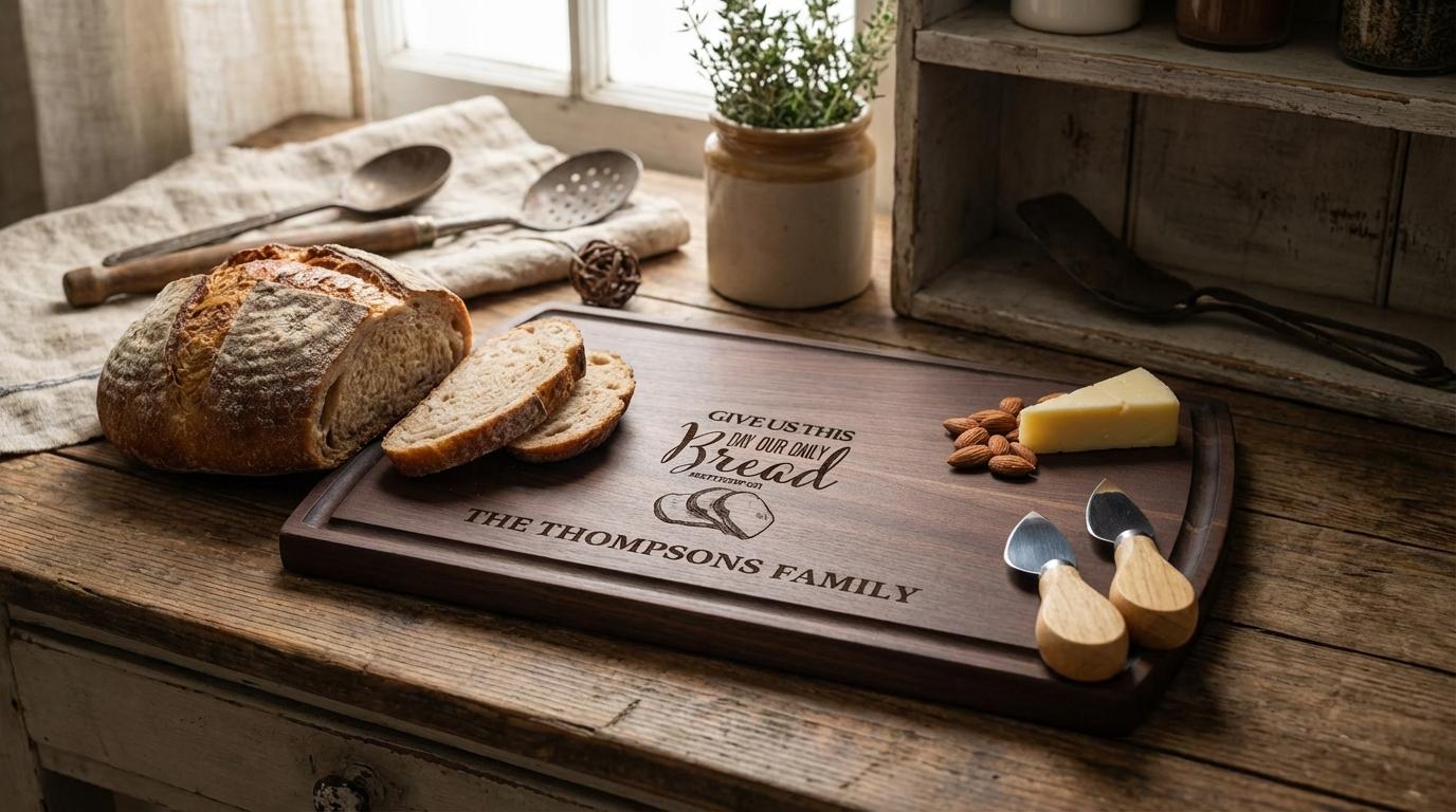 Elegant Custom Engraving: The beloved Bible verse “Give Us This Day Our Daily Bread” and your family name are beautifully engraved and seamlessly incorporated, creating a one-of-a-kind keepsake that celebrates faith and family. The detailed engraving adds a spiritual and stylish element to any kitchen or dining space.
