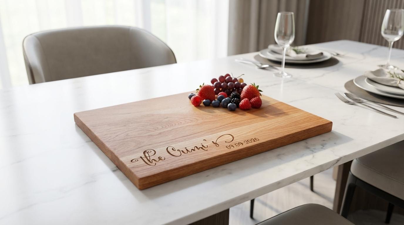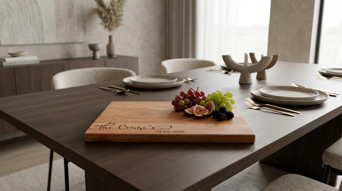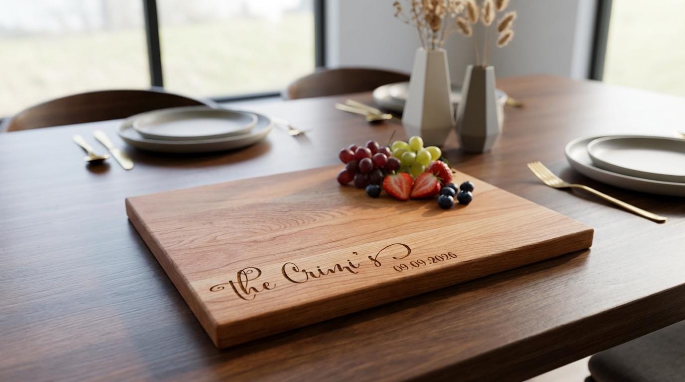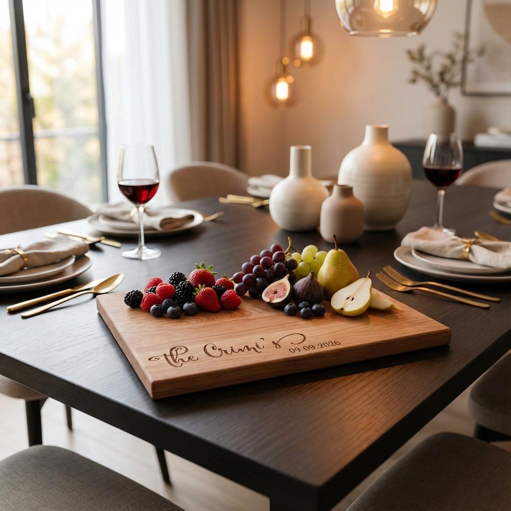 Elegant Custom Engraving: The couple’s last name and special date are thoughtfully engraved, adding a meaningful touch to this functional yet decorative cutting board.