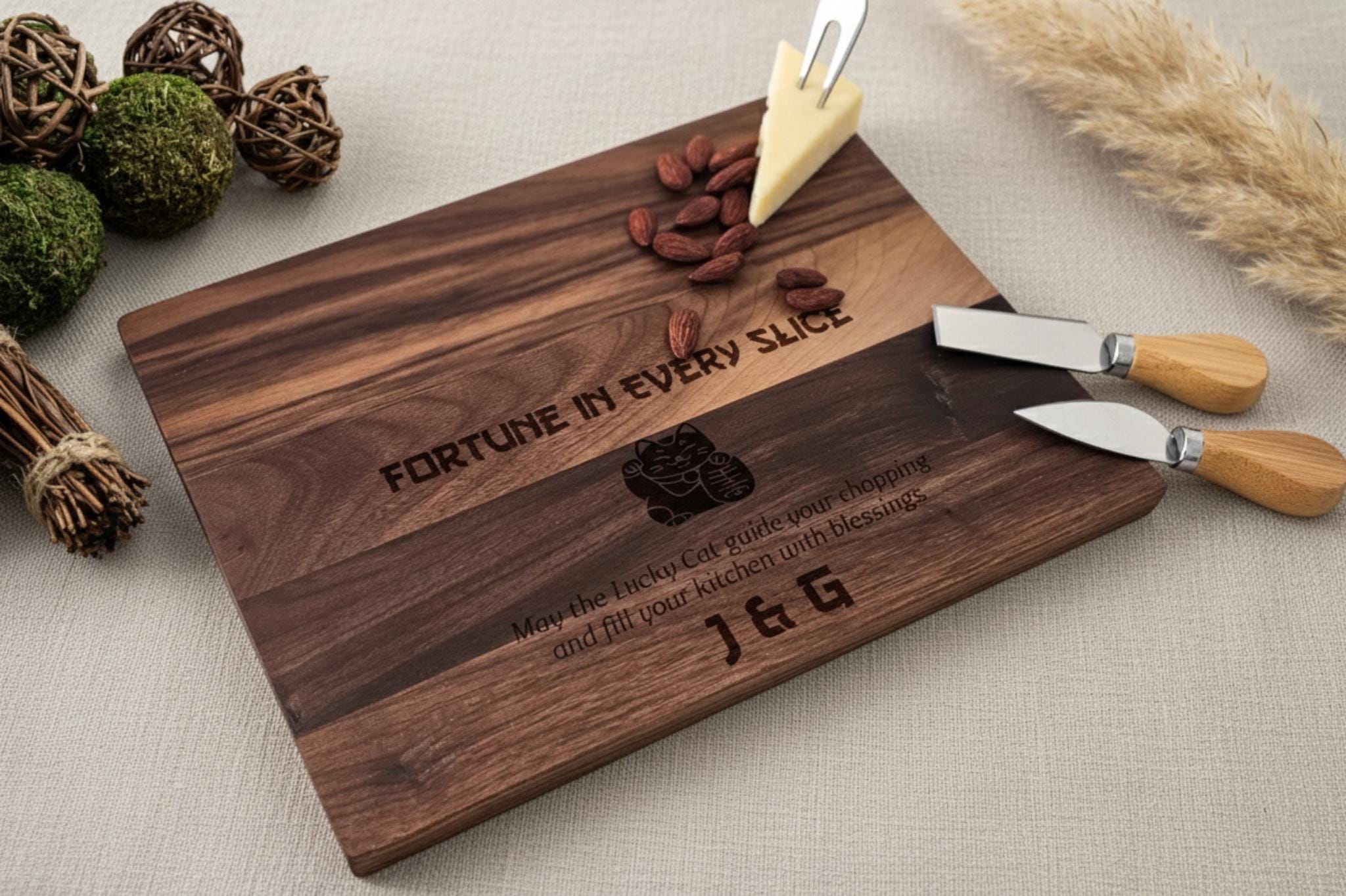 Signature Custom Engraving: Carefully laser engraved with the Lucky Cat motif, the couple’s initials, and themed phrases, this board captures positivity and unique personal touches.