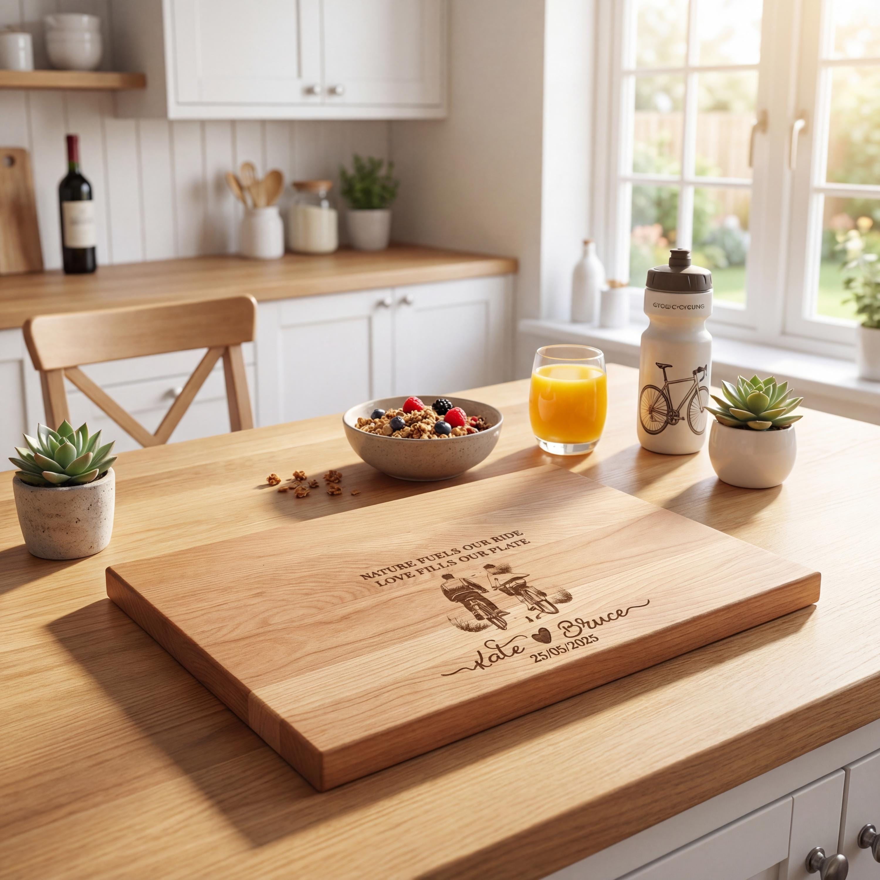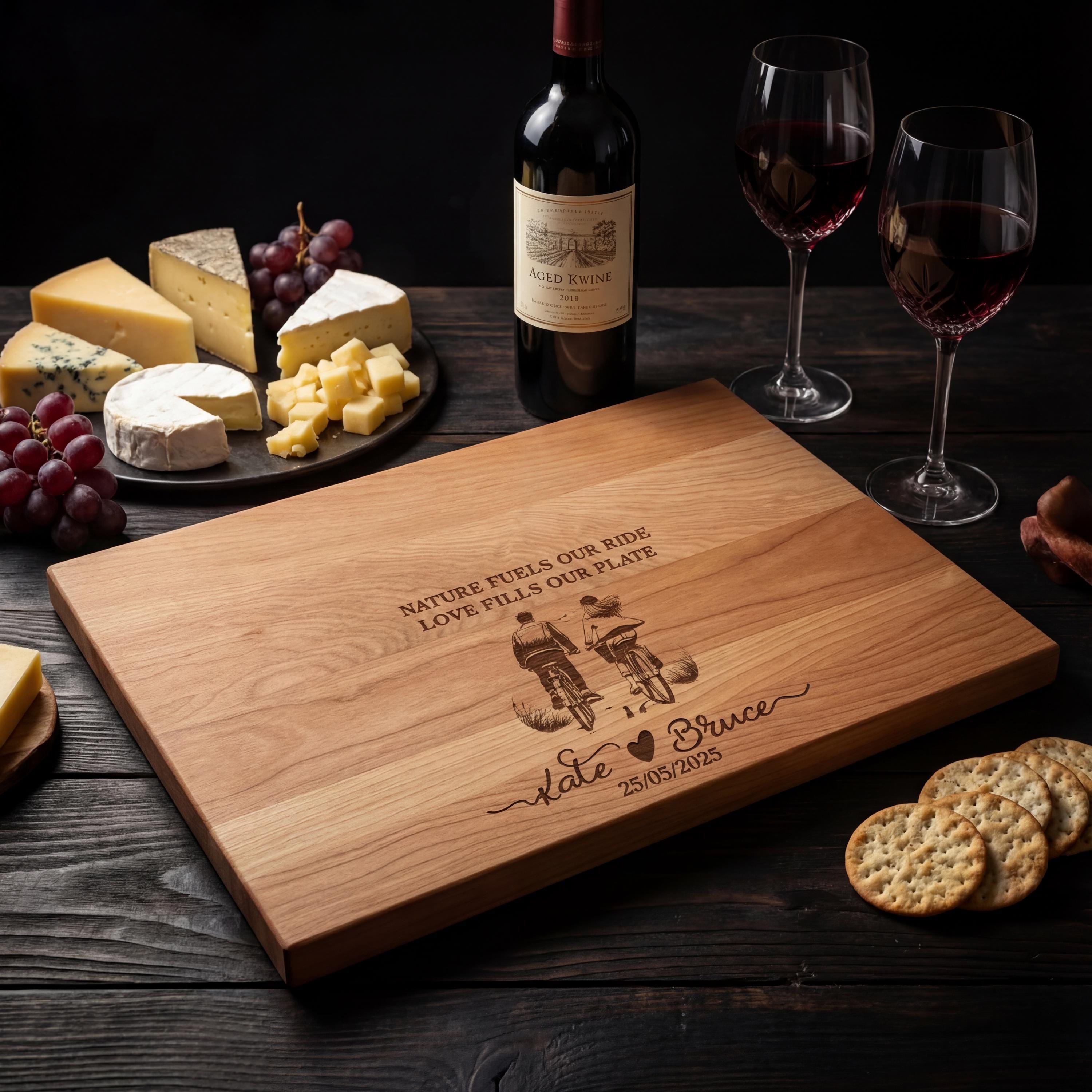 Celebrate your shared adventures and passion for biking with a cutting board that's as dynamic as your love story. This handcrafted board is specially designed for biking couples, featuring an elegant and romantic engraving with a charming scenery and your personalized names. Whether you're prepping ingredients in the kitchen or displaying it as a conversation piece, this board is a tribute to the joy of riding and the warmth of togetherness.