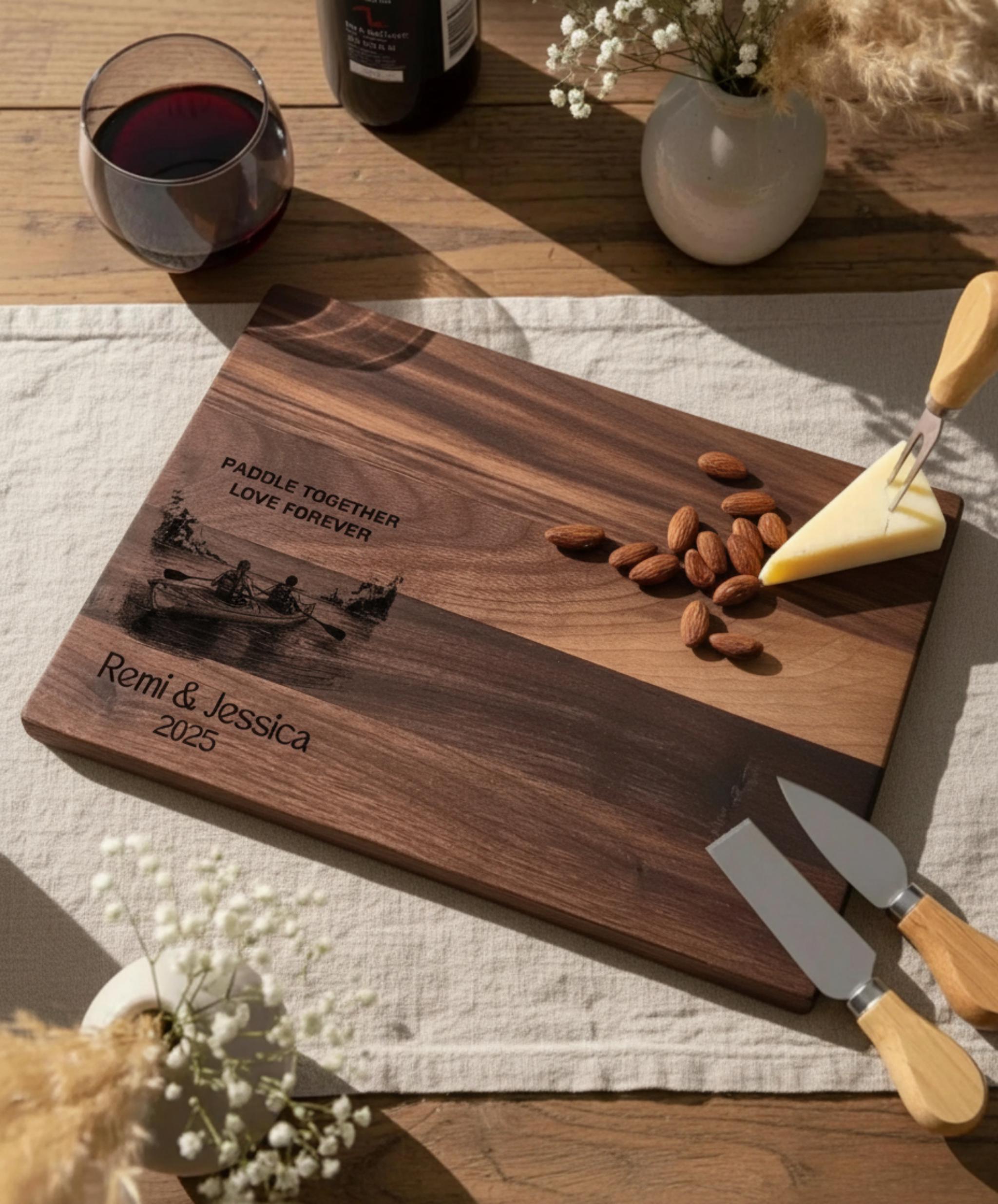 Celebrate your love for adventure and the water with this beautifully handcrafted cutting board, designed for kayaking and canoeing couples. Featuring custom engraving of your names & year alongside a charming paddling couple design, this board is the perfect keepsake for those who cherish the serenity of open waters and shared journeys.