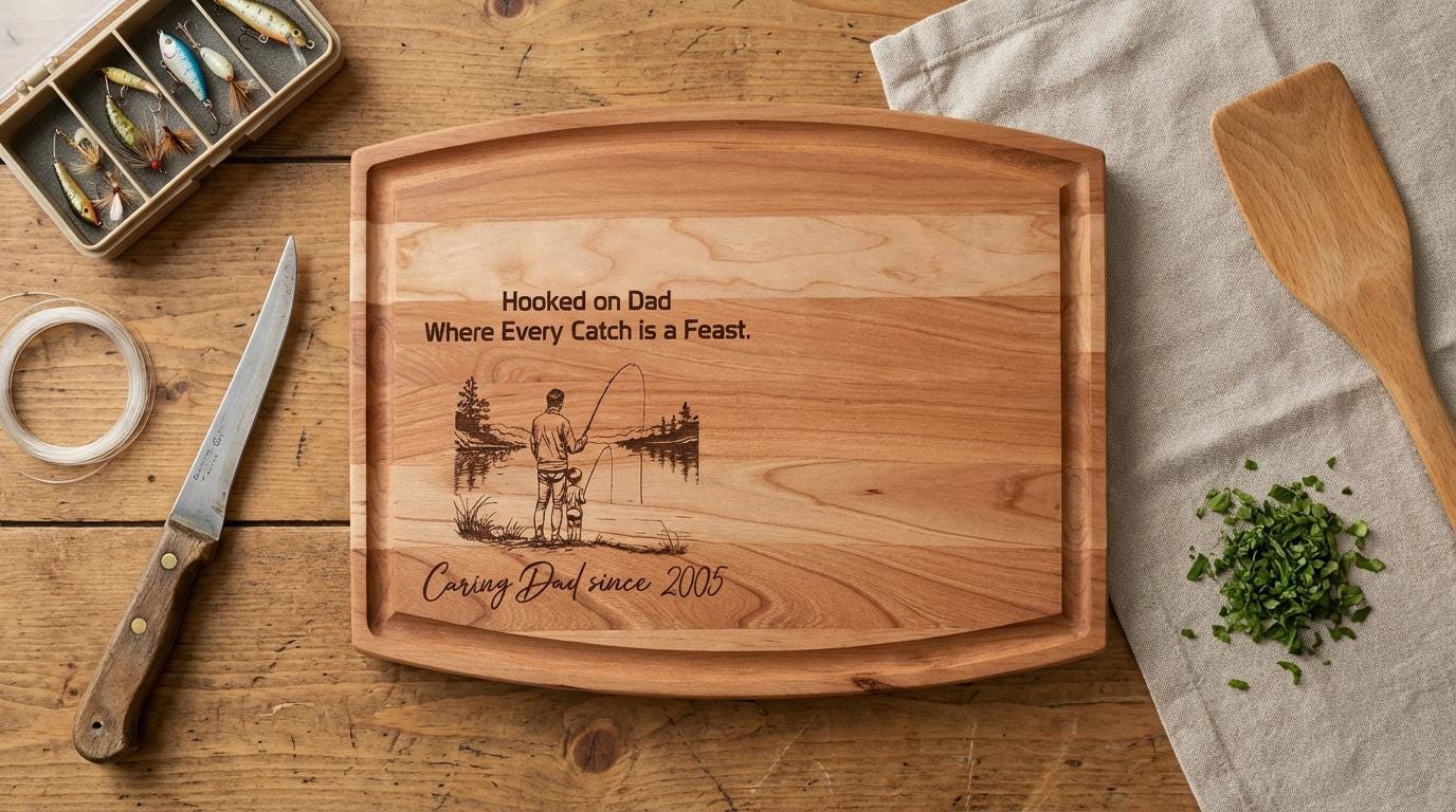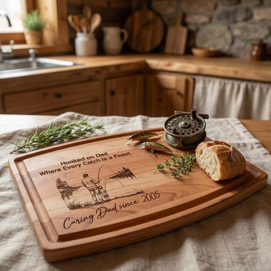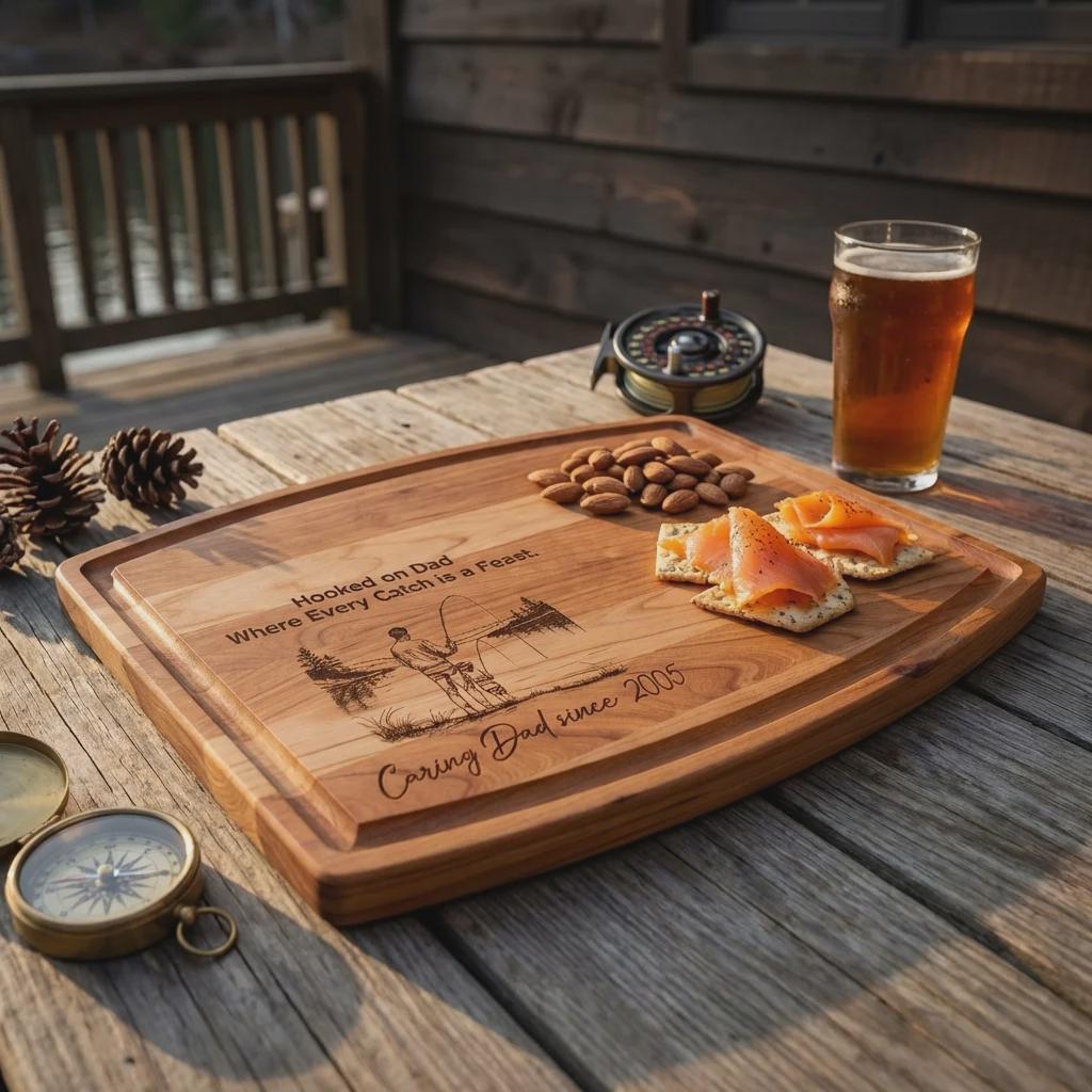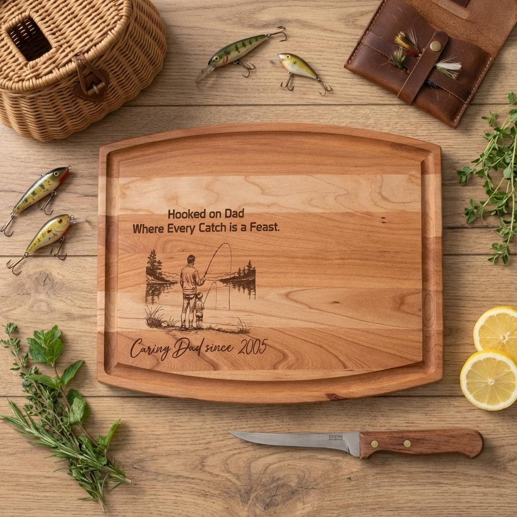 Custom Engraving: Personalize your cutting board with your names or a special message, paired with a fishing design and thoughtful text that reflects your shared love for casting lines and reeling in memories.