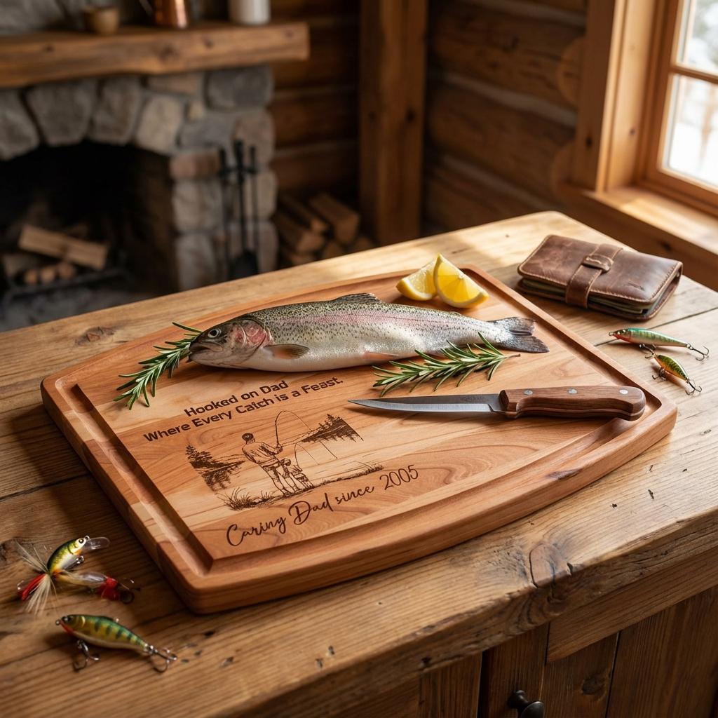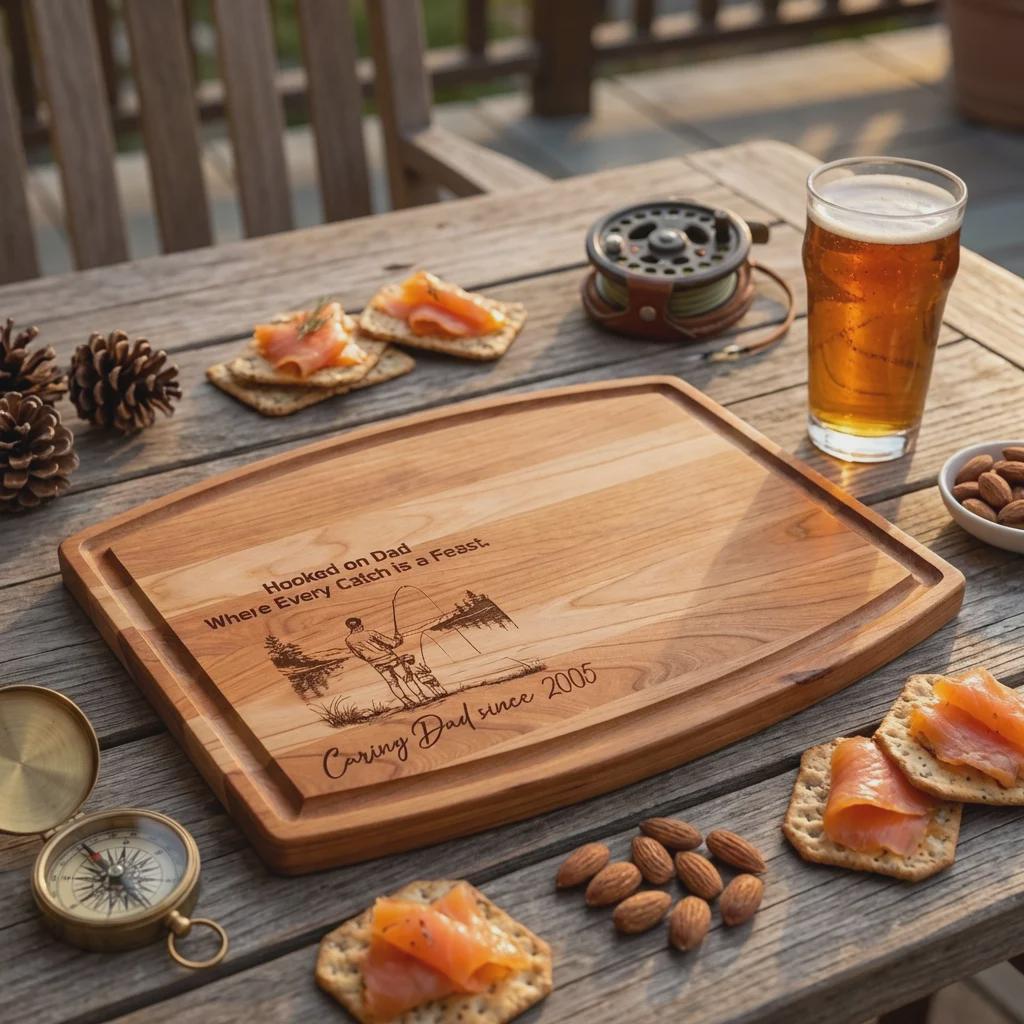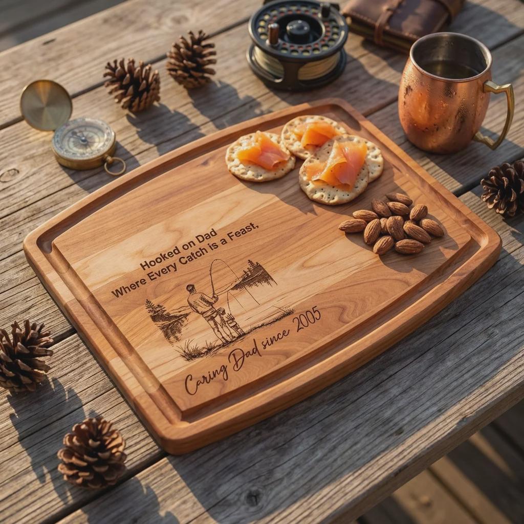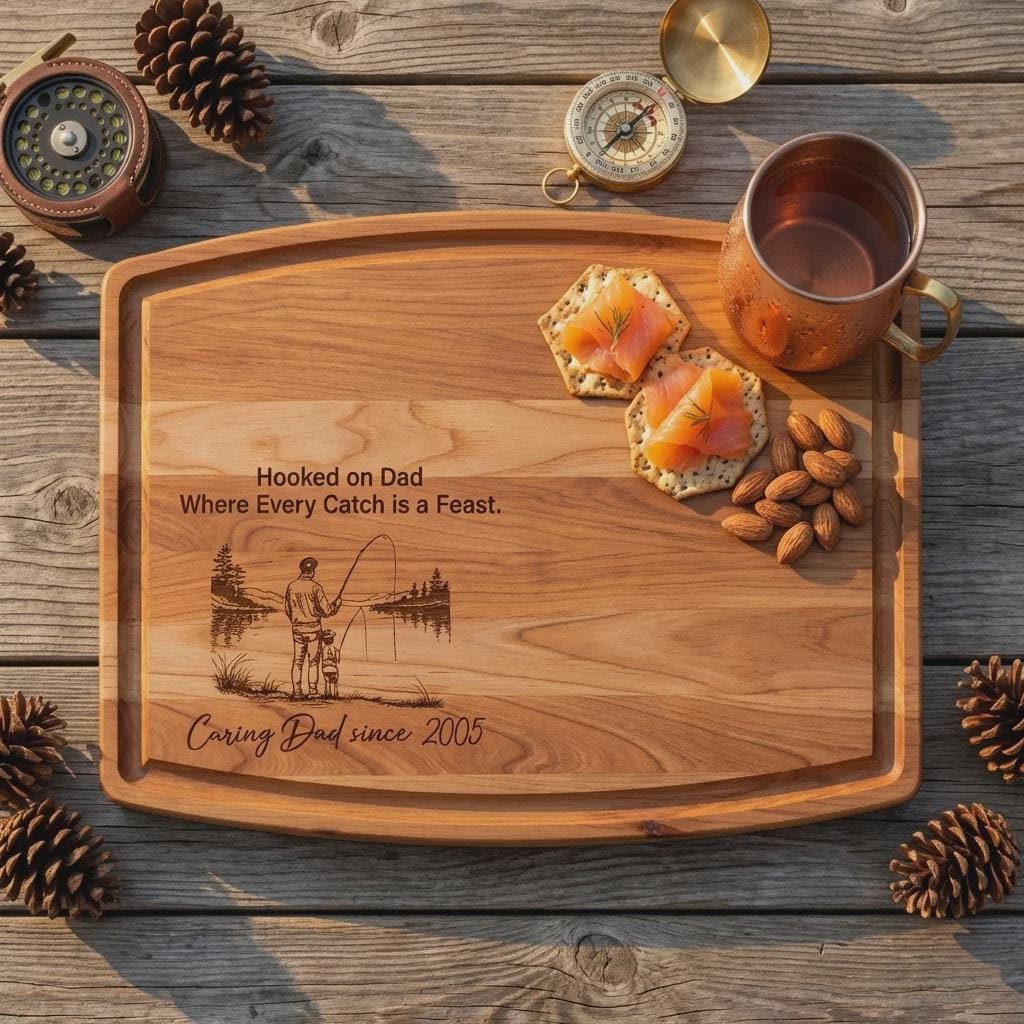 Celebrate Your Bond: This cutting board commemorates the cherished moments spent fishing together, from early mornings by the lake to the stories told while waiting for the next catch.