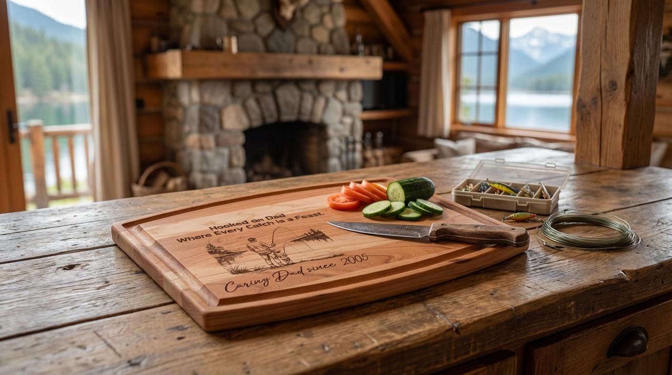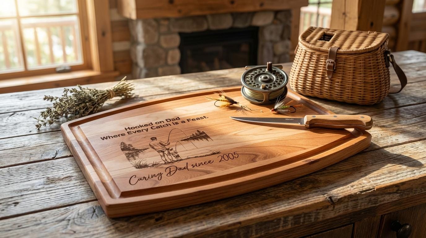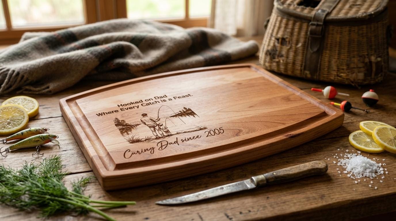 Celebrate Your Bond: This cutting board commemorates the cherished moments spent fishing together, from early mornings by the lake to the stories told while waiting for the next catch.