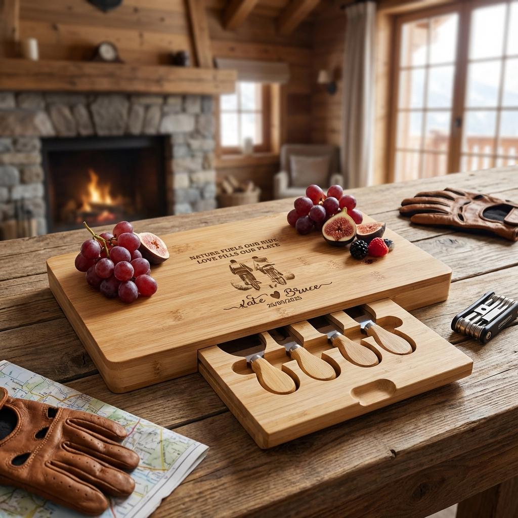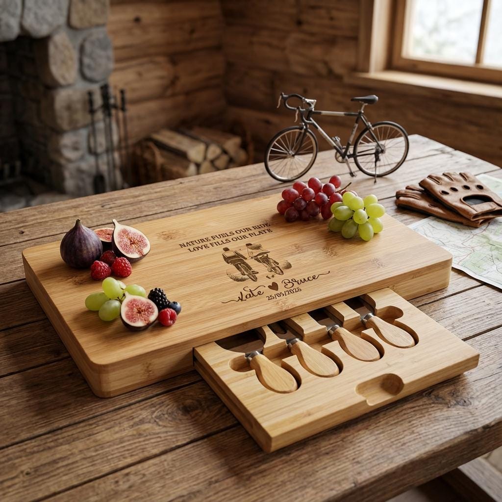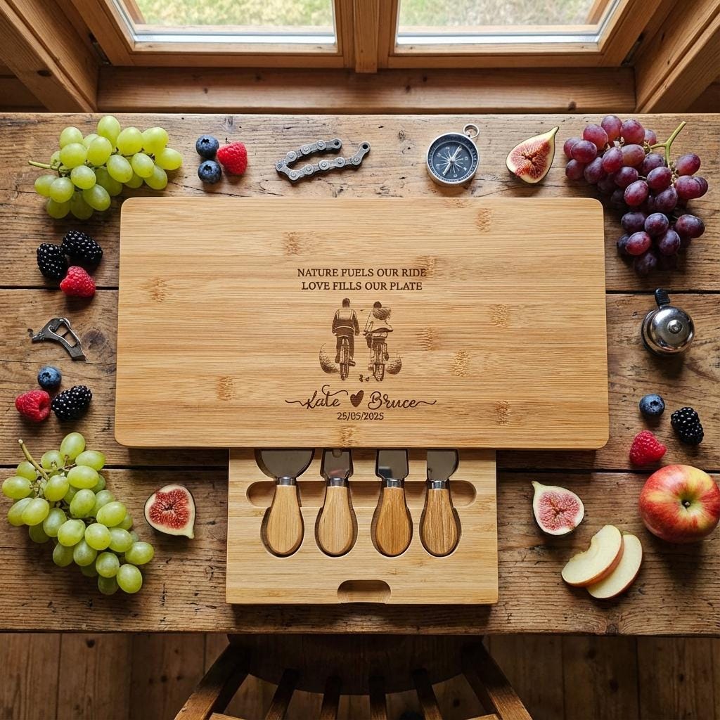 Fuel their next adventure with this personalized biking charcuterie board set. Featuring a custom cycling couple engraving and a hidden knife drawer, this bamboo cheese board is the ultimate wedding gift for cyclists or an anniversary present for the outdoorsy duo