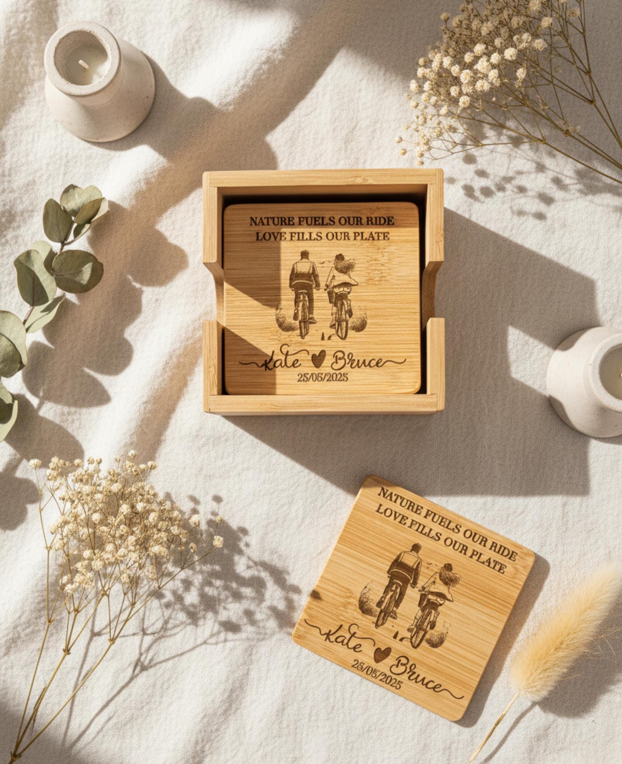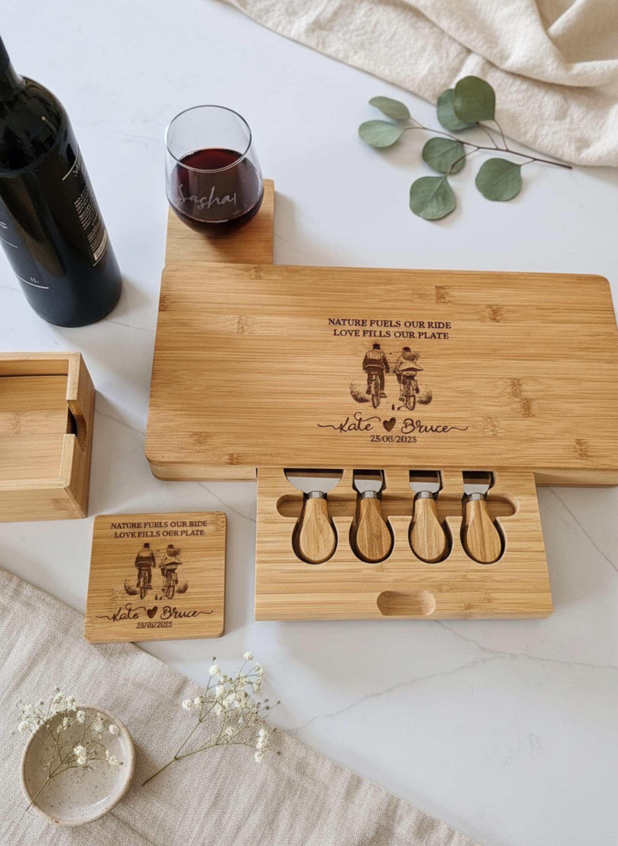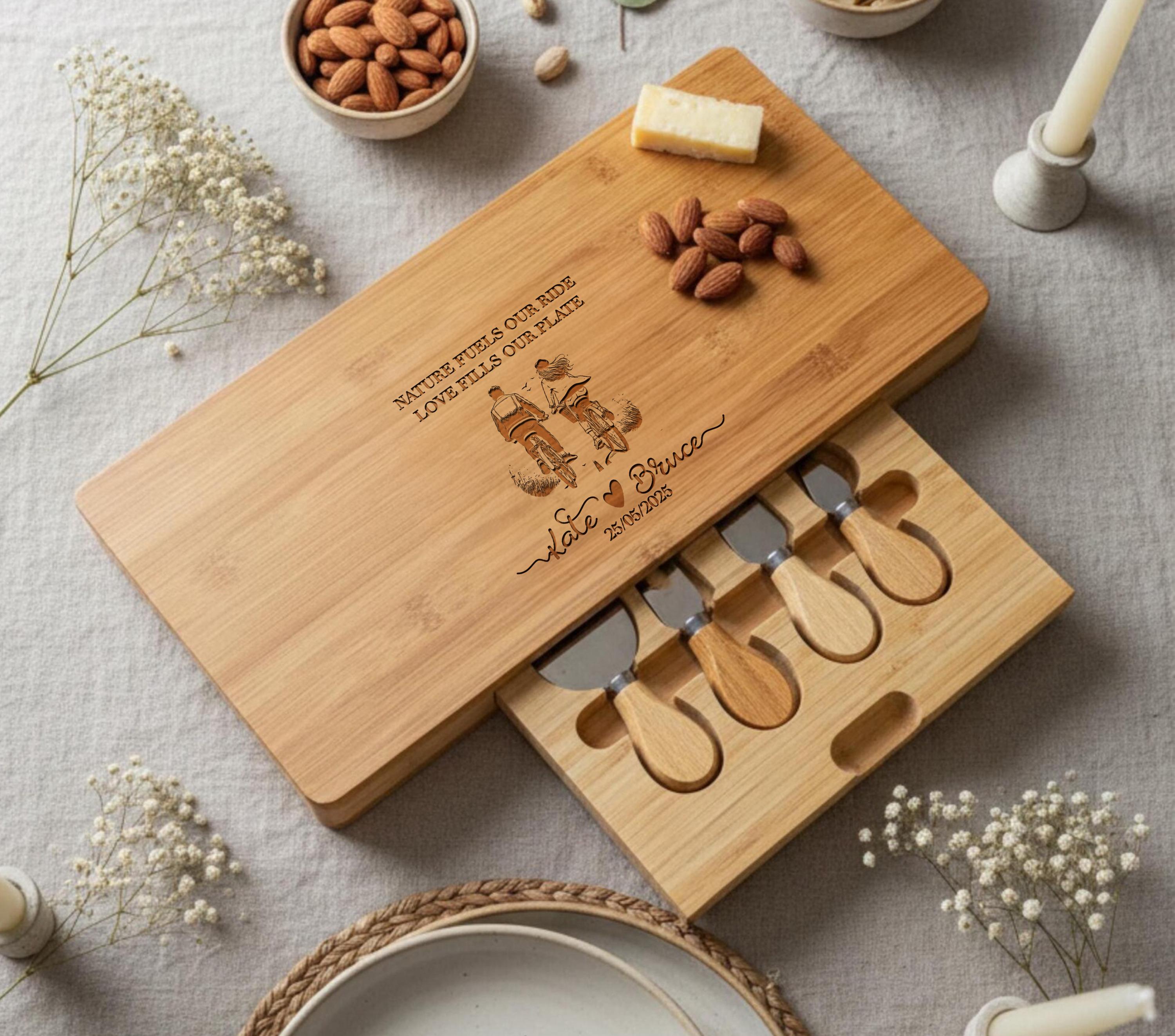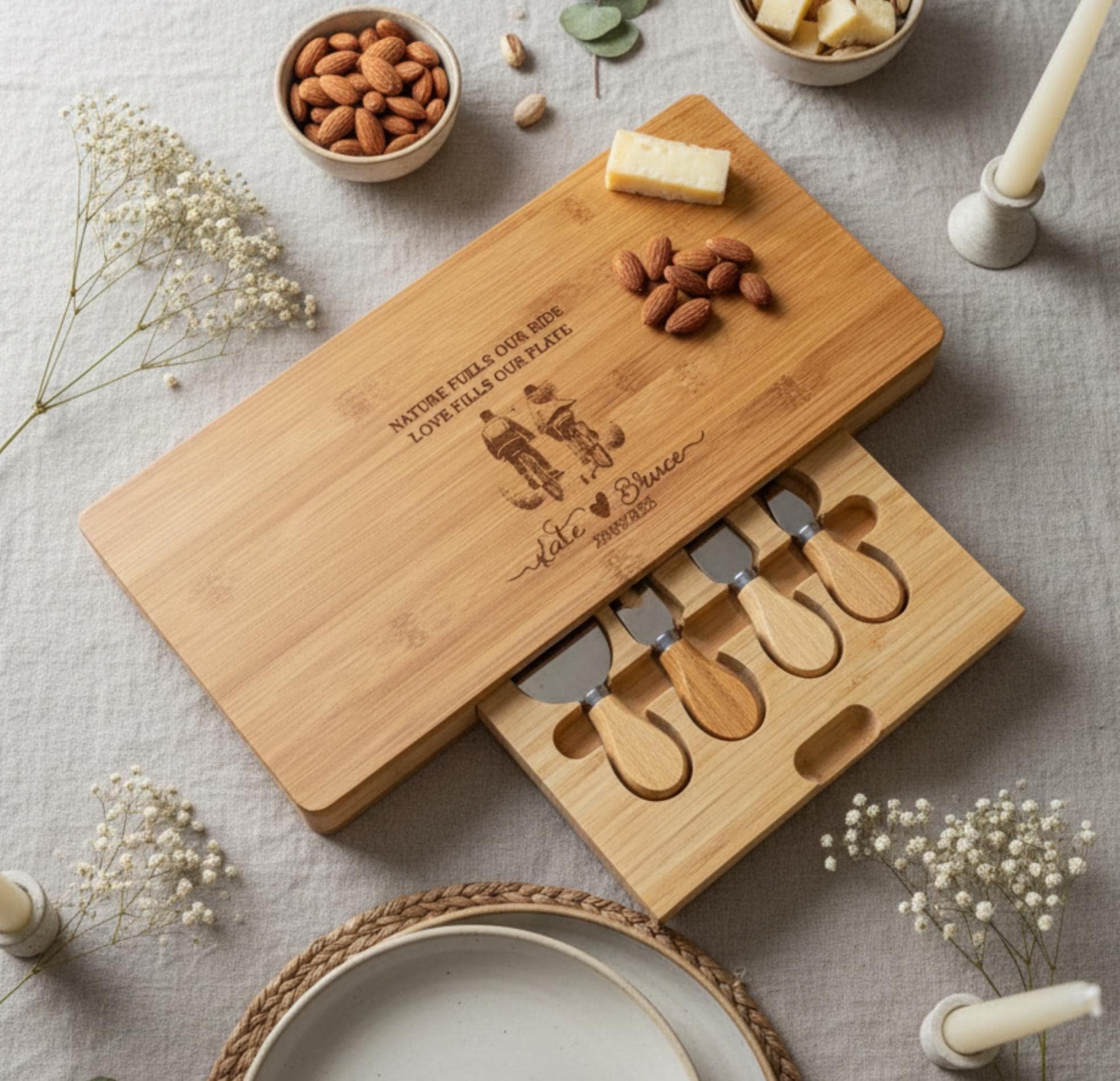 For couples who love the thrill of the ride and the satisfaction of a delicious reward, our custom engraved bamboo cheese board is the perfect companion. Crafted from sustainable bamboo, this board is designed for sharing moments and tasty treats after conquering trails or enjoying leisurely bike tours. It’s more than just a cheese board; it's a celebration of your shared passion for biking and good food.