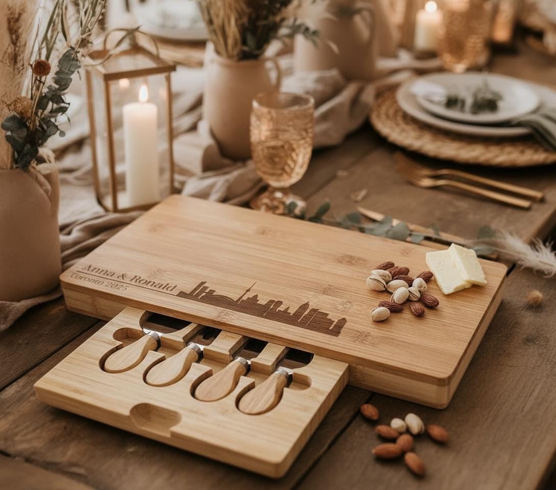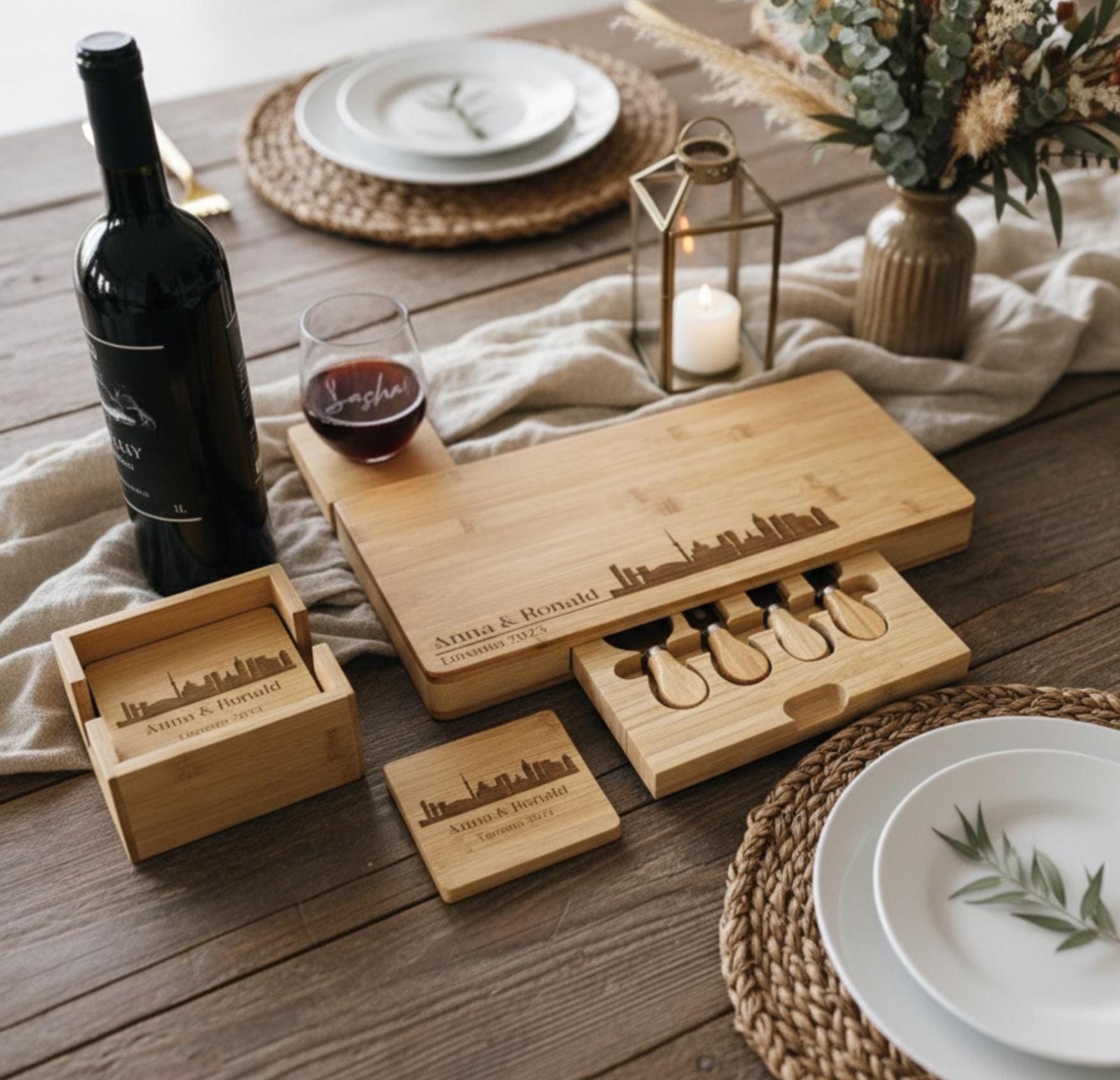 For couples who cherish their memories made in the vibrant city of Toronto, our custom engraved bamboo cheese board is the perfect keepsake. Crafted from sustainable bamboo, this board is designed for sharing moments and delicious treats while reminiscing about your time in the 6ix. It’s more than just a cheese board; it's a celebration of your shared connection to Toronto and the love you've built together.