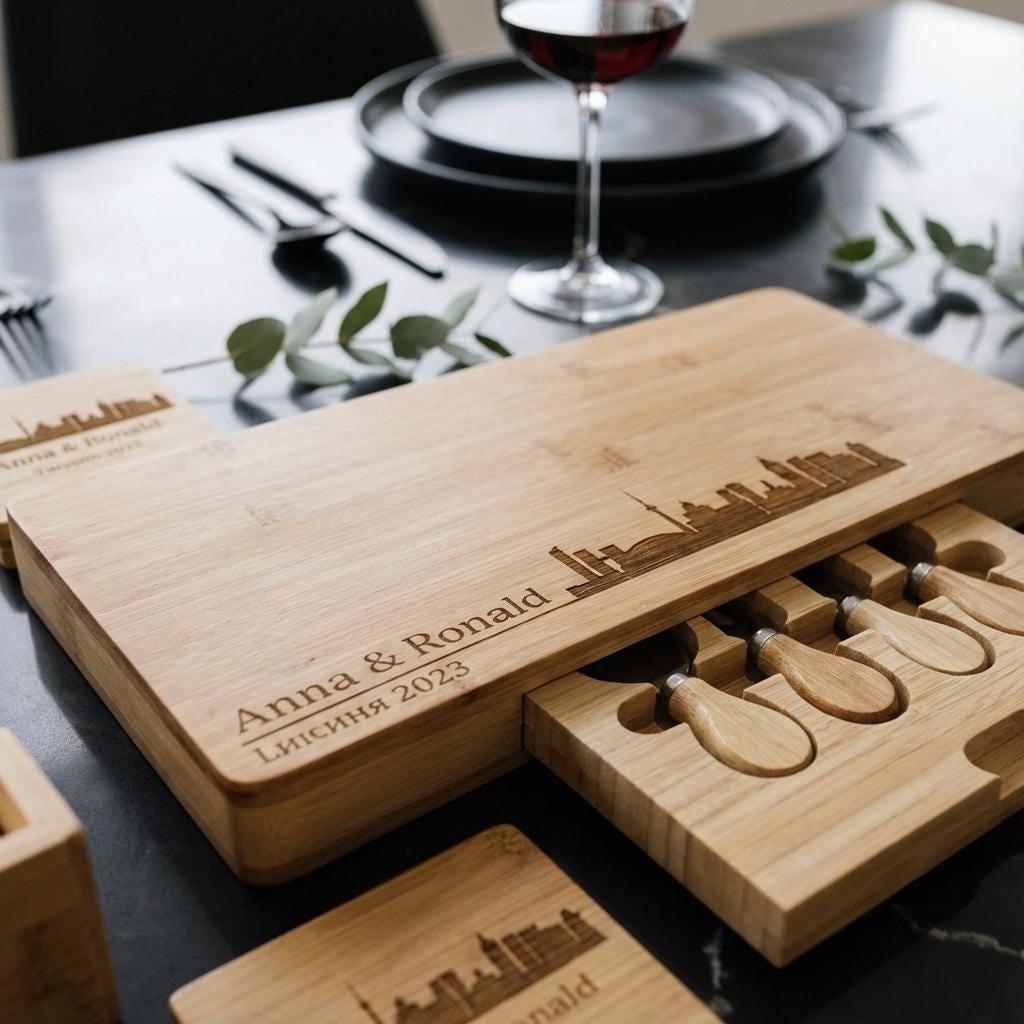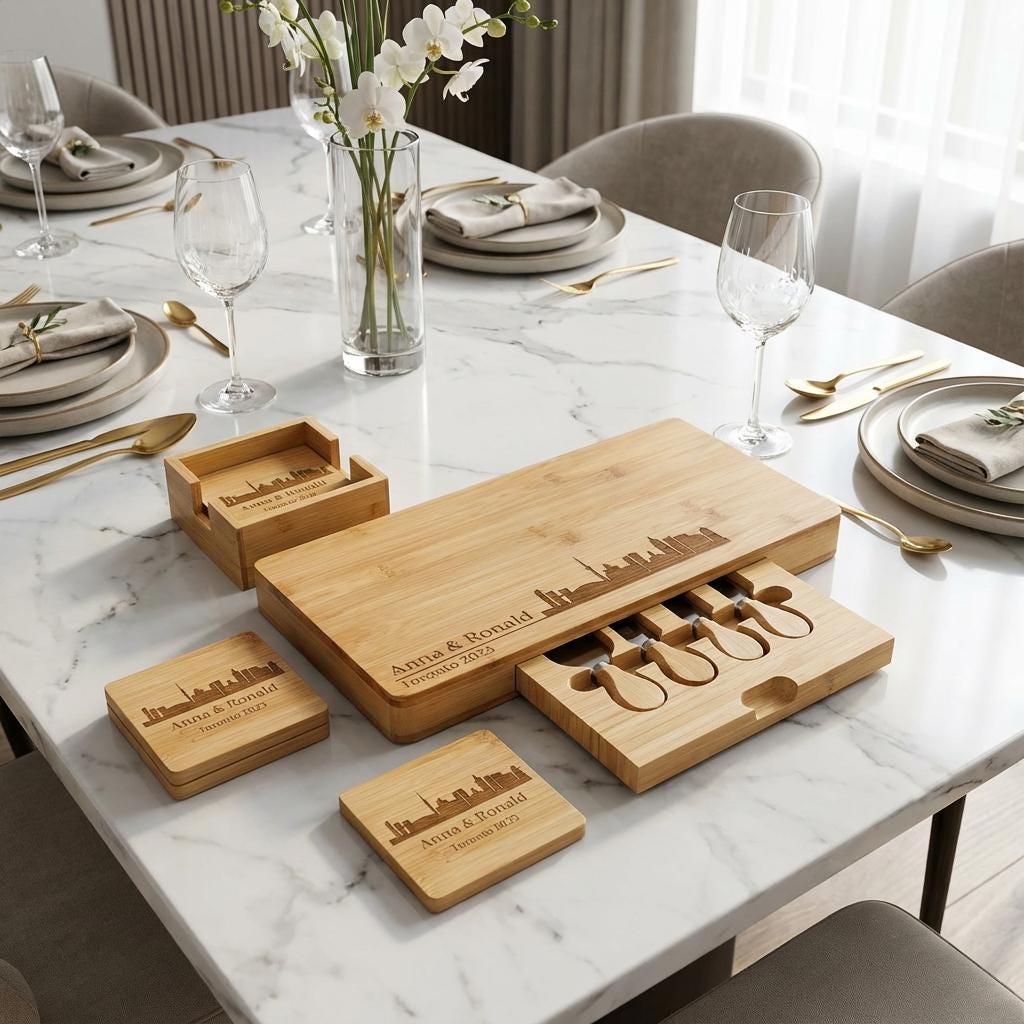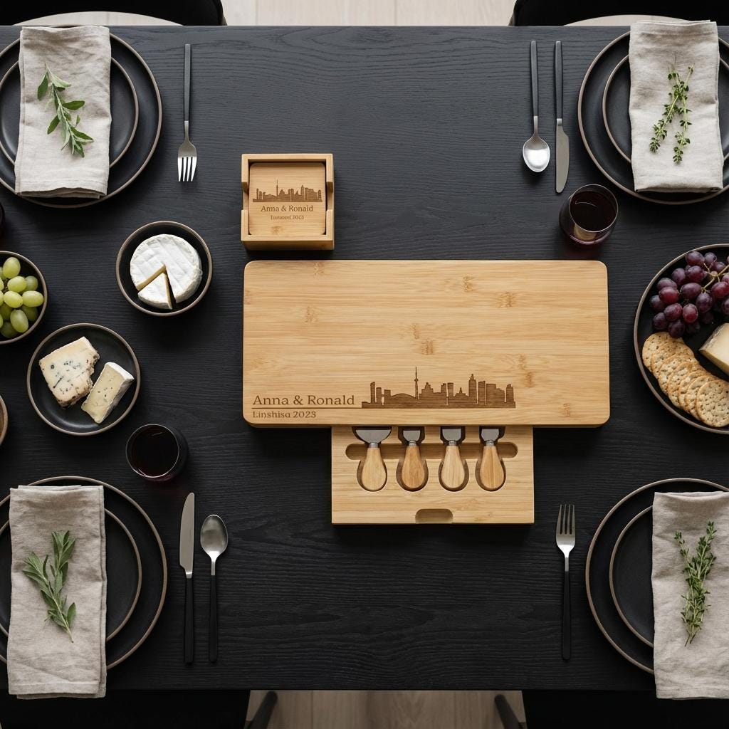 Bring the 6ix home with this personalized Toronto skyline charcuterie board set. Featuring a custom engraved CN Tower design, this bamboo cheese board with knives and matching coasters is the ultimate housewarming gift or wedding present for city lovers.