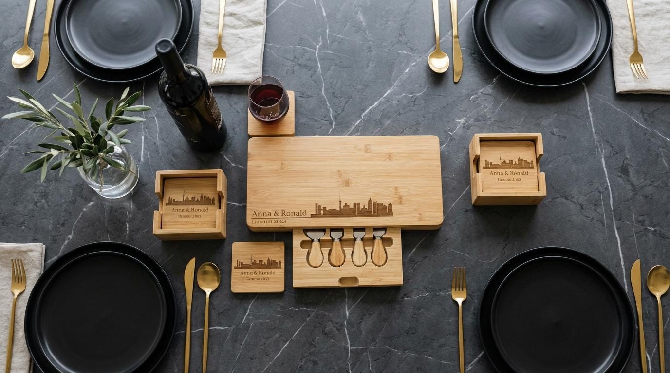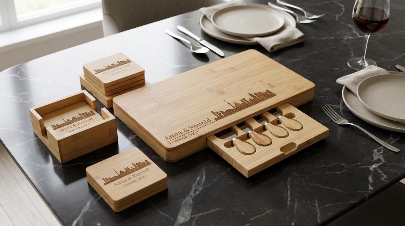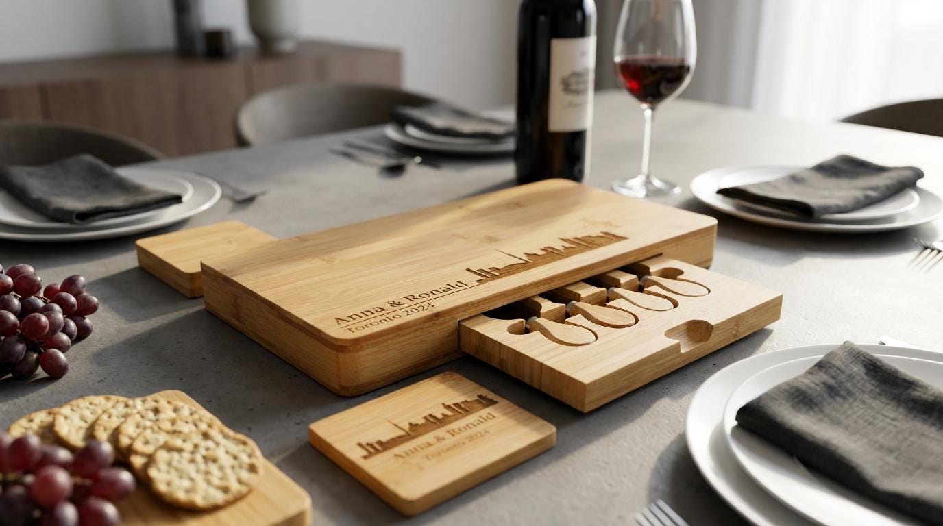 Bring the 6ix home with this personalized Toronto skyline charcuterie board set. Featuring a custom engraved CN Tower design, this bamboo cheese board with knives and matching coasters is the ultimate housewarming gift or wedding present for city lovers.