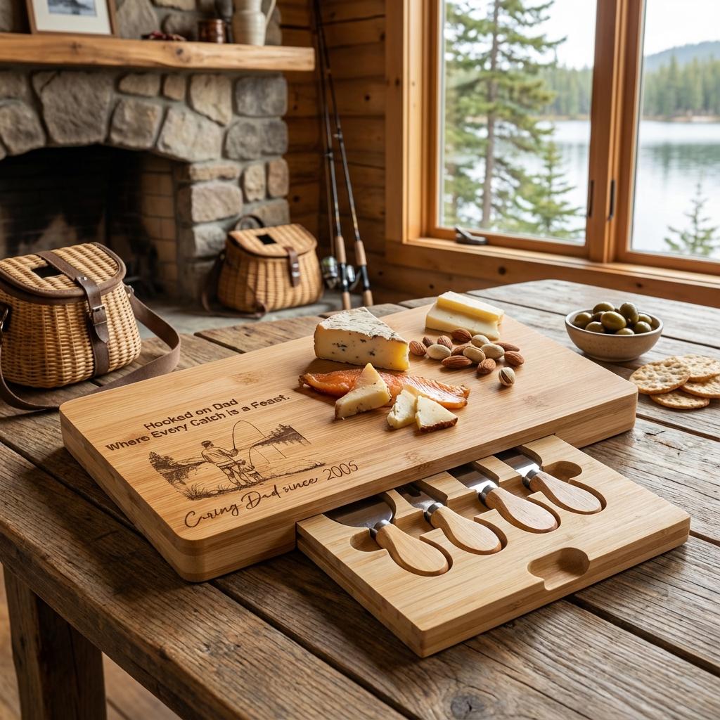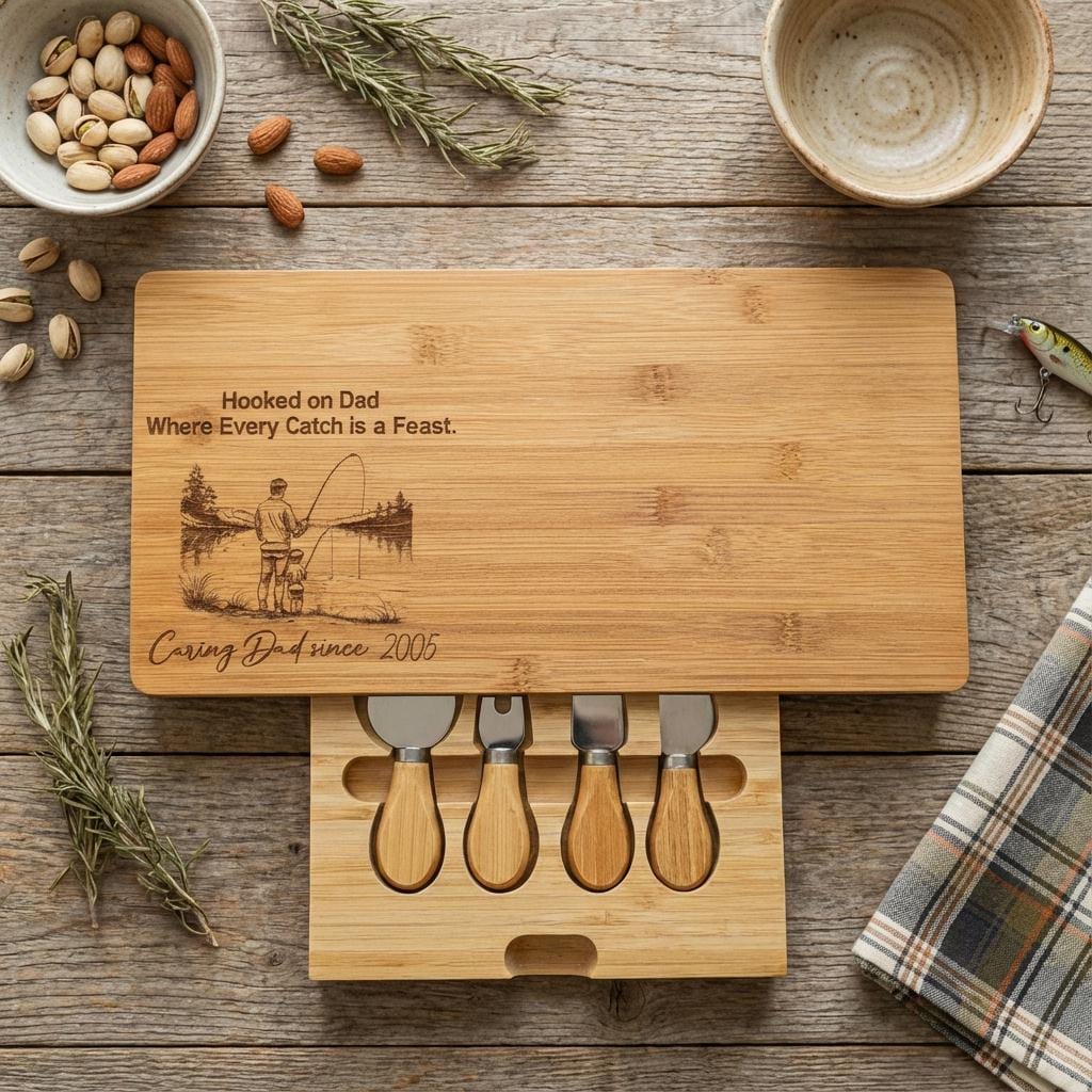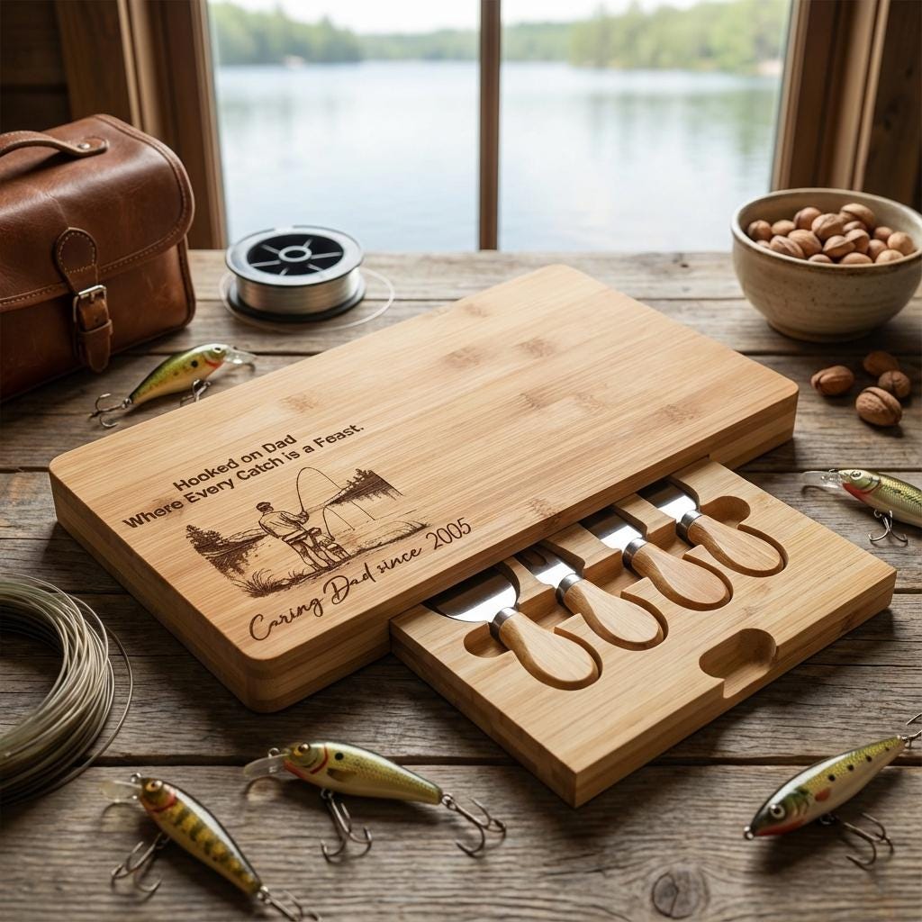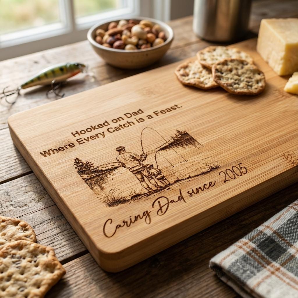 Celebrate the timeless bond between father and child with a tribute to your favorite fishing buddy. Whether you are swapping stories about the "one that got away" or serving up snacks at the cabin, this custom bamboo board is designed to bring those cherished memories to the table.