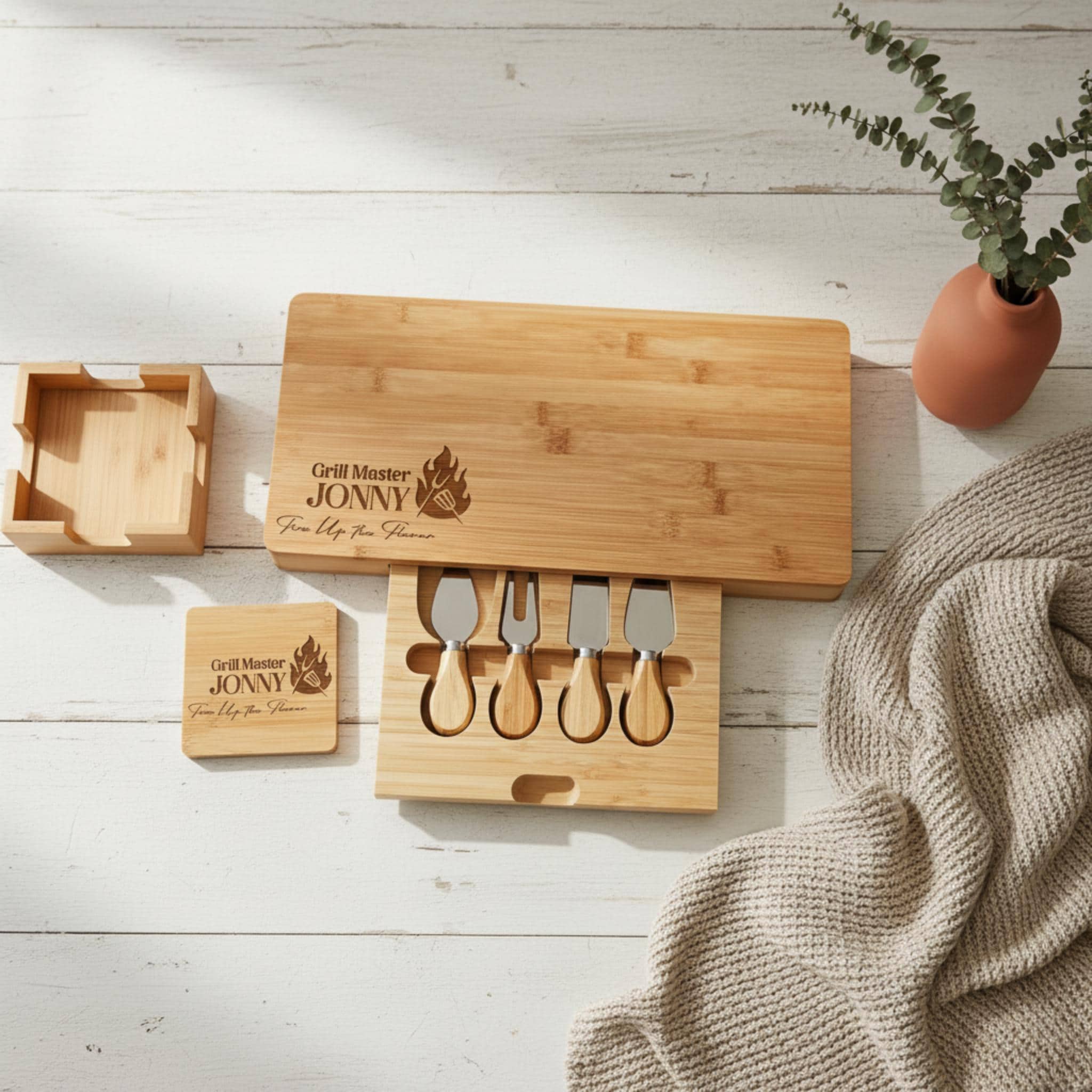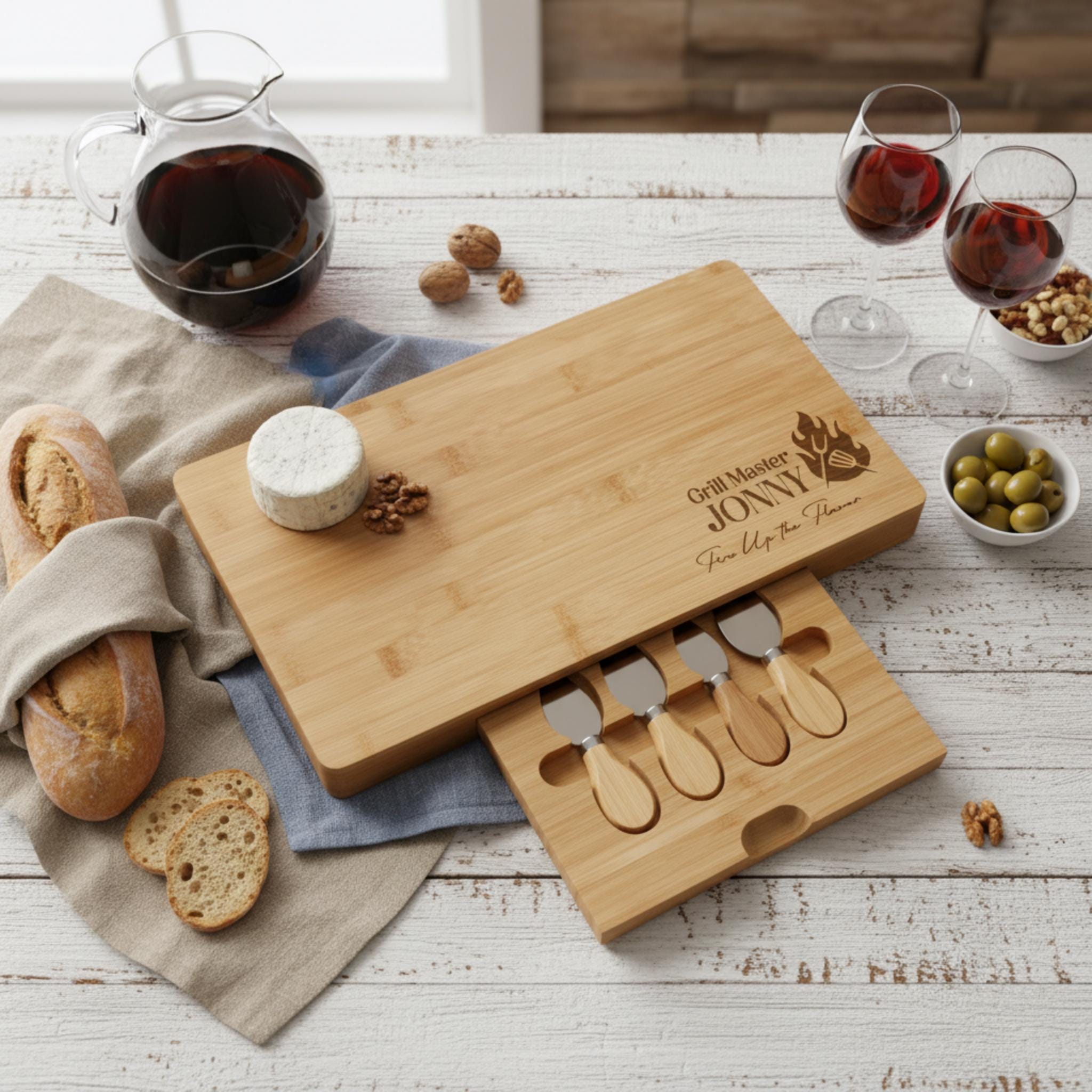 Grill Master Must-Have: Personalized Bamboo Cheeseboard with Integrated Utensil Drawer