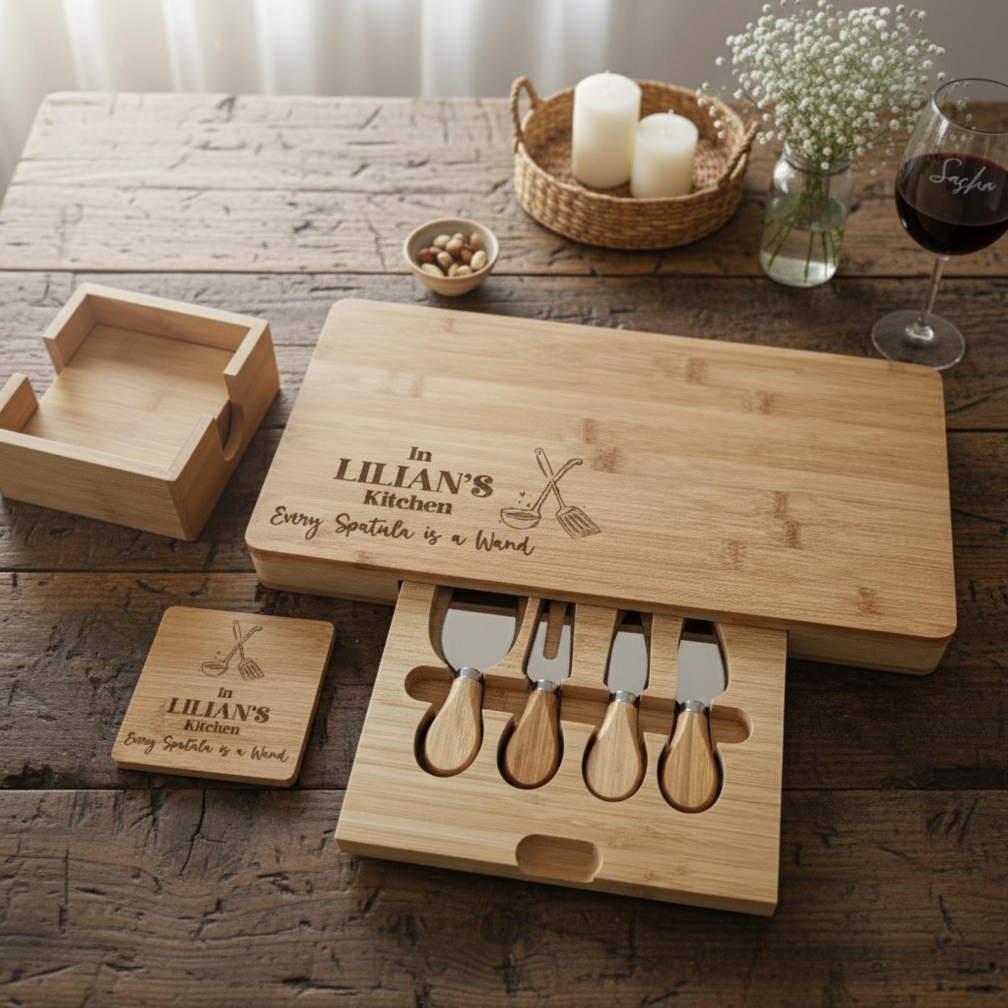 A Timeless Gift for the Women Who Inspire Us Handcrafted from sustainably sourced bamboo, this cheeseboard is more than just a serving piece—it’s a keepsake that brings a touch of love to their cherished space. The integrated utensil drawer ensures their essential tools are always within reach, helping them create delightful meals and memories that last a lifetime. Every detail—from the natural bamboo finish to the delicate personalized engraving—makes this piece as unique and wonderful as the women who inspire us.