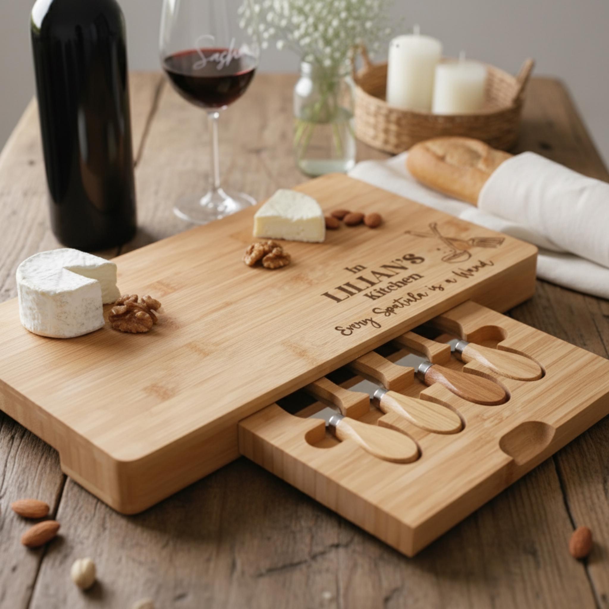 Cherished Moments: Personalized Bamboo Cheeseboard with Utensil Drawer