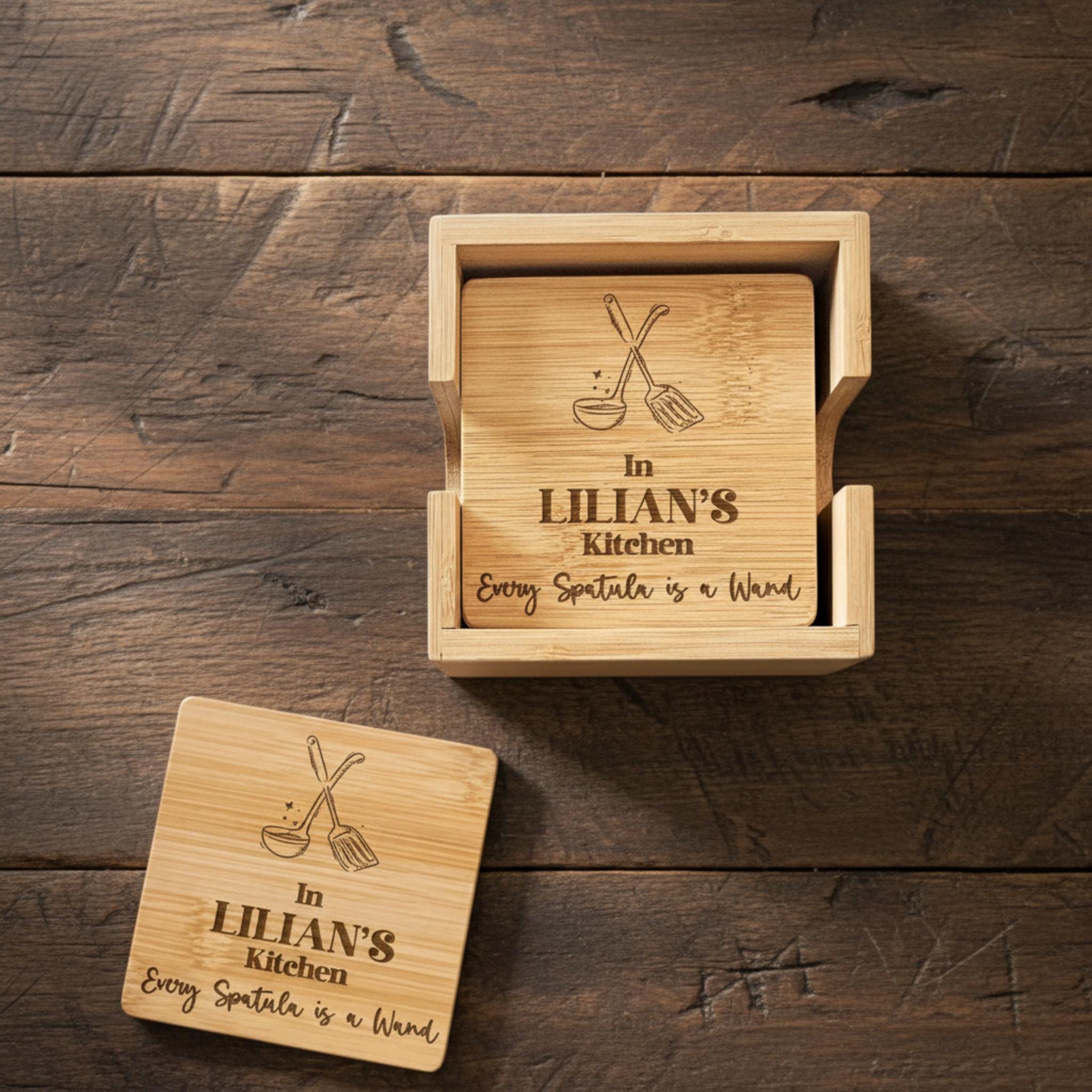 Coaster Set: A charming 5-piece set of personalized bamboo coasters with elegant engraving—perfect for enjoying tea, coffee, or those special family gatherings.
