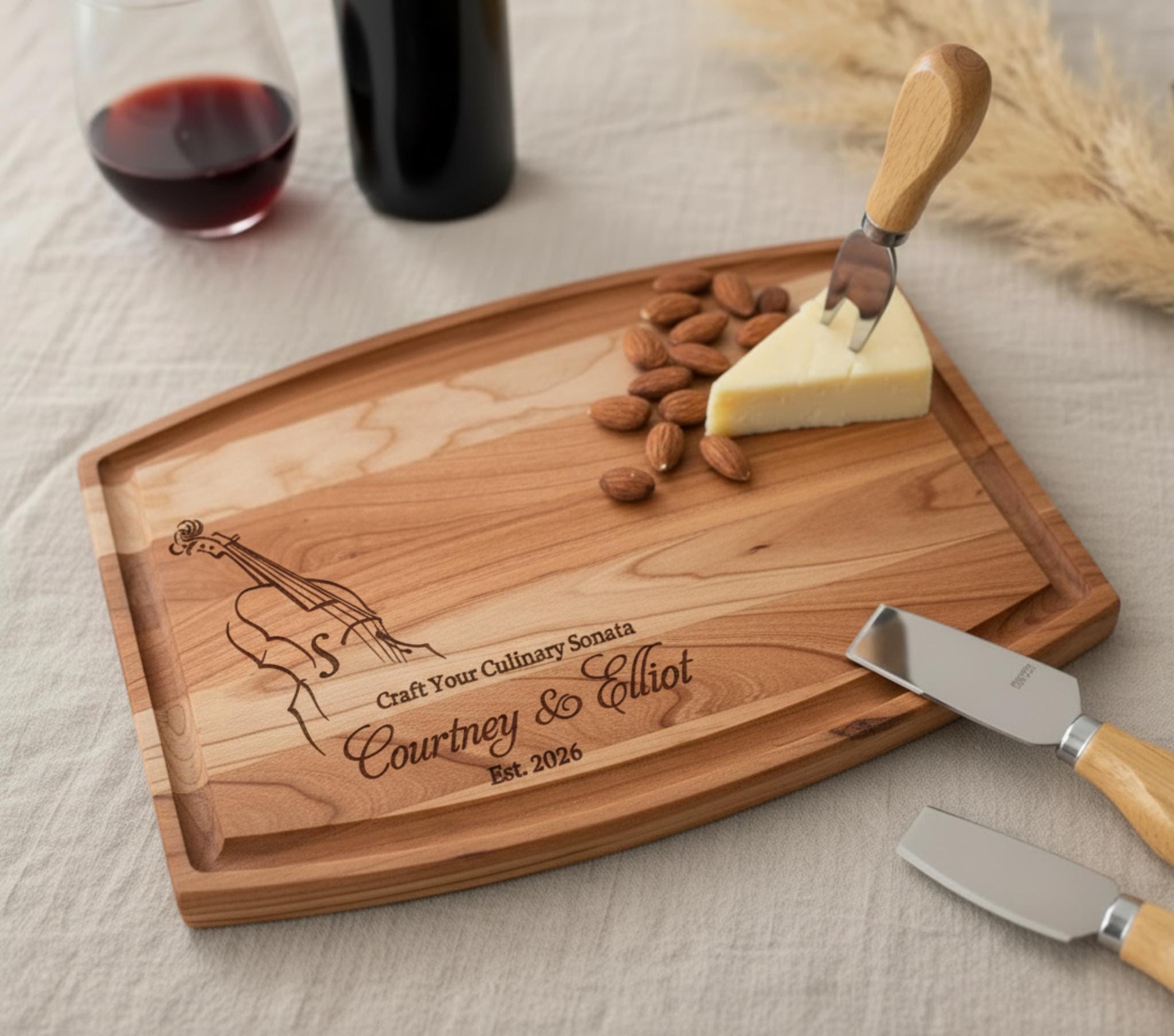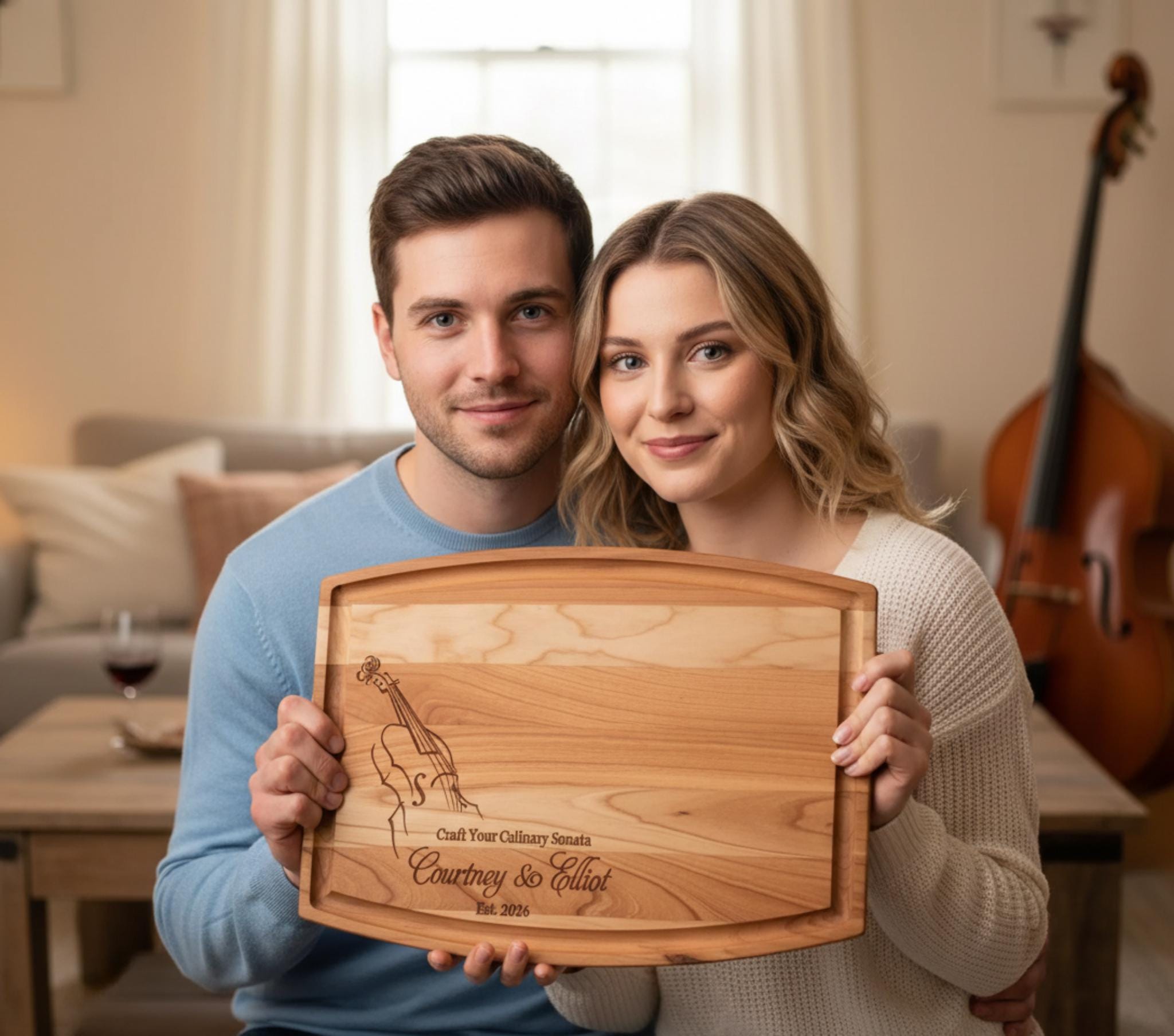 Step into a harmonious embrace with our enchanting Musical Couple cutting board. Reminiscent of shared melodies and cherished moments, this unique piece celebrates your passion for music and the love that you create together. Beautifully engraved with a violin, the phrase "Craft Your Culinary Sonata," and your names and special date, it’s a tribute to your shared rhythm in life.
