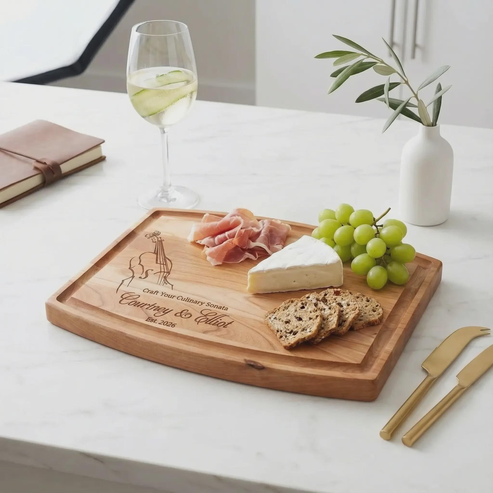 Compose a masterpiece in the kitchen with this personalized violin cutting board. Featuring the clever 'Craft Your Culinary Sonata' engraving, this cherry wood charcuterie board is the ultimate wedding gift for musicians, orchestra teachers, or string players..