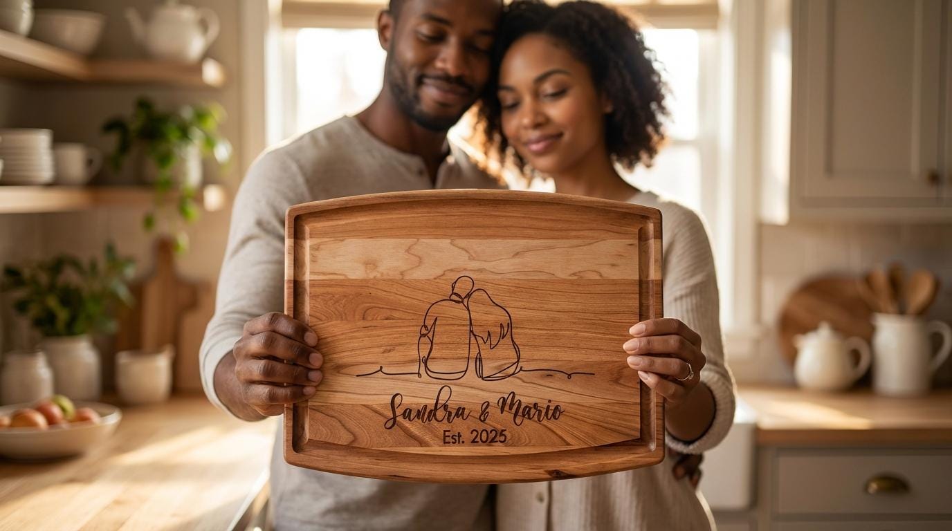 Handcrafted with precision and heartfelt care, each board celebrates contemporary love and the cherished memories that define it. Whether used as a functional kitchen accessory or displayed as a keepsake, it adds an elegant, artistic touch to any space.