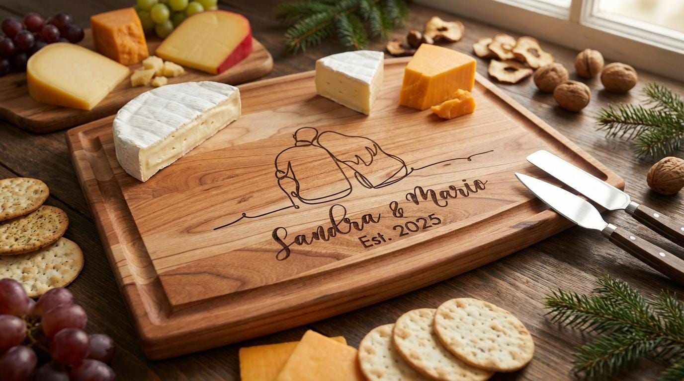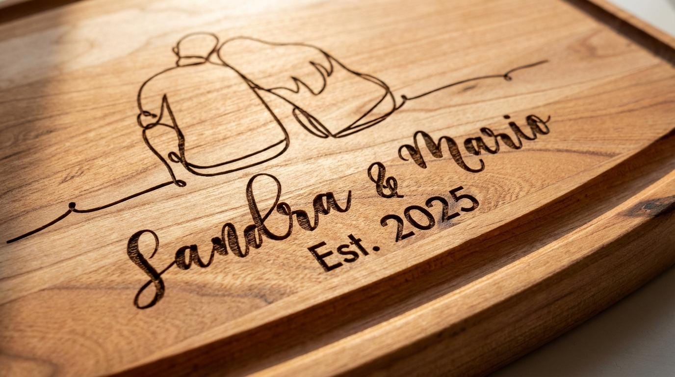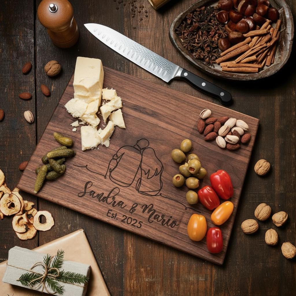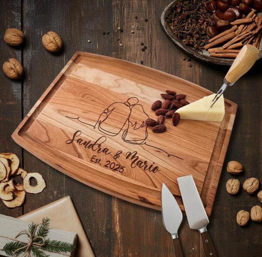 This personalized cutting board transforms your kitchen into a gallery of modern romance. Adorned with delicate line art of a couple and custom engraved with your names and a significant year, it is a timeless tribute to your shared journey.