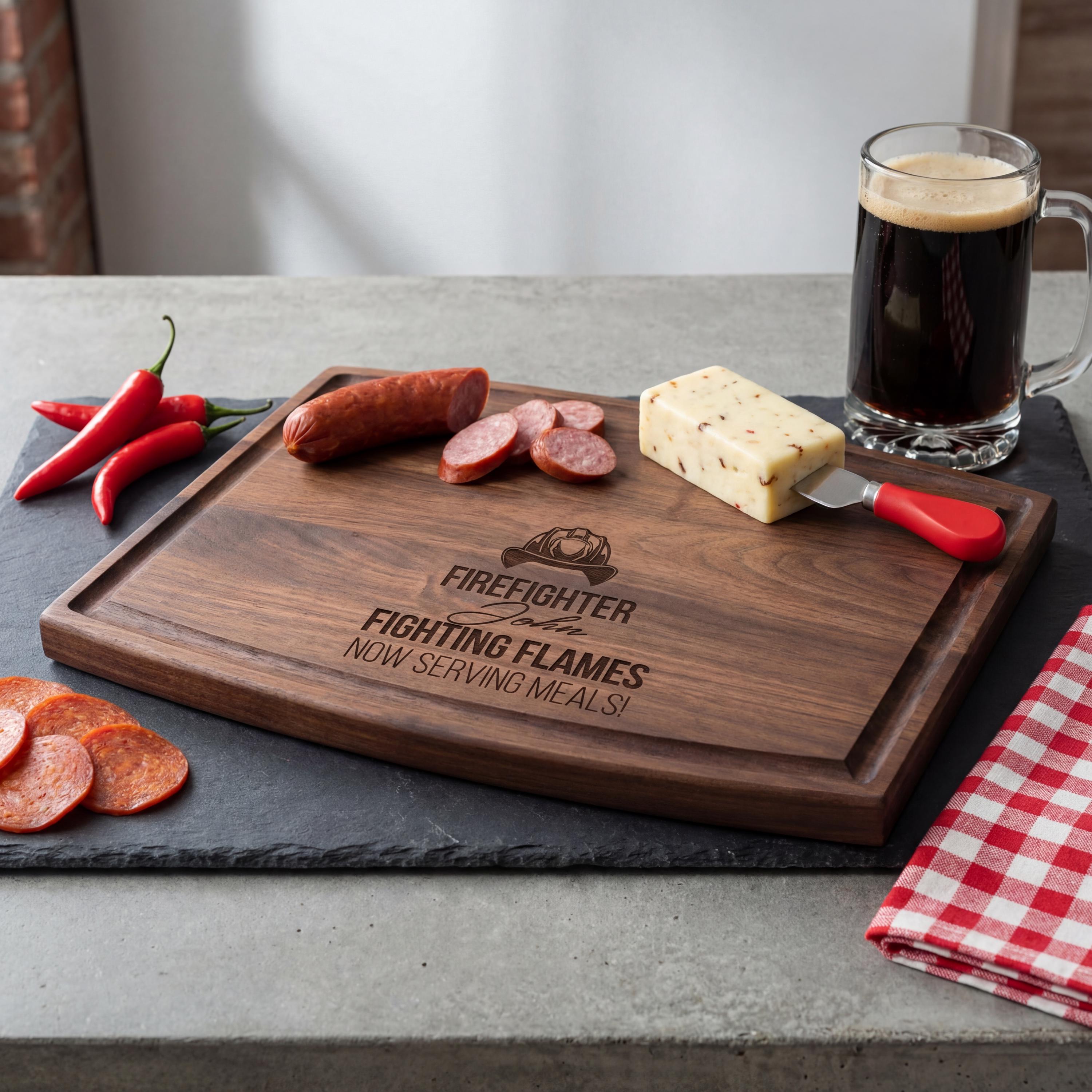 Honor the hero in the kitchen with this personalized firefighter cutting board. Featuring the fun 'Fighting Flames, Now Serving Meals' engraving, this walnut charcuterie board is the ultimate firefighter retirement gift or station chef present.