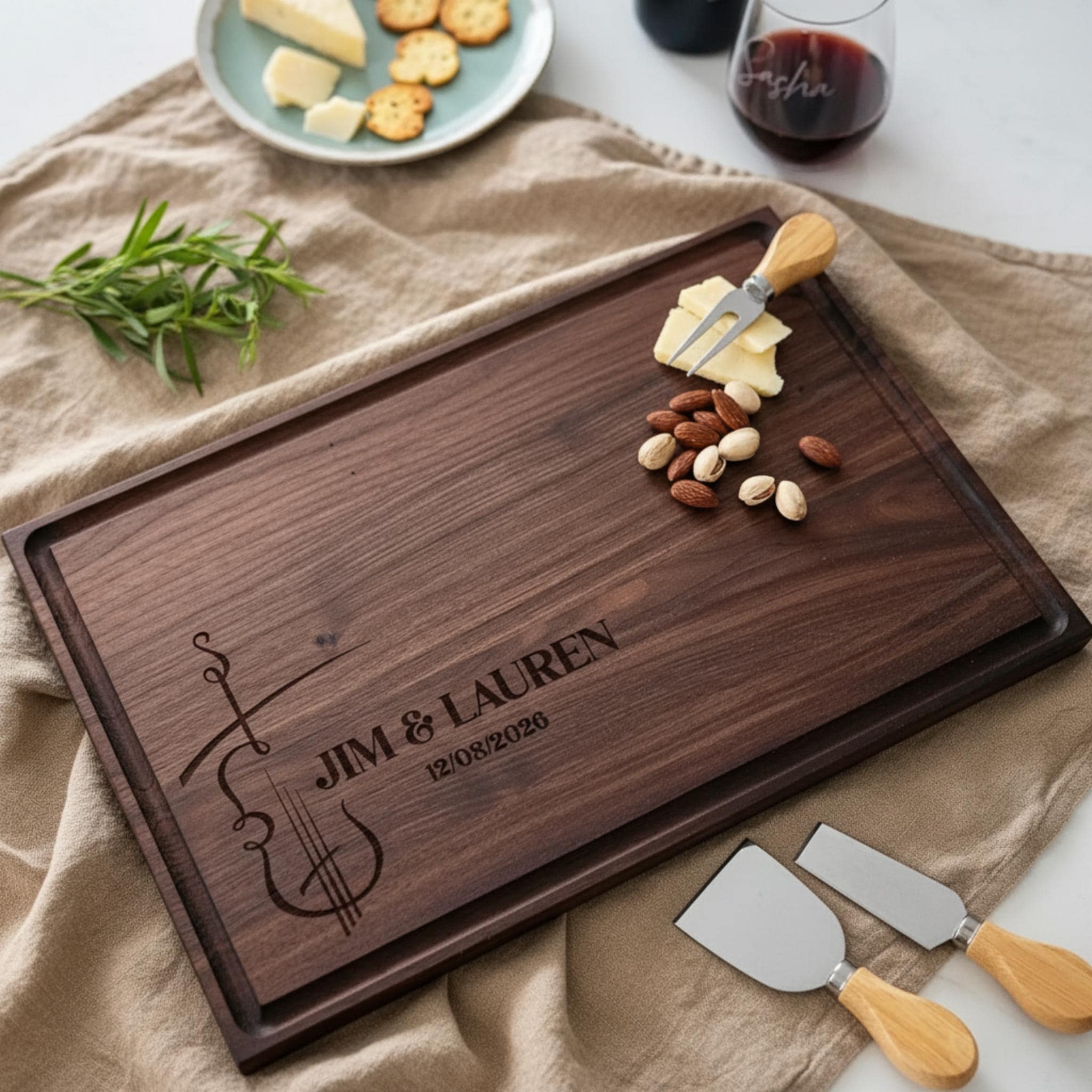 Step into a harmonious embrace with our captivating couple's violin-themed cutting board. Evoking the passion of music-loving duos, this unique piece transforms your kitchen into a stage of romance. Beautifully engraved with a graceful violin, the couple's custom names, and a special date, it plays a timeless melody of love.
