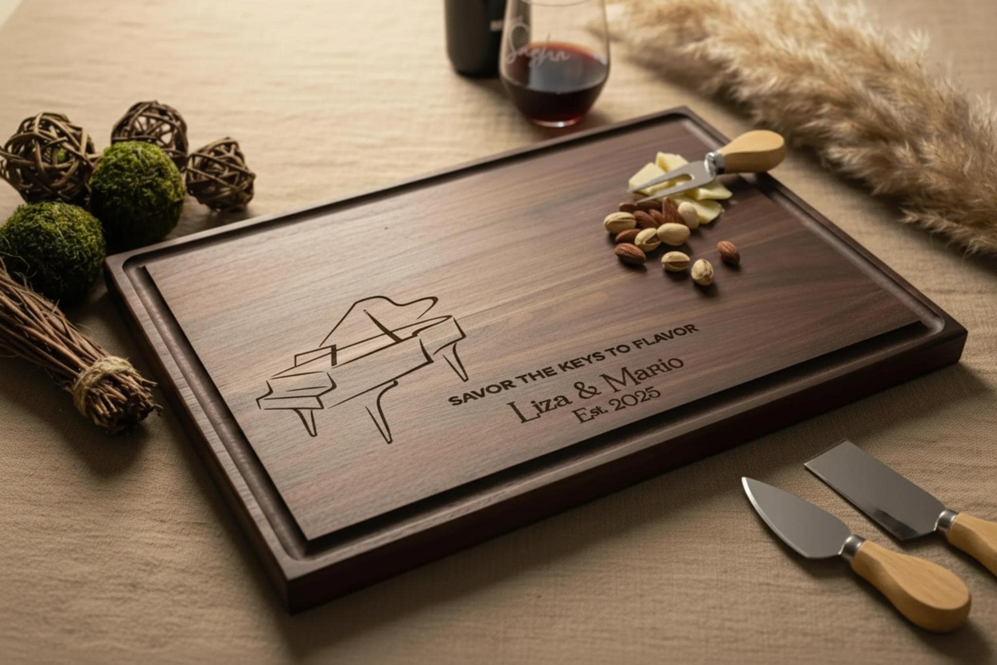 Step into a harmonious embrace with our exquisite couple's piano cutting board. Reminiscent of intimate evenings filled with soothing piano melodies, this unique piece transforms your kitchen into a stage for romance and culinary art. Beautifully engraved with an elegant piano, the couple's custom names, a special year, and the clever phrase "savor the keys to flavor," it celebrates the duet of passion and taste shared by music-loving couples.