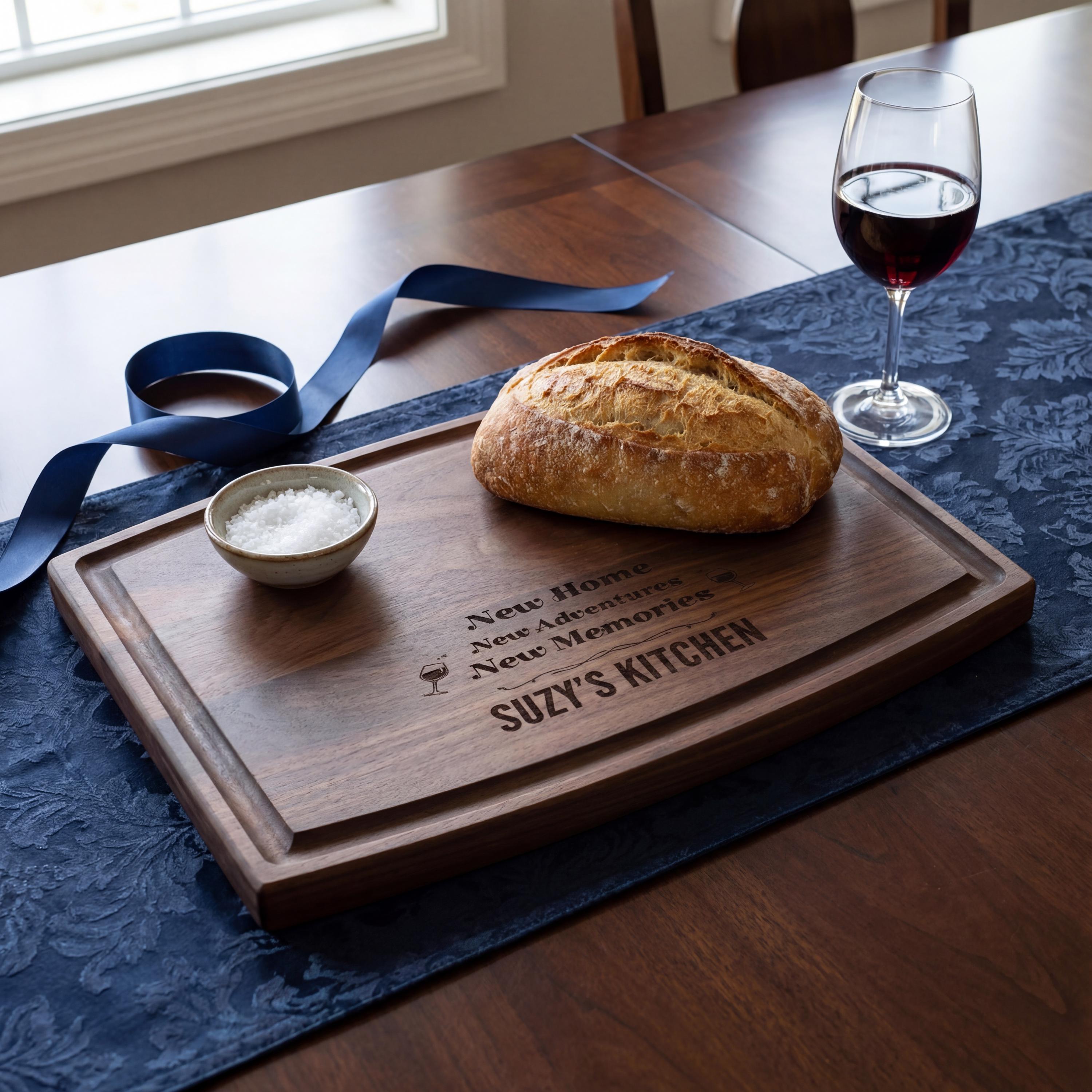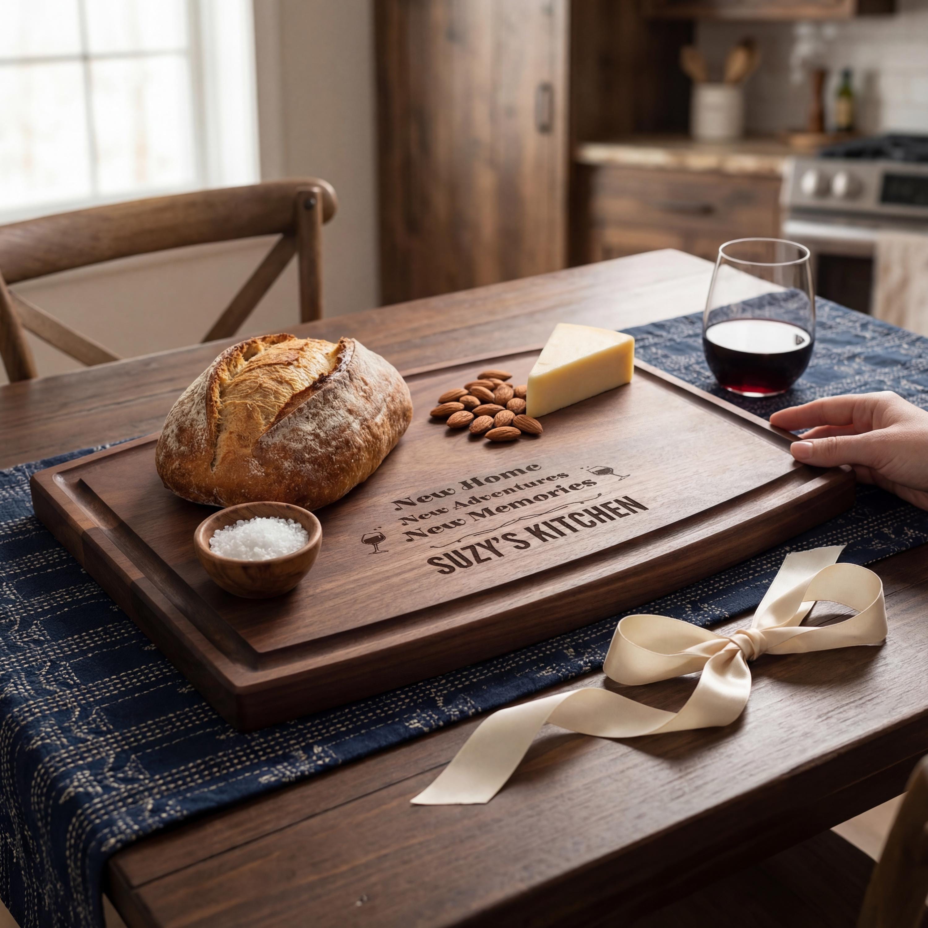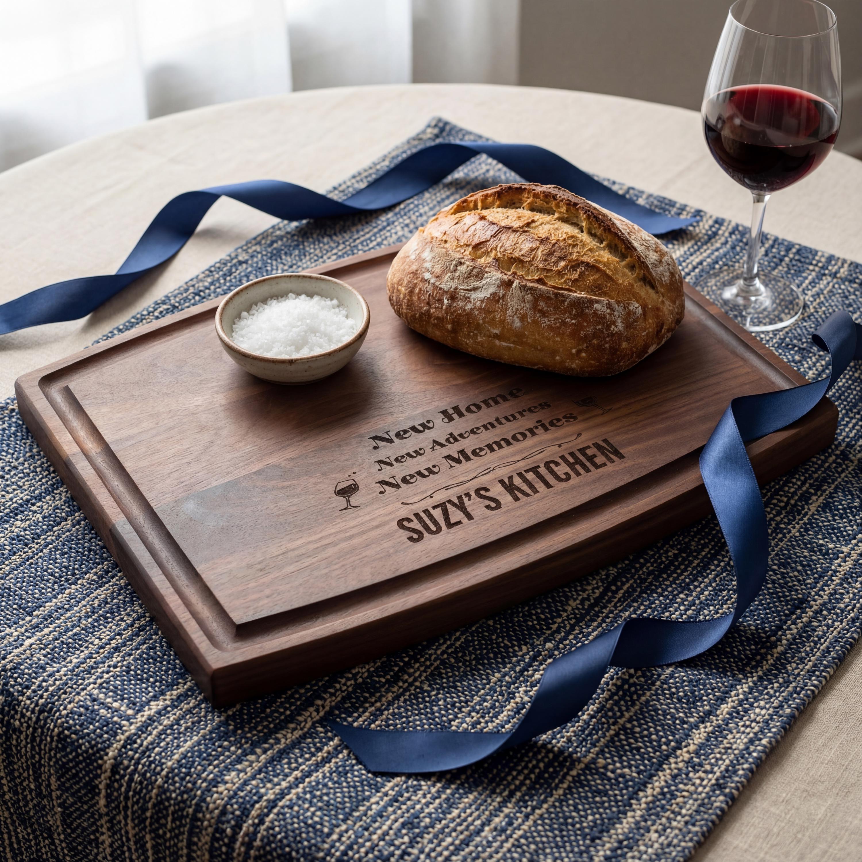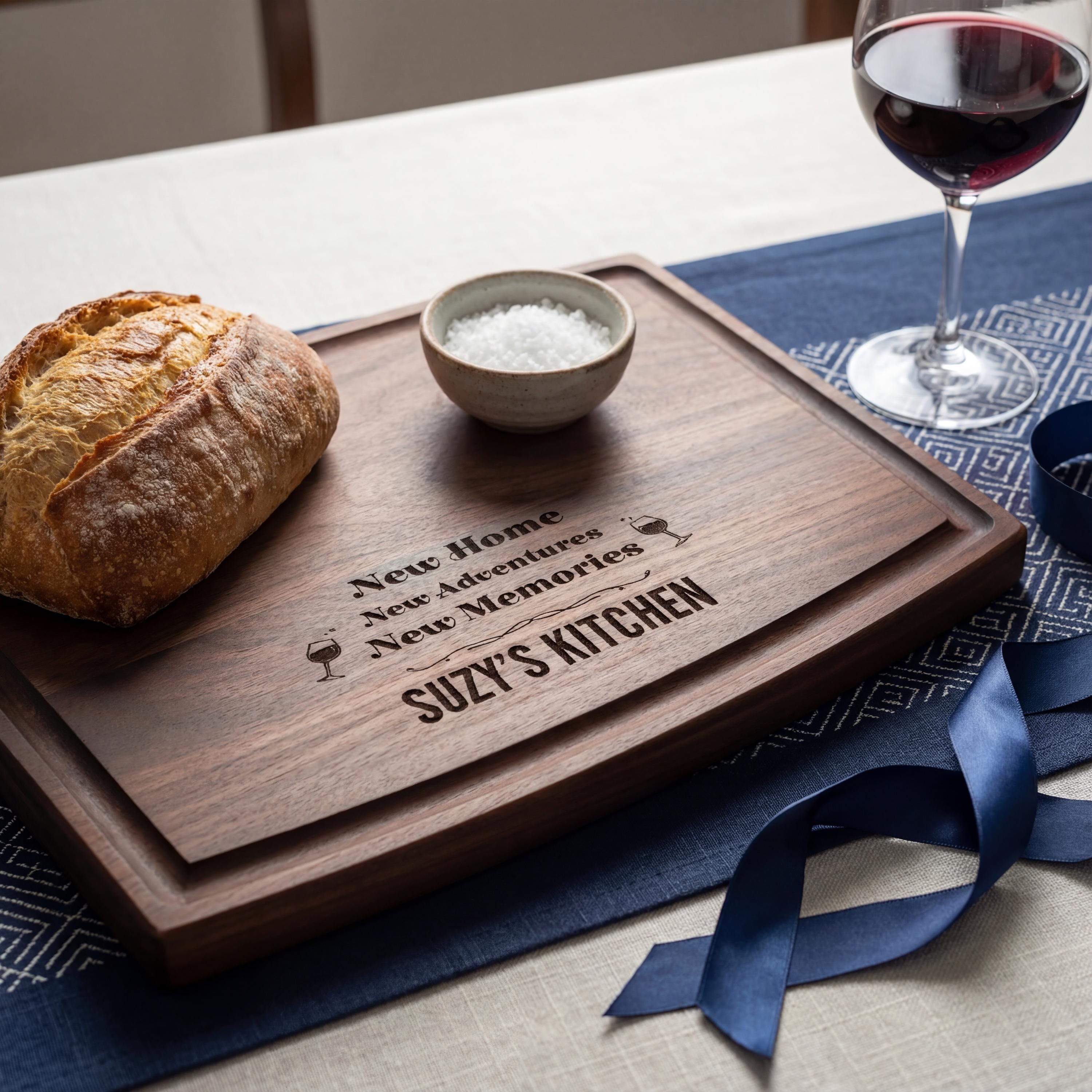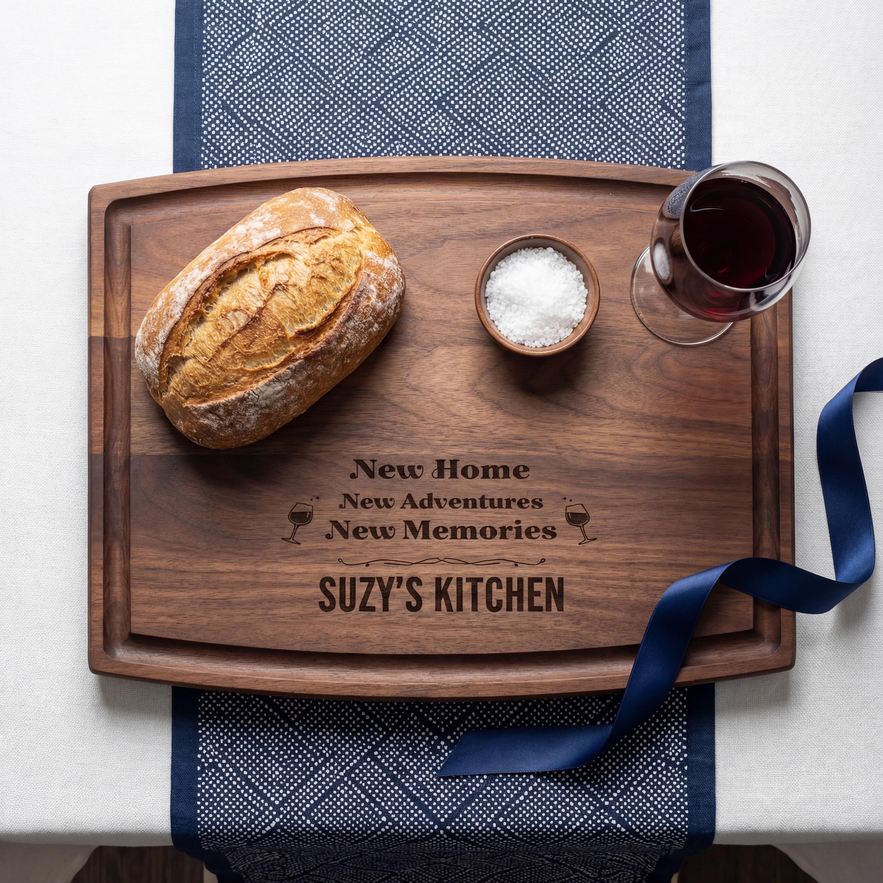 Celebrate their fresh start with this personalized new home cutting board. Featuring the inspiring 'New Adventures, New Memories' engraving and a deep juice groove, this walnut charcuterie board is the ultimate housewarming gift or Realtor closing present.