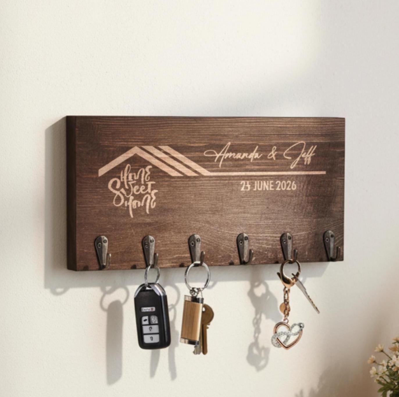 Welcome guests with warmth and charm using our Personalized Key Hanger, Home Sweet Home. This custom-engraved wall key holder brings a rustic touch to your entryway, featuring an elegant design inspired by a cozy cottage or cabin. The timeless engraving displays the phrase "Home Sweet Home," accompanied by your personalized family name, creating a unique and heartfelt accent for any home.