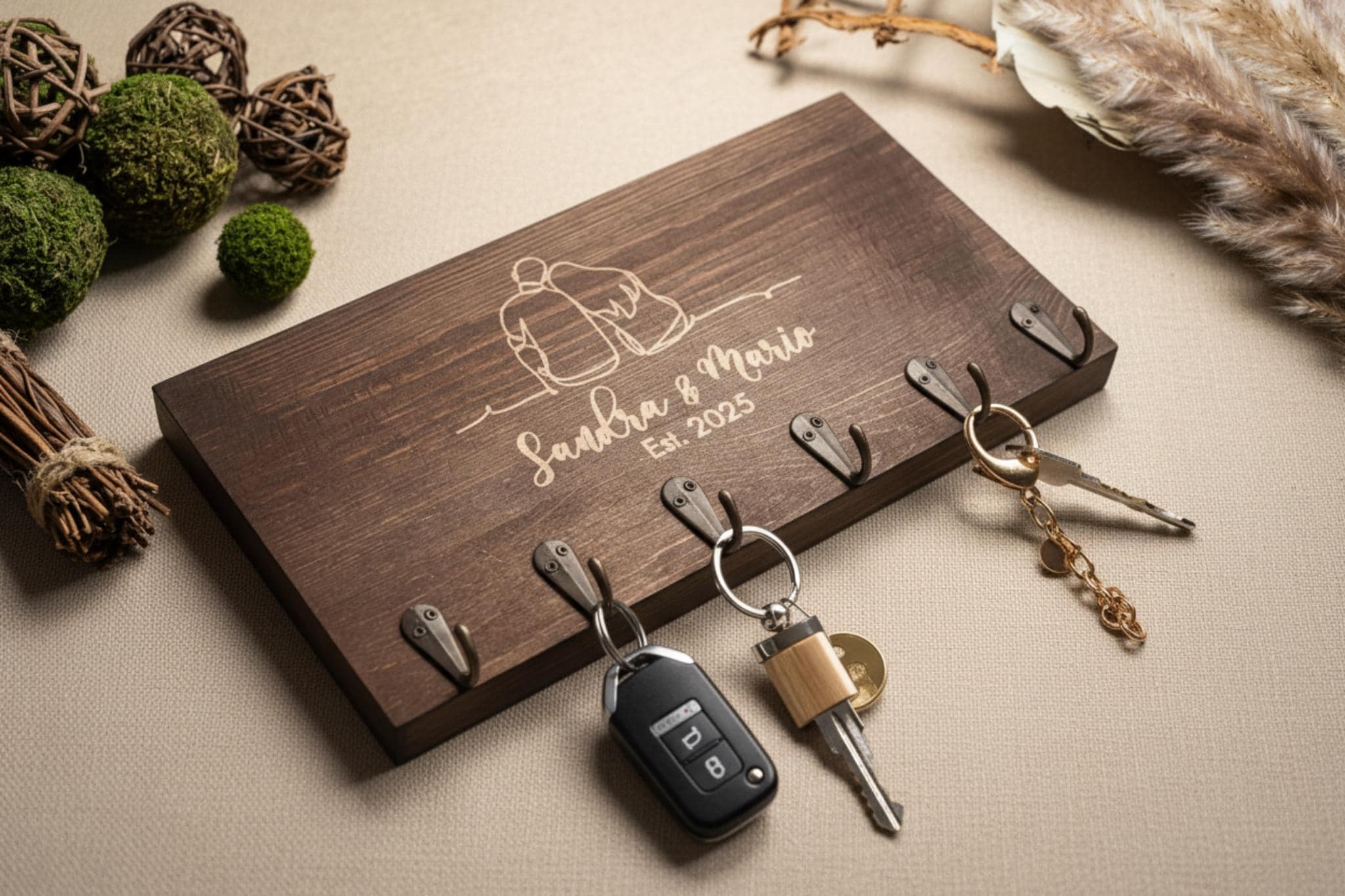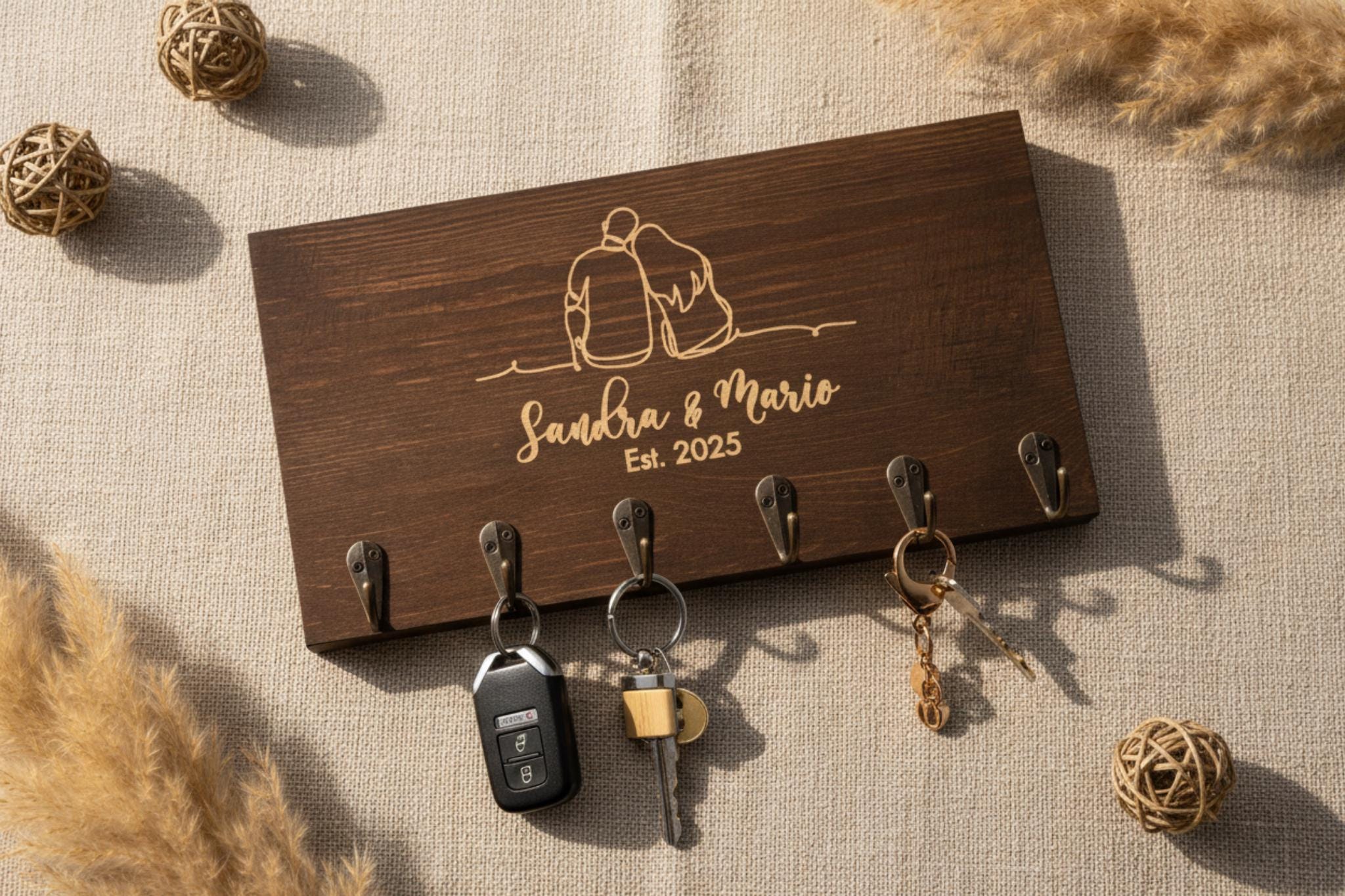 This Personalized Key Hanger For Wall welcomes guests with a celebration of love and unity. Infused with rustic charm and heartfelt elegance, it features a beautifully hand-drawn engraving of a couple sitting side by side—a timeless symbol of togetherness and shared journeys.