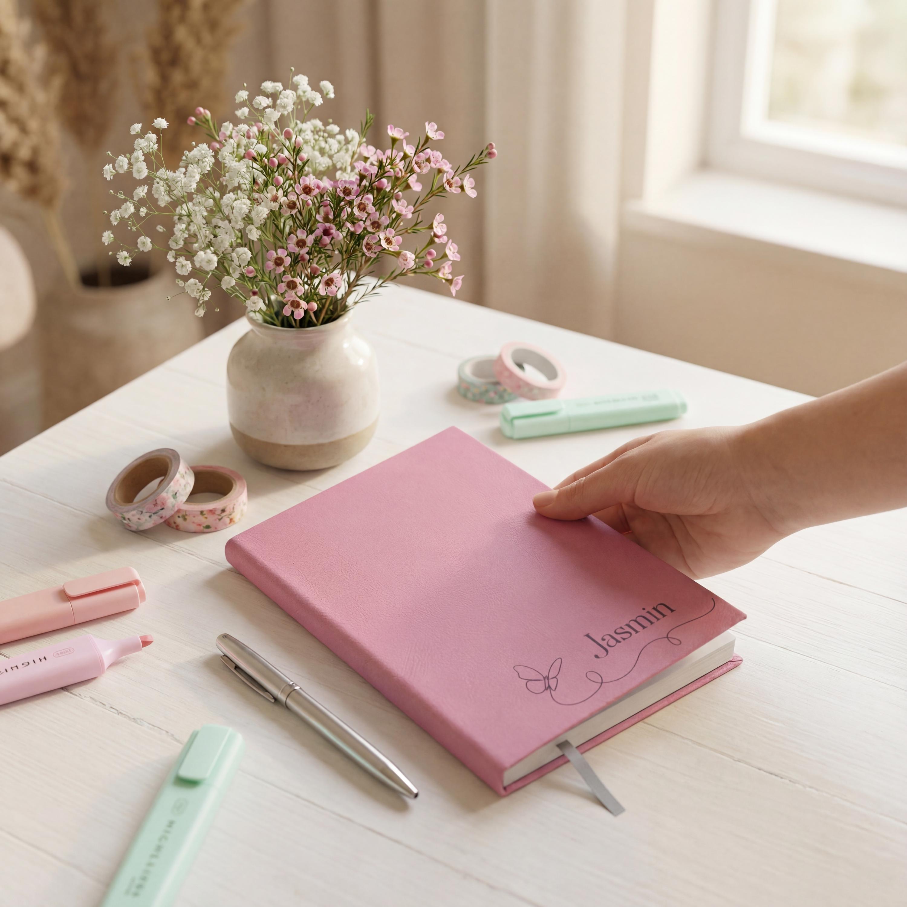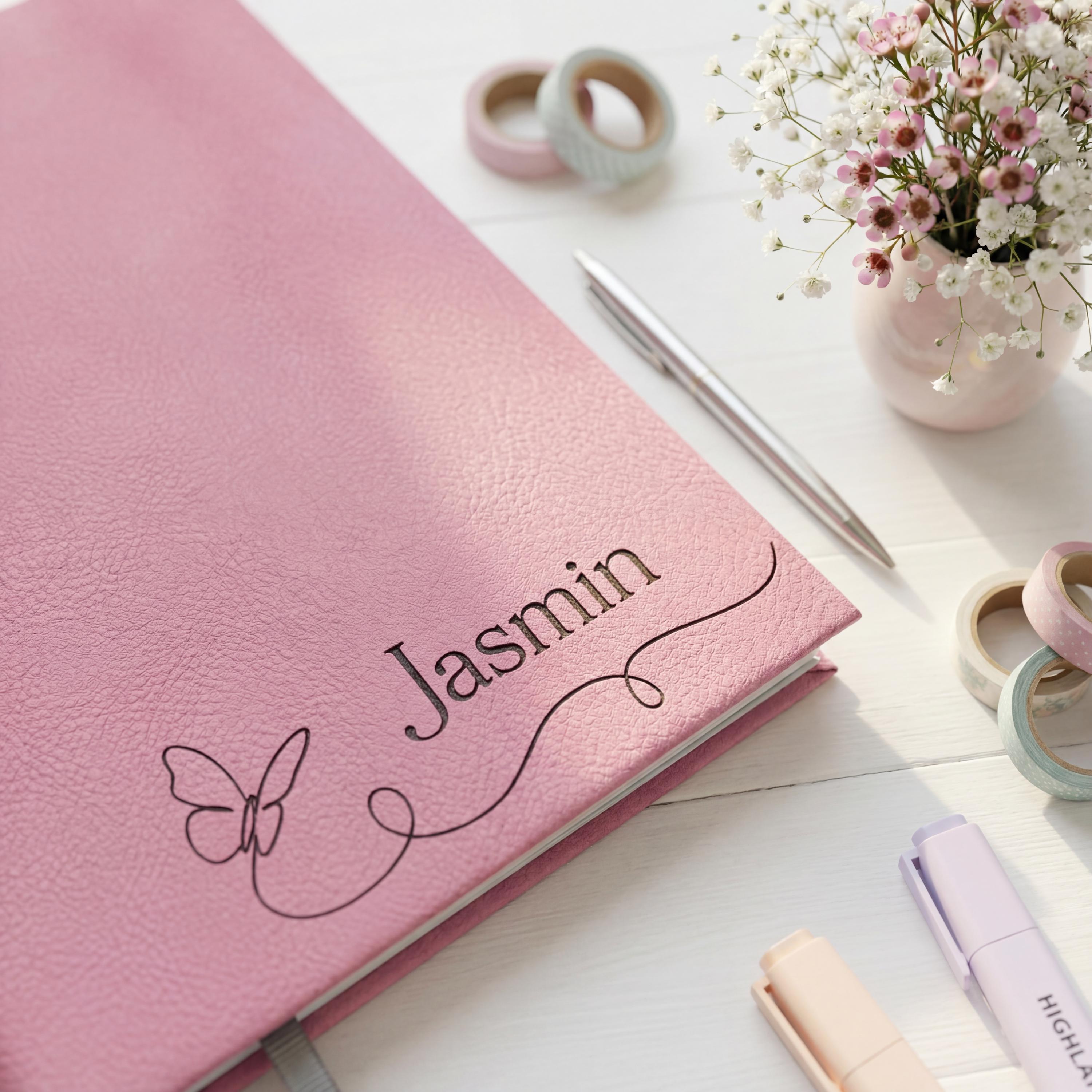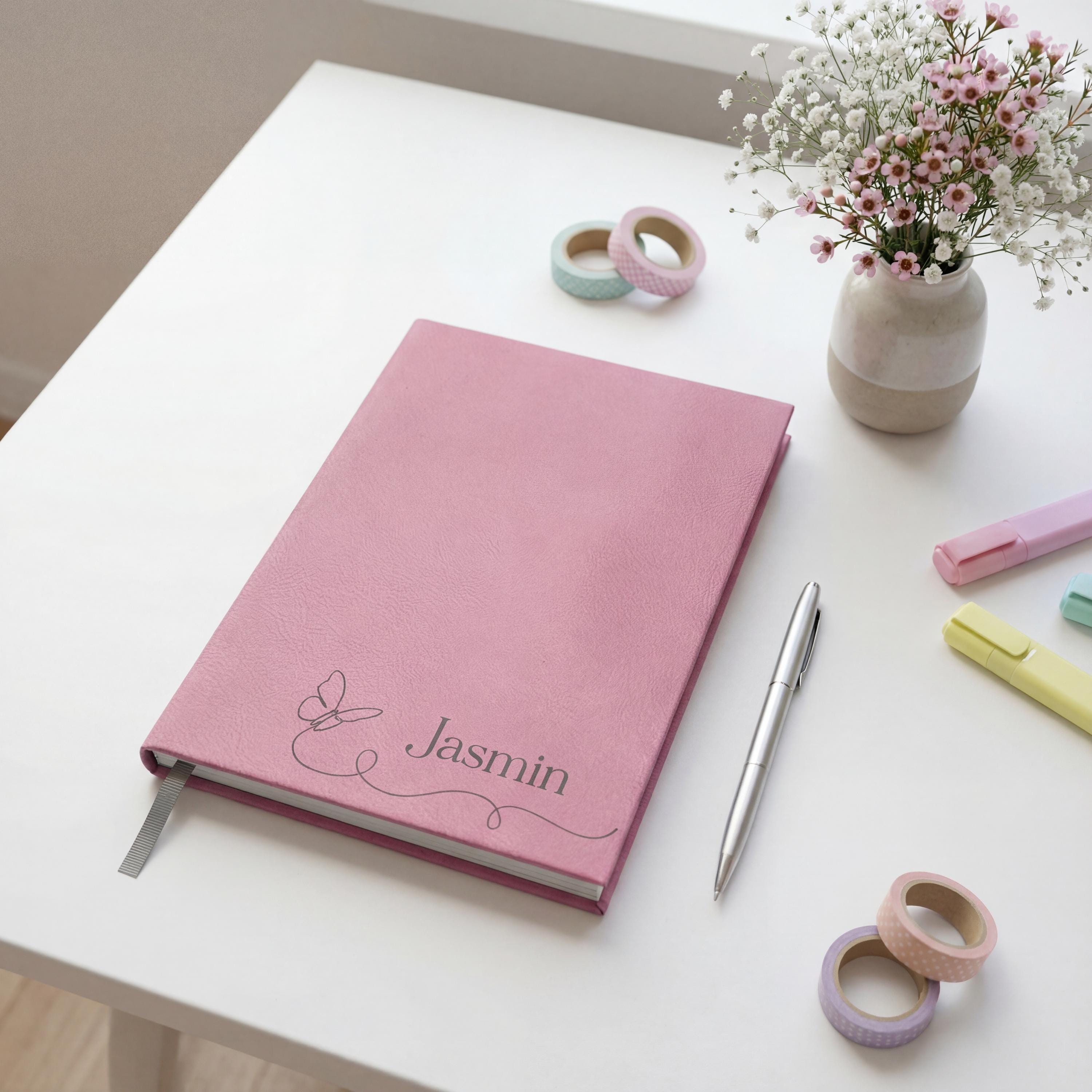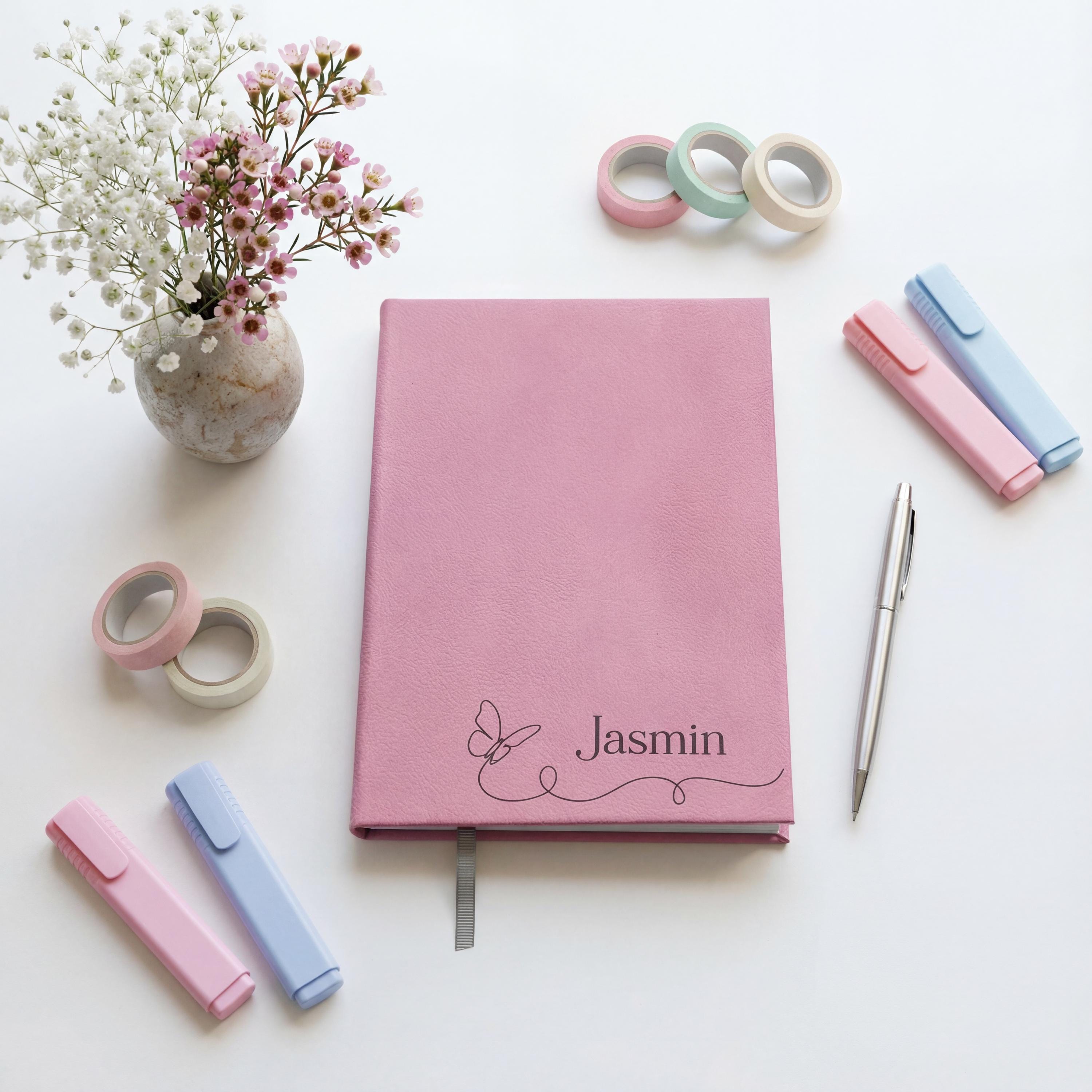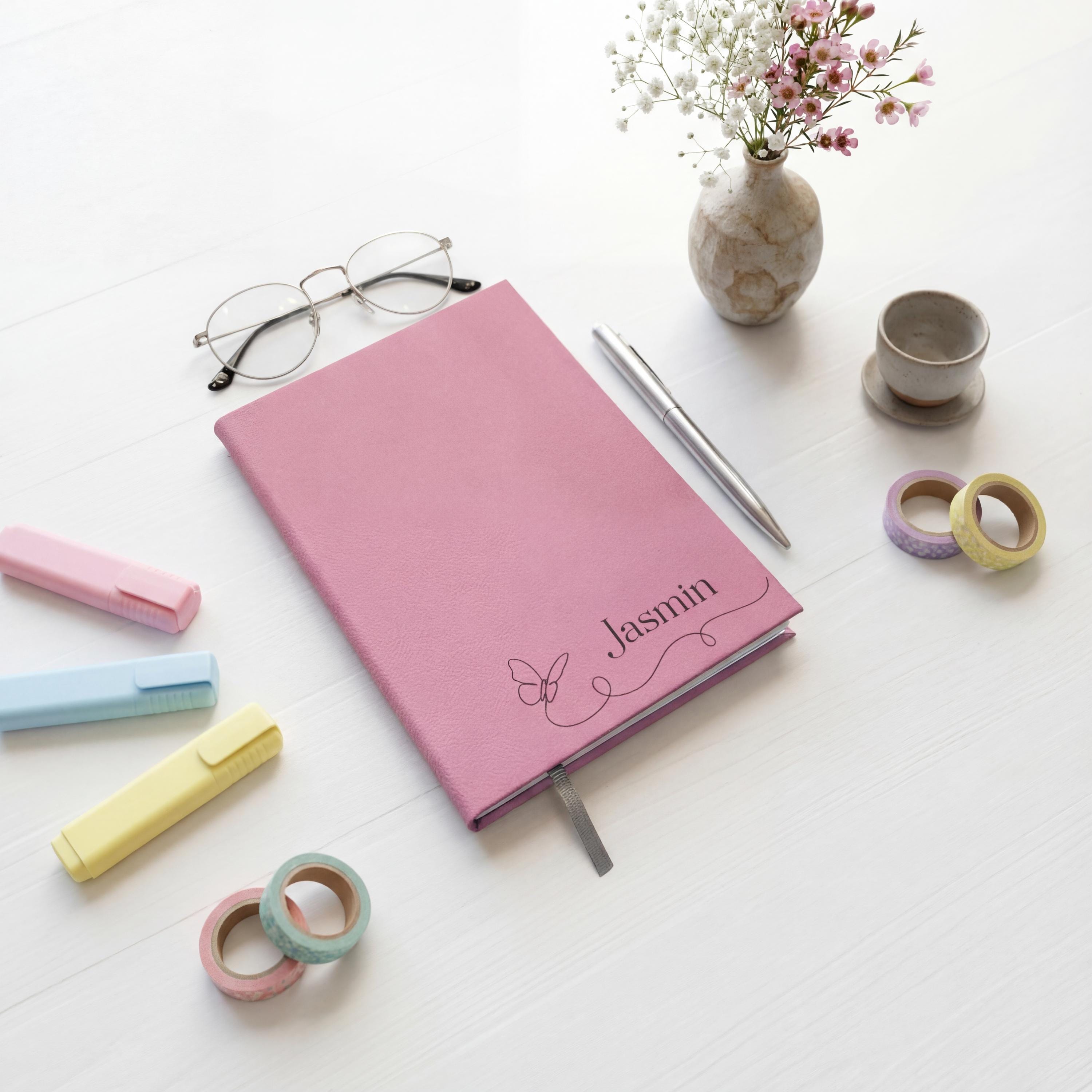 Let her thoughts take flight with this personalized butterfly journal. Featuring a delicate custom engraving and soft pink cover, this vegan leather notebook is the ultimate birthday gift for teen girls, wellness diary, or stationery gift.