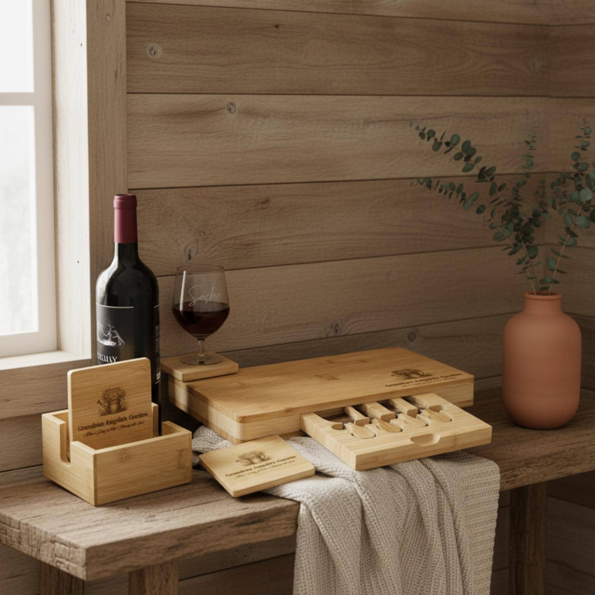 Coaster Set: A 5-piece set of personalized bamboo coasters with elegant engraving—perfect for enjoying tea, coffee, or those special family gatherings.