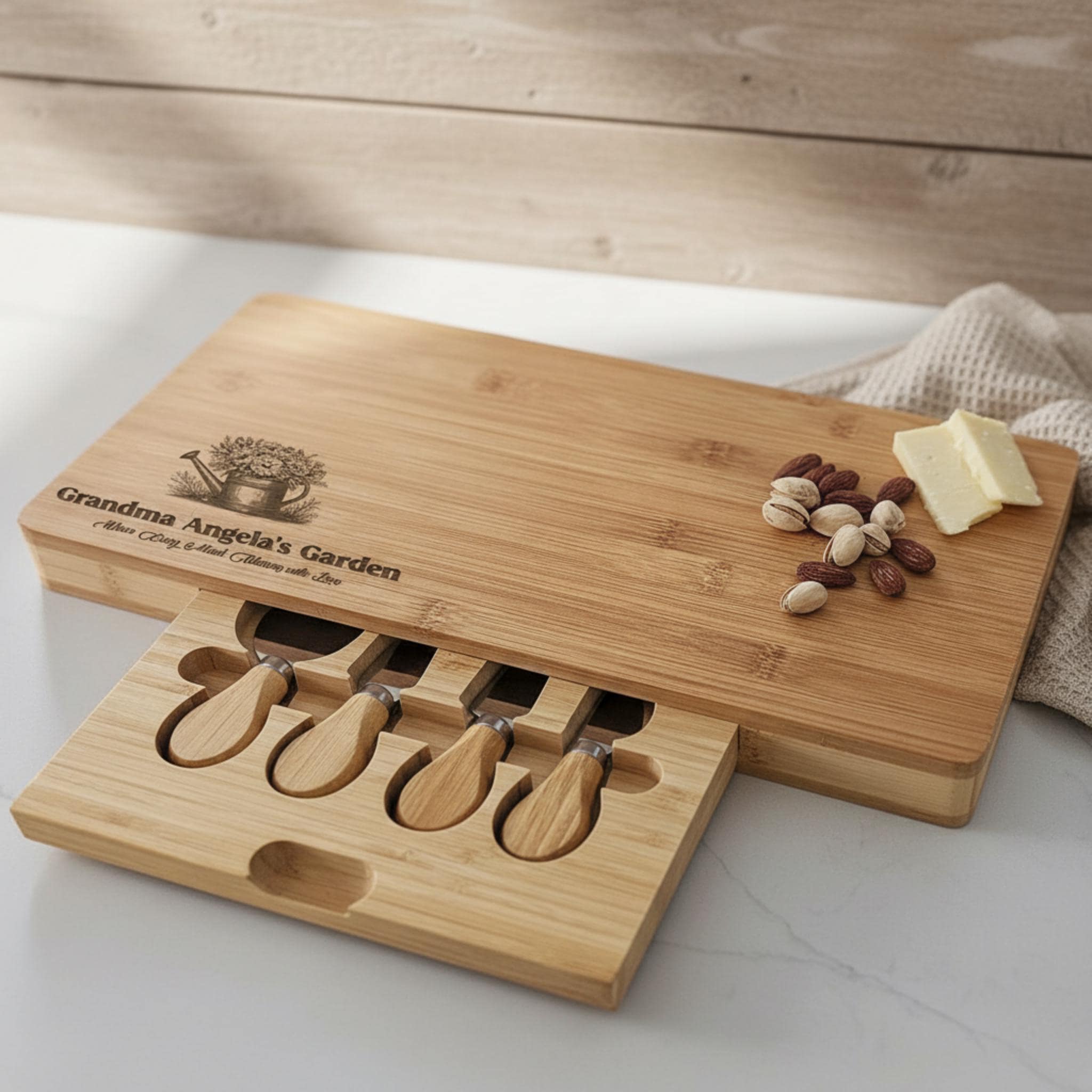 Cheeseboard: A generously sized cheeseboard with a built-in utensil drawer, ideal for serving cheeses, savory treats, or sweet delights made with love.