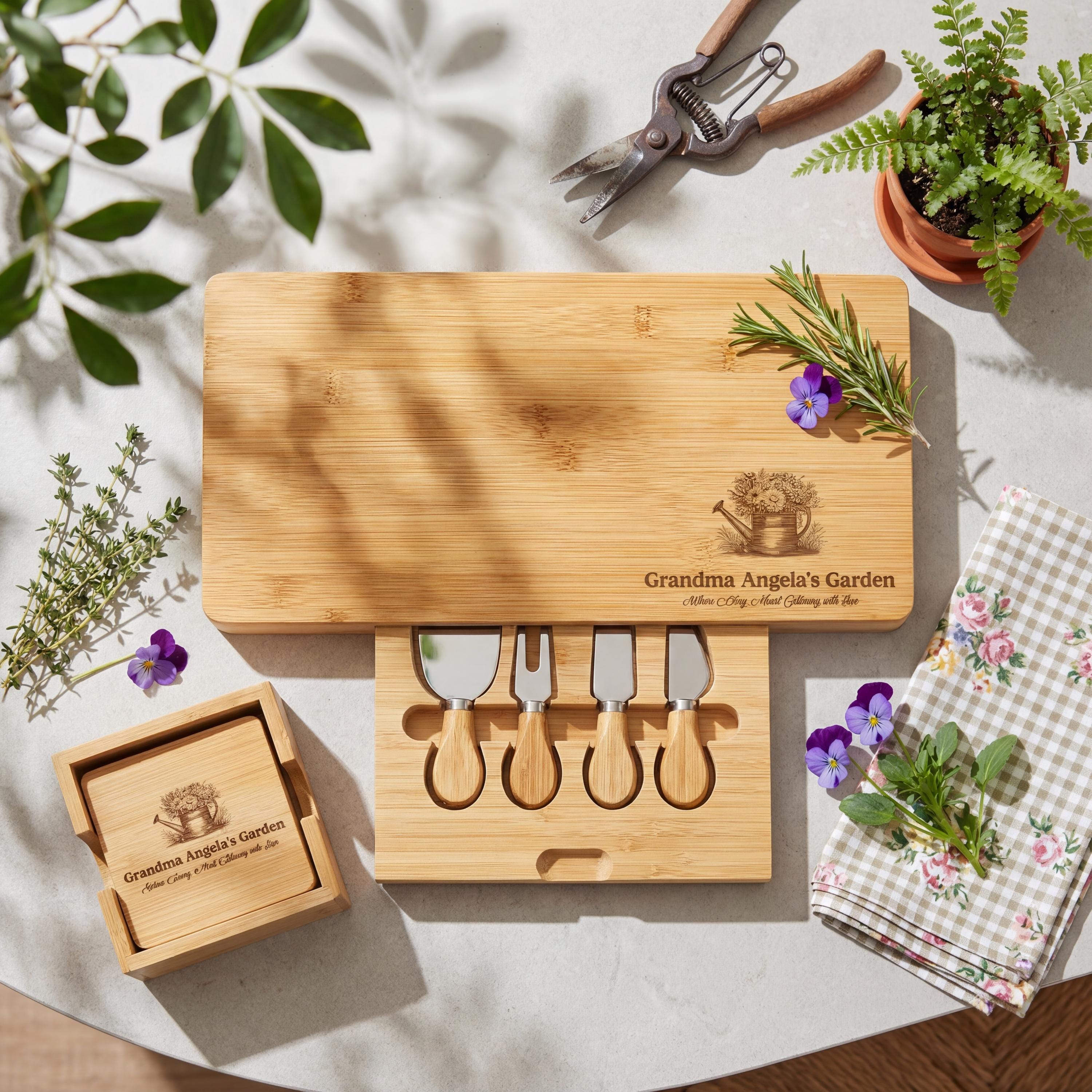 Personalized Grandma Garden Bamboo Charcuterie Board with 4 Knives, Custom Engraved Cheese Platter