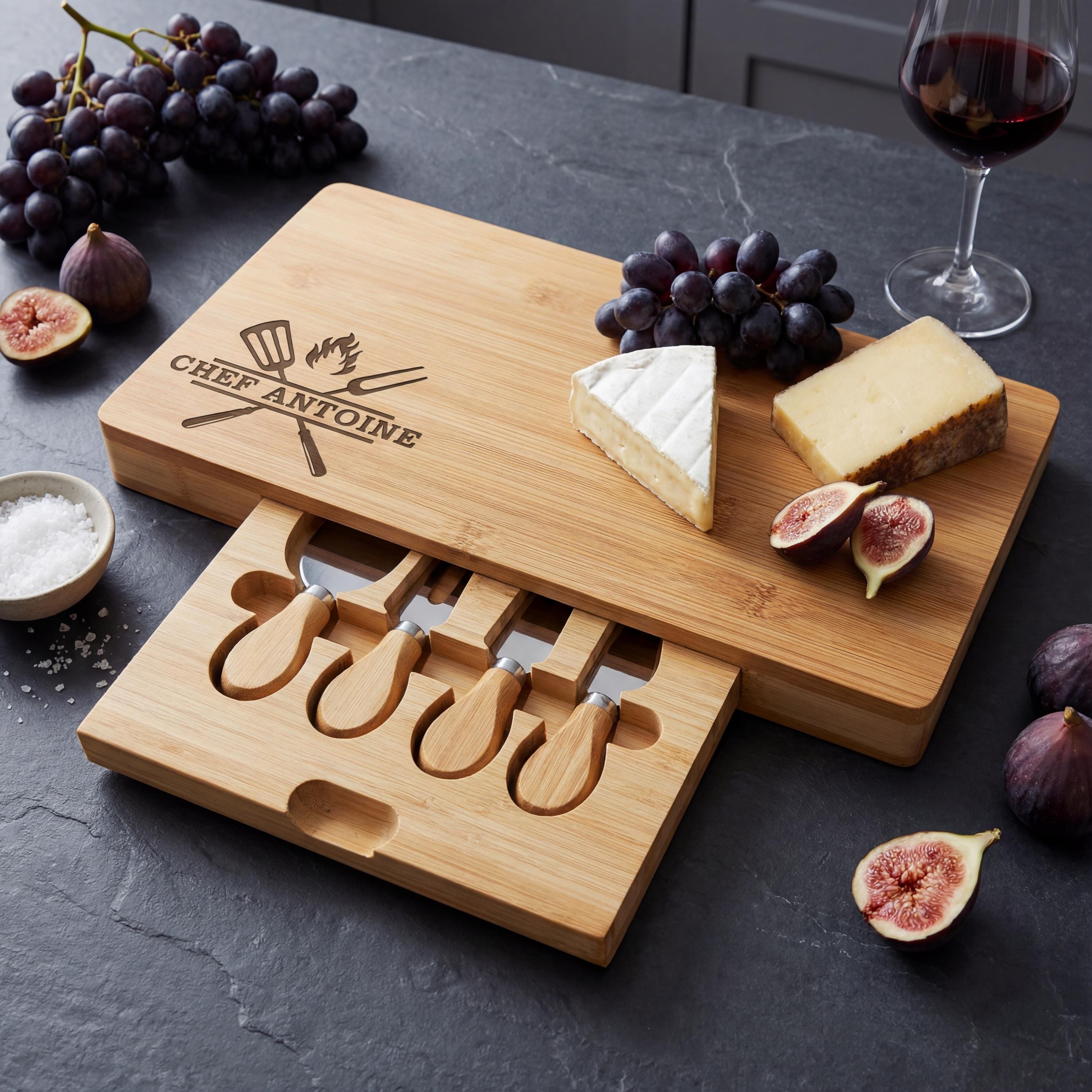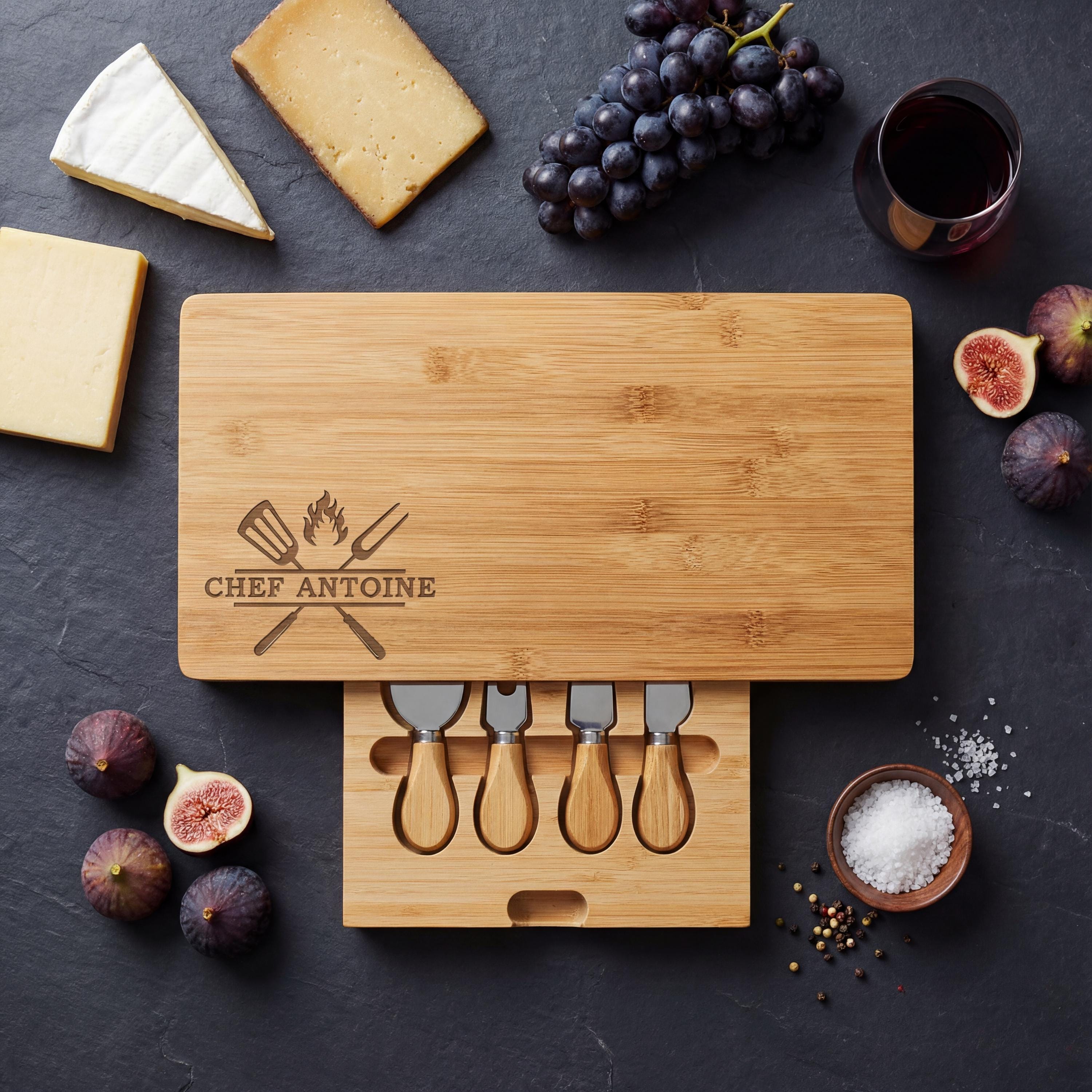 Crown him the King of the Grill with this personalized cutting board. Featuring a custom BBQ Chef design and hidden knife drawer, this bamboo charcuterie set is the ultimate birthday gift for Dad or Father's Day present.
