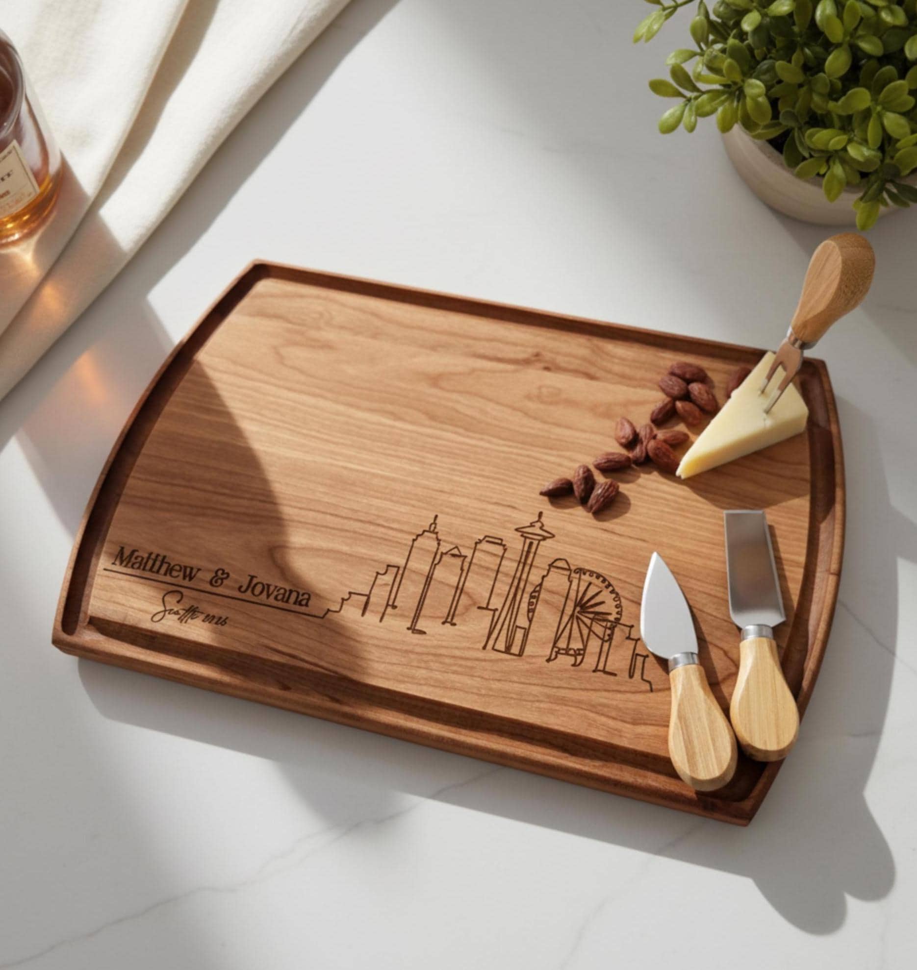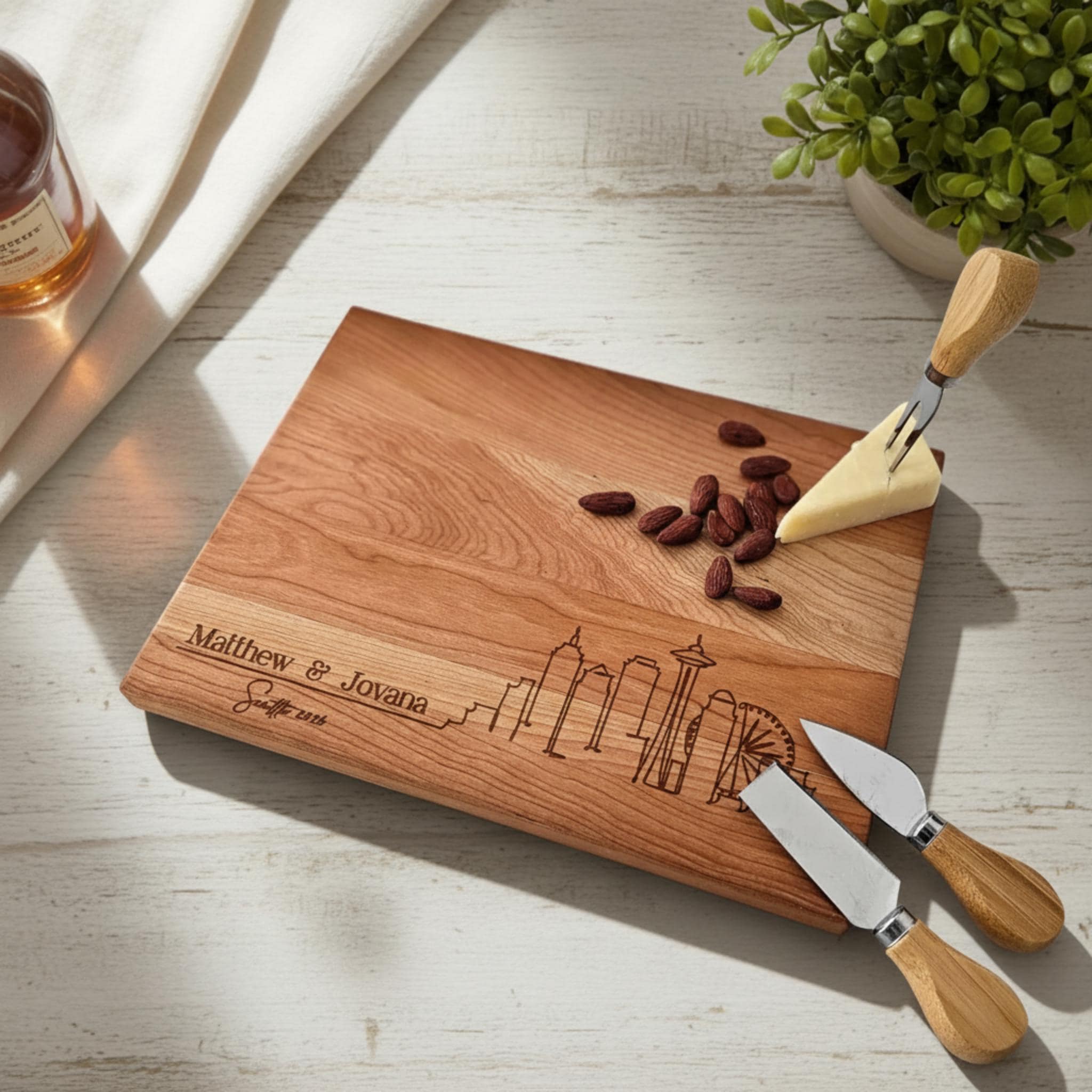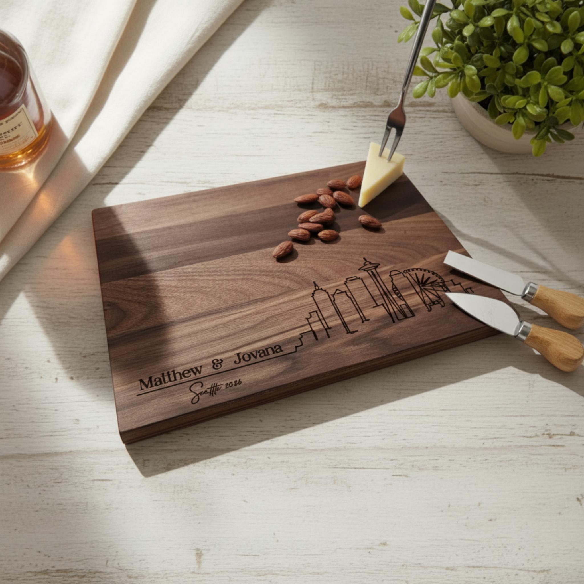 Personalized Cutting Board, City Skyline: Engraved Charcuterie Board, Wedding Gift, Housewarming Gift, Engagement Gift, Gift for Couple