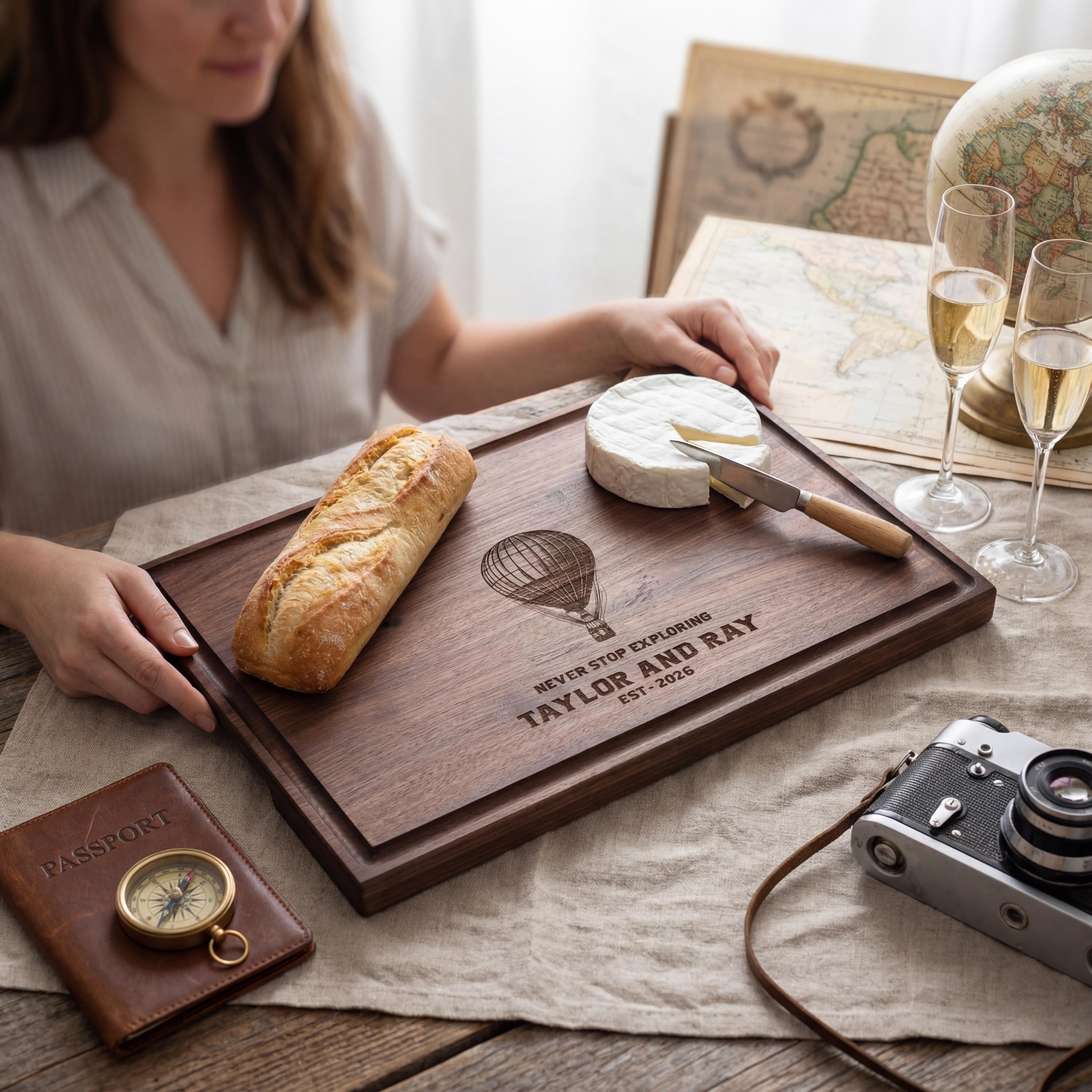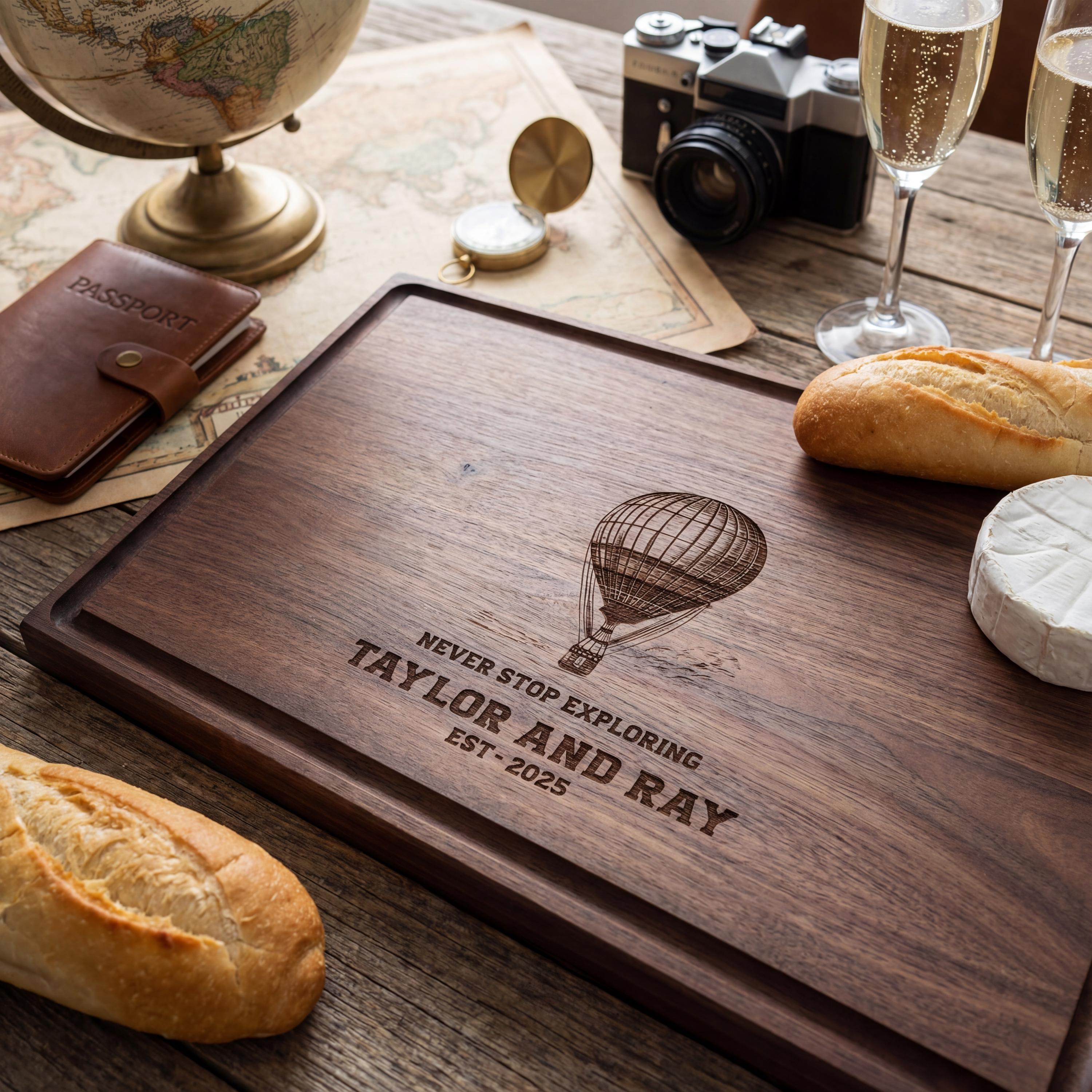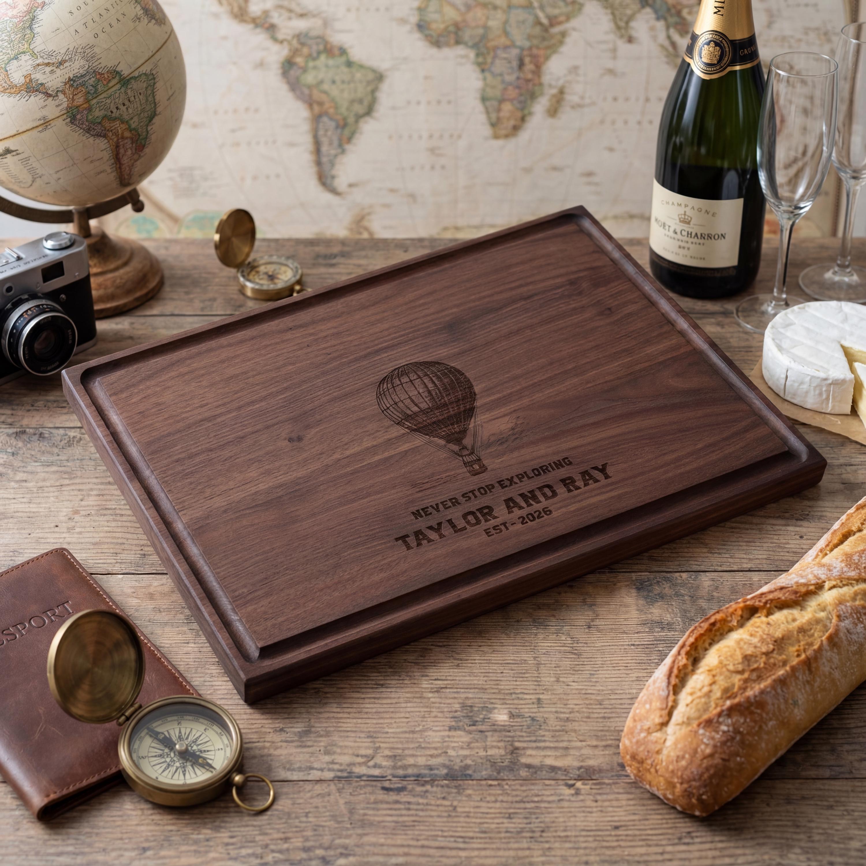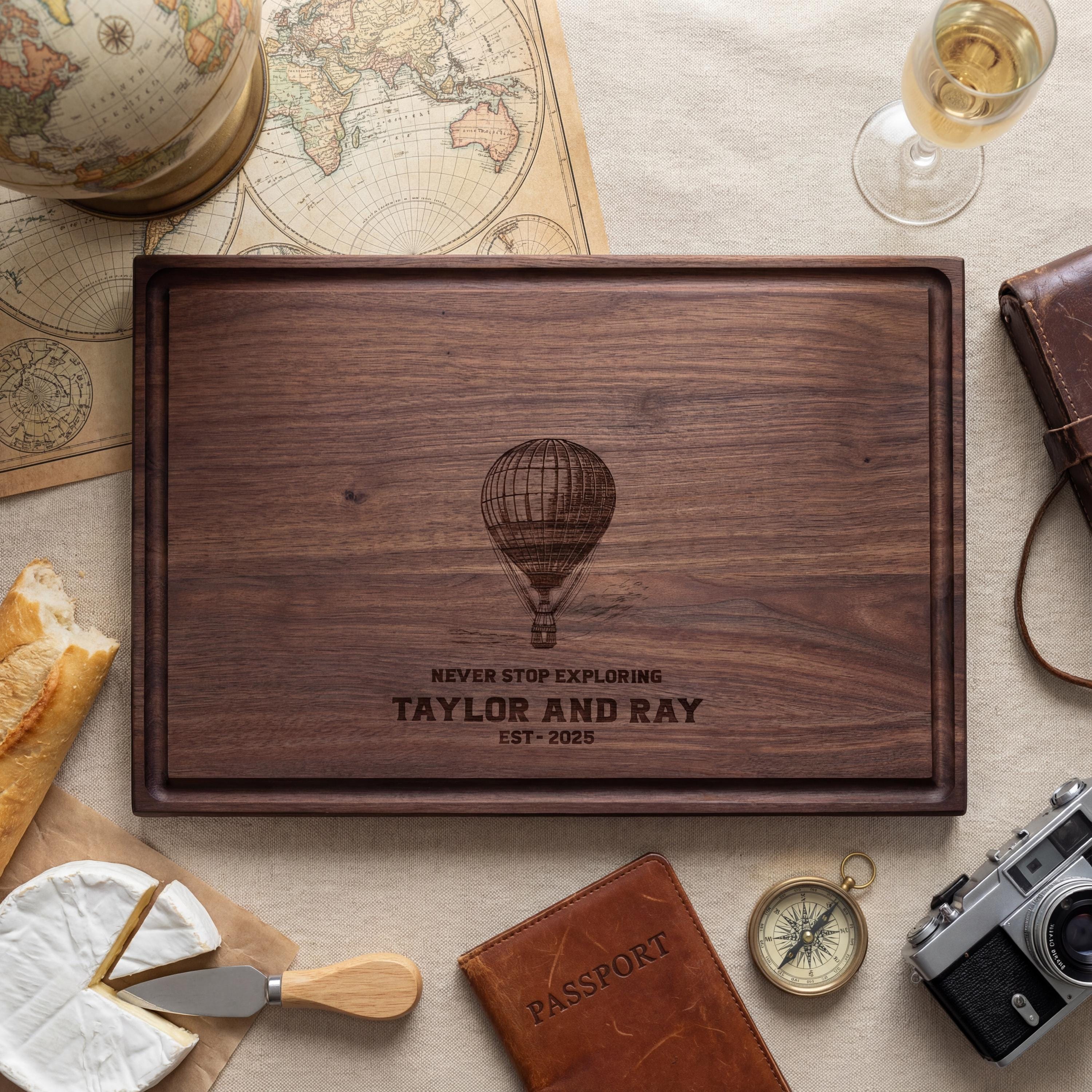 Inspire their next journey with this personalized travel cutting board. Featuring a vintage hot air balloon engraving and the quote 'Never Stop Exploring,' this walnut charcuterie board is the ultimate adventure wedding gift or retirement present.