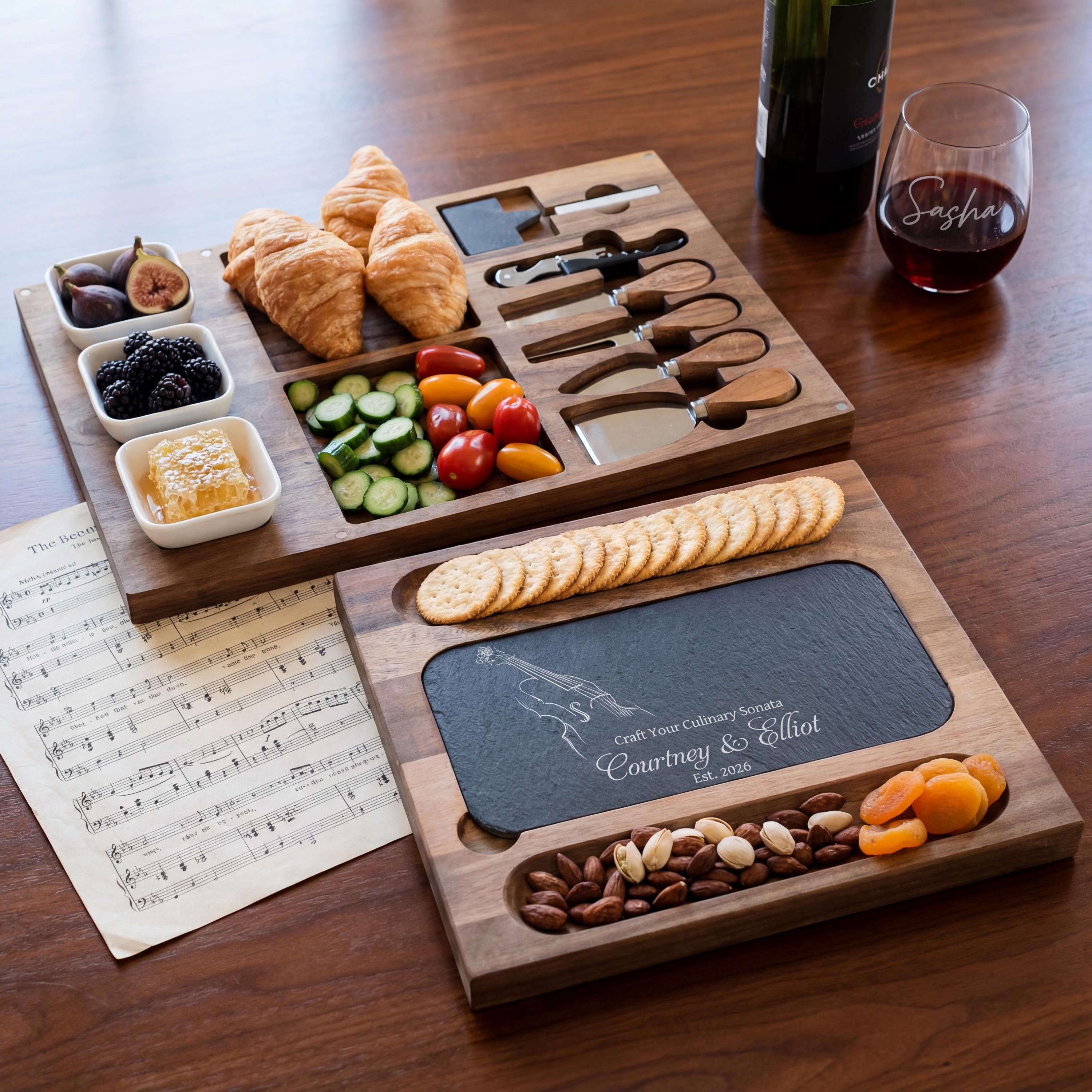 Compose a masterpiece of flavor with this personalized violin charcuterie board set. Featuring a custom engraved slate insert and expandable serving trays, this luxury music gift is the ultimate wedding present for conductors, cellists, and violinists.