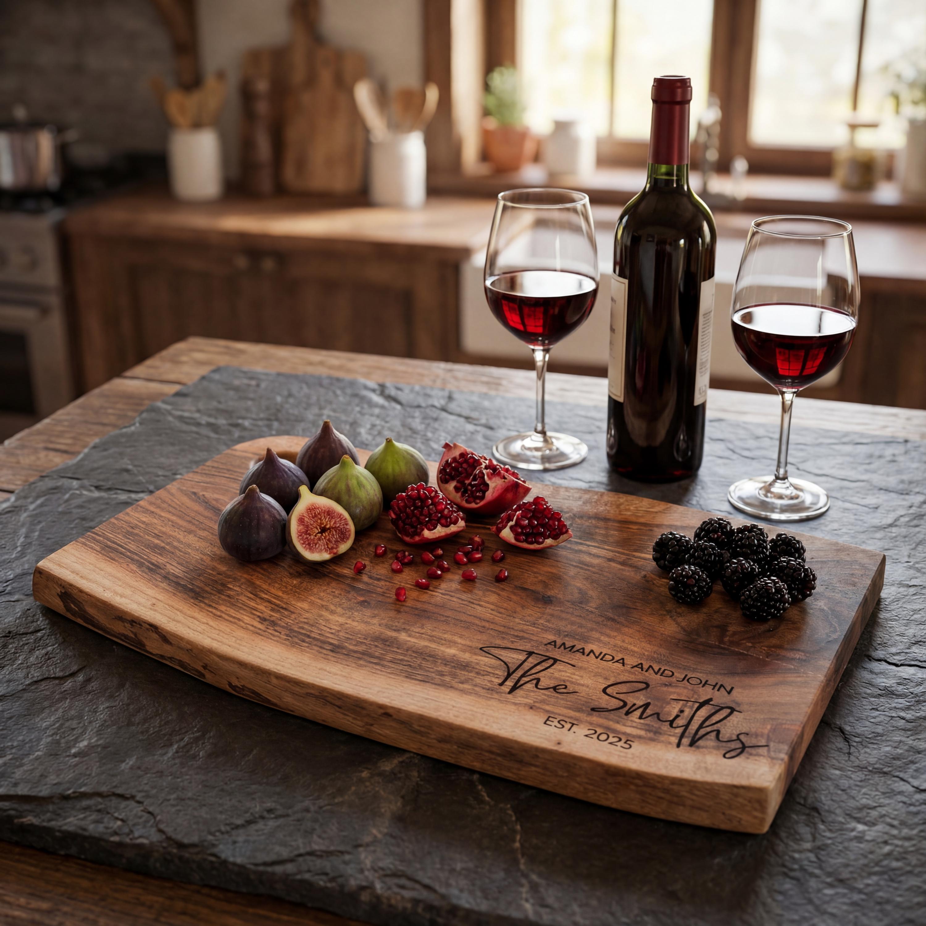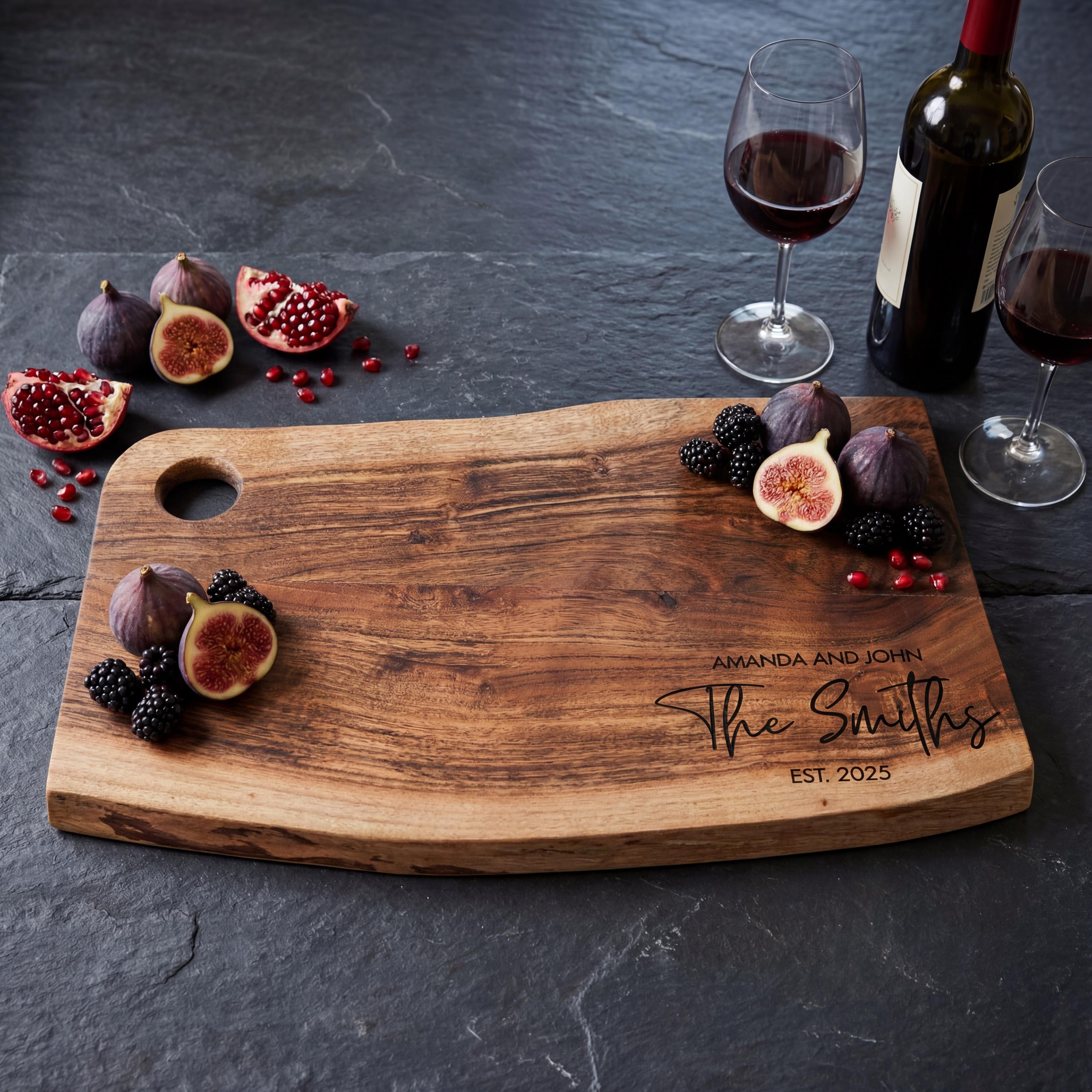Whether you choose the rustic charm of Live Edge Mango Wood or the functionality of Acacia, these custom-engraved boards are the ultimate gift for rustic weddings, housewarmings, and 5th anniversaries.