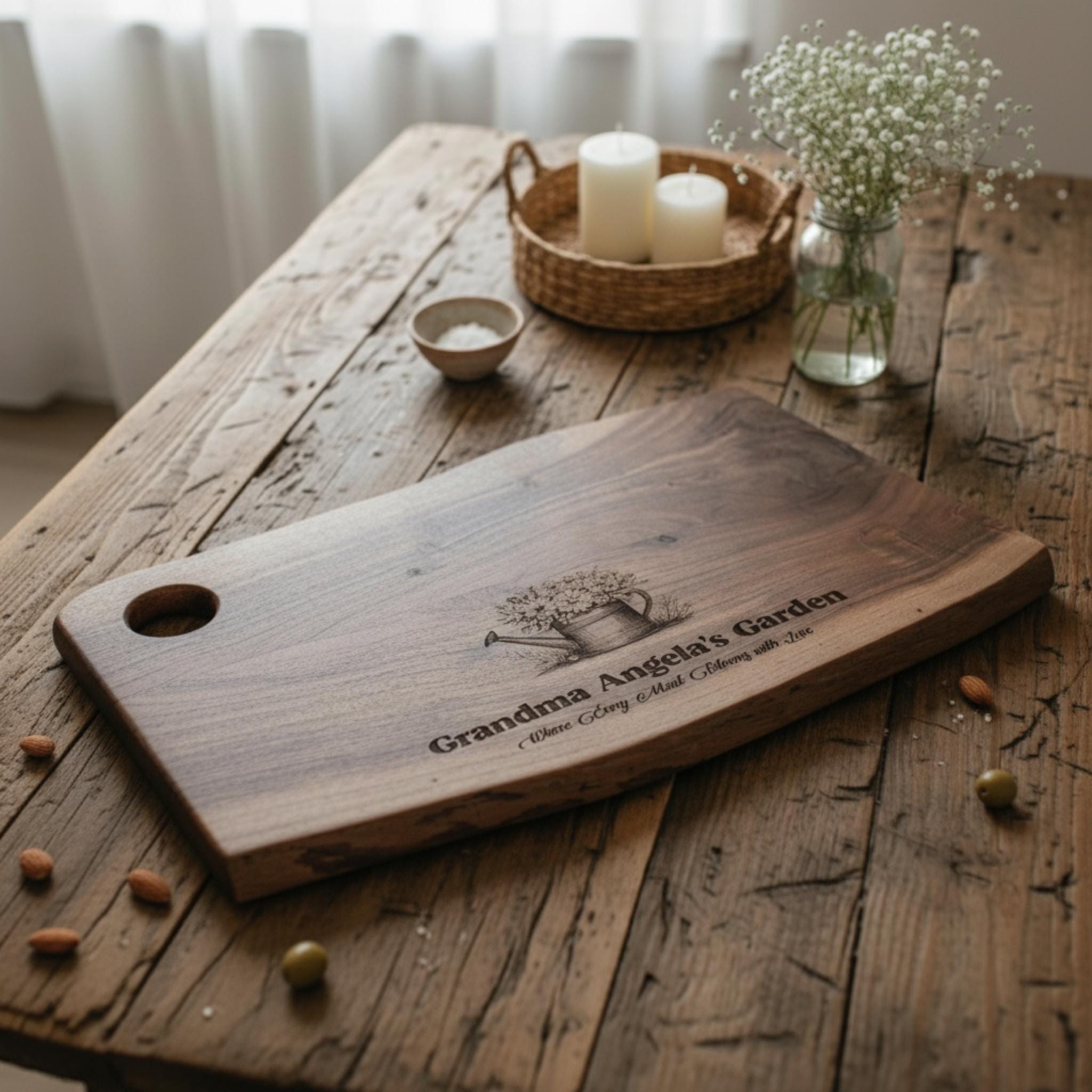 Personalized Live Edge Cutting Board, Grandma Gift, Watering Can: Rustic Engraved Charcuterie Board | Mother's Day, Birthday Gift