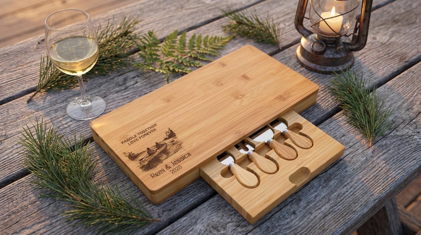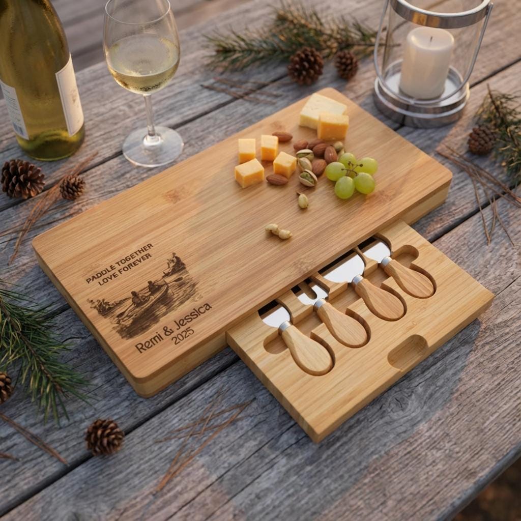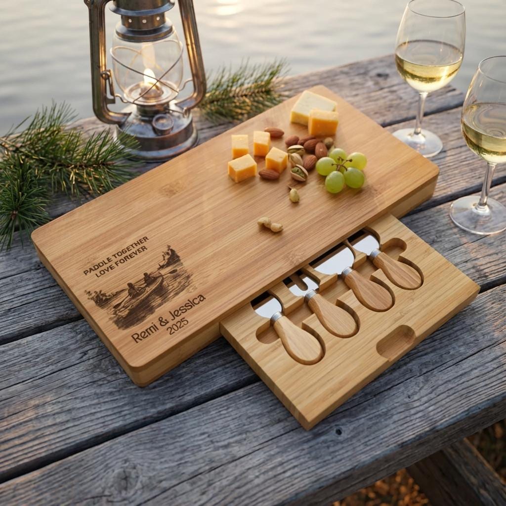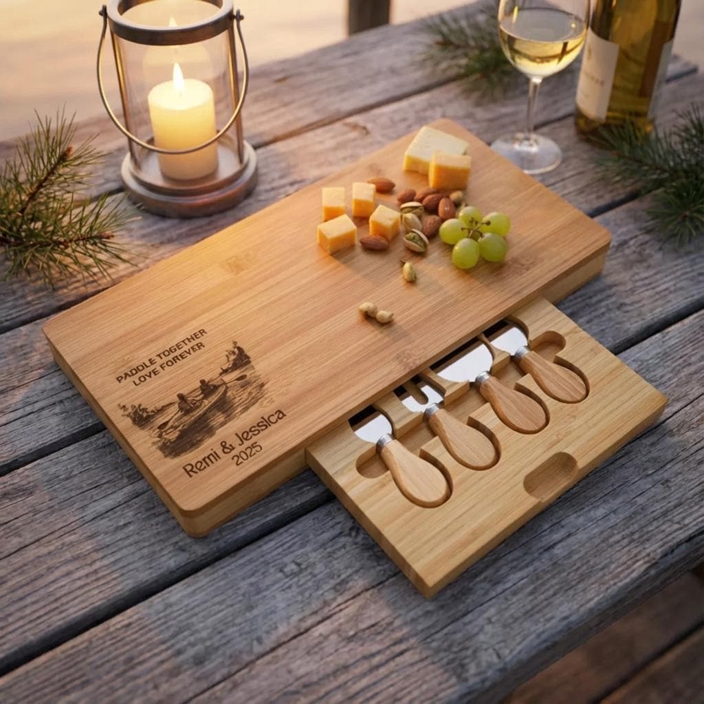 Navigate life's adventures with this personalized kayaking charcuterie board. Featuring the romantic 'Paddle Together' engraving and a hidden knife drawer, this bamboo cheese set is the ultimate lake house wedding gift or outdoorsy anniversary present.