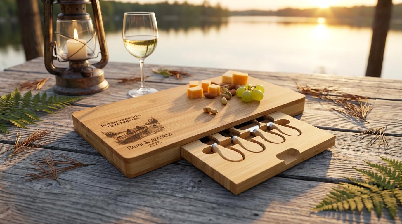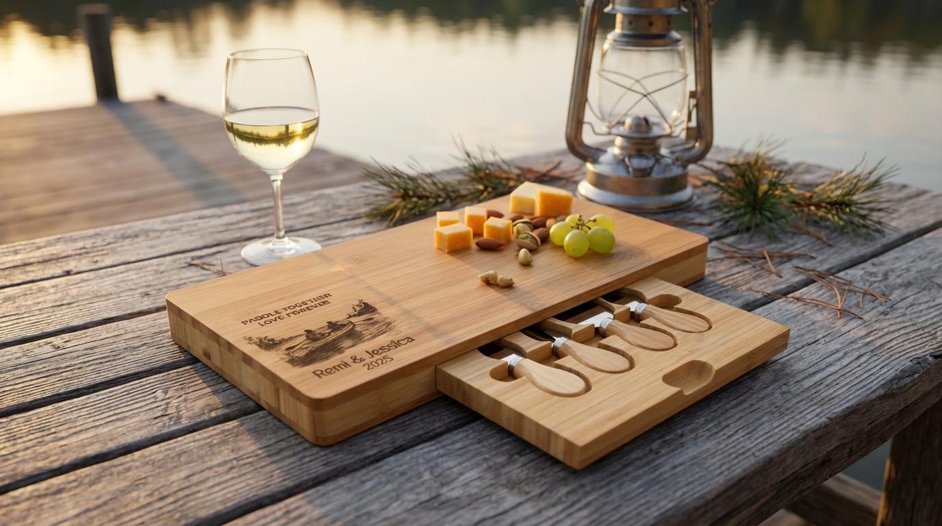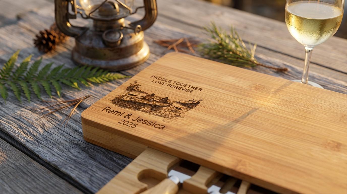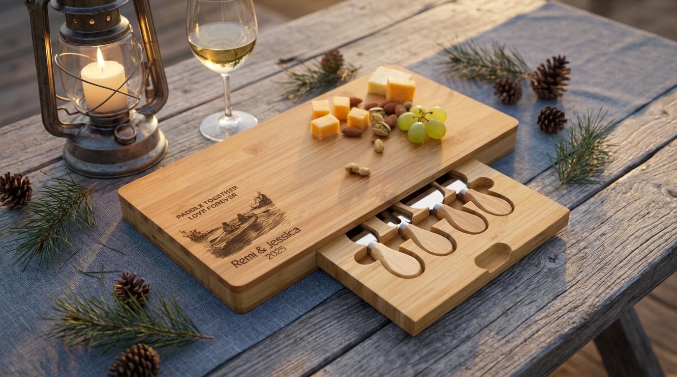 Navigate life's adventures with this personalized kayaking charcuterie board. Featuring the romantic 'Paddle Together' engraving and a hidden knife drawer, this bamboo cheese set is the ultimate lake house wedding gift or outdoorsy anniversary present.