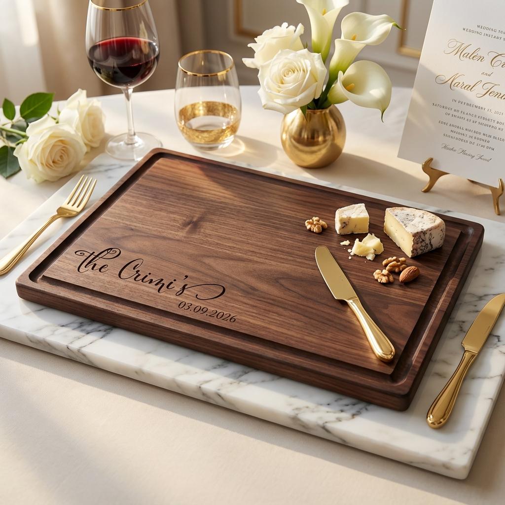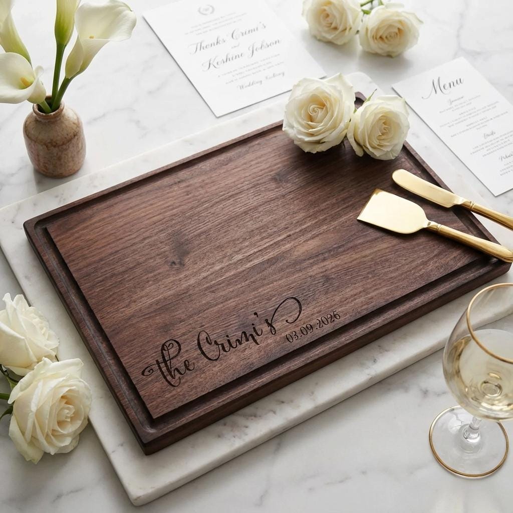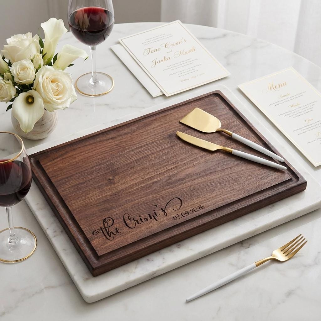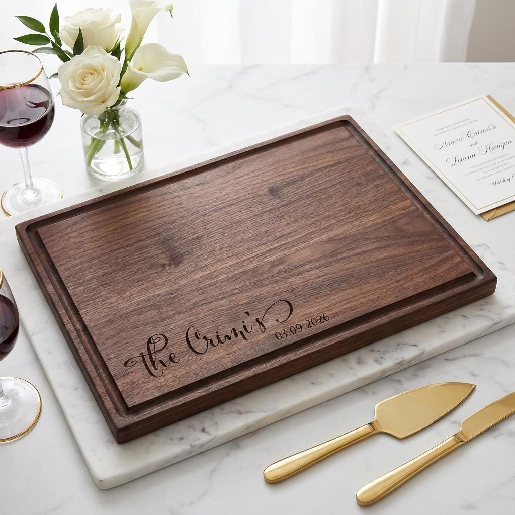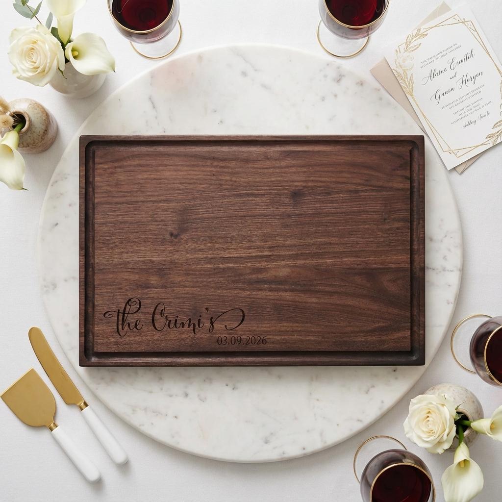 Celebrate their new chapter with this personalized family cutting board. Crafted from rich walnut wood with a deep juice groove, this custom charcuterie platter is the ultimate elegant wedding gift, 5th anniversary present, or housewarming keepsake.