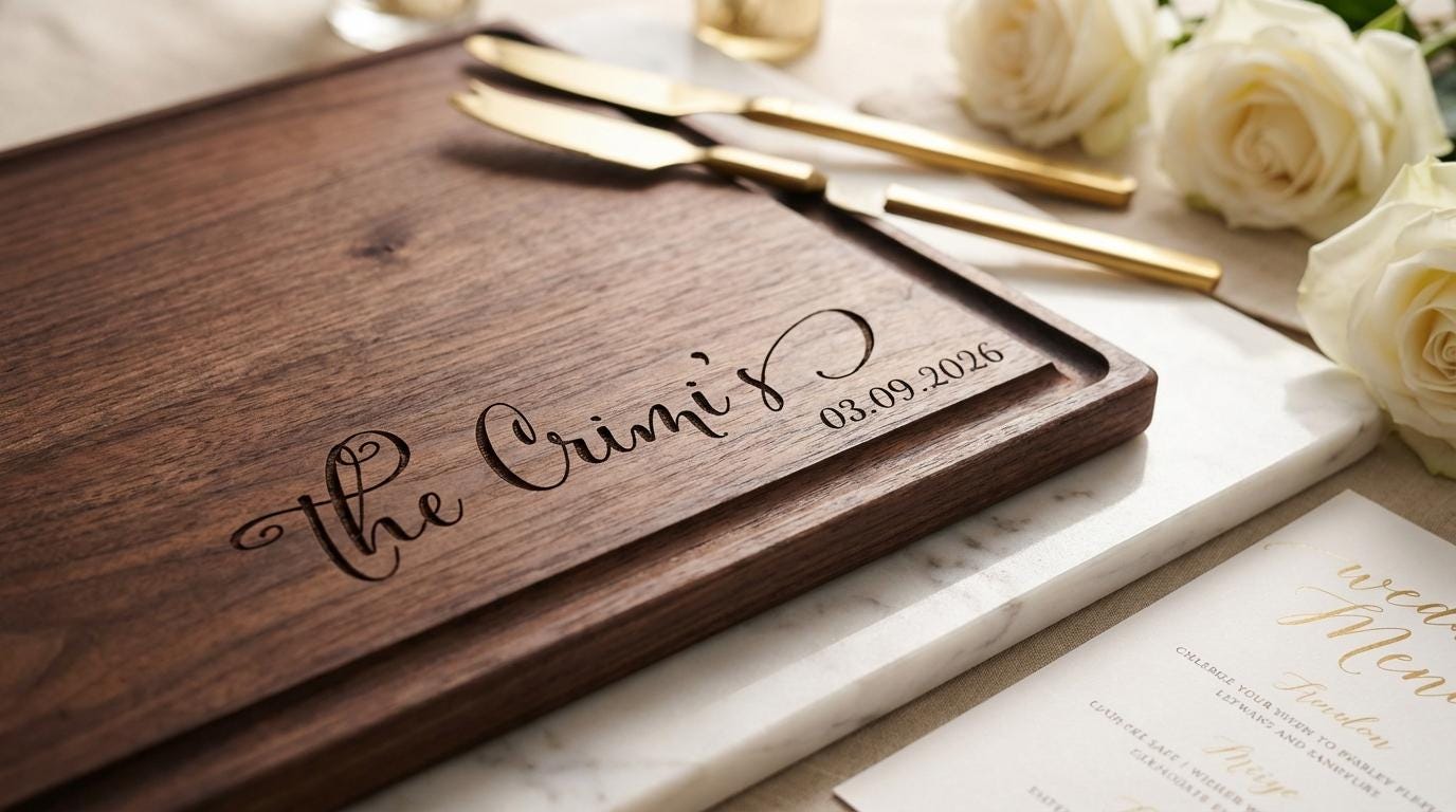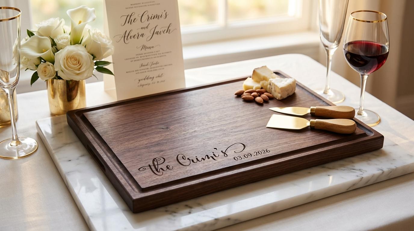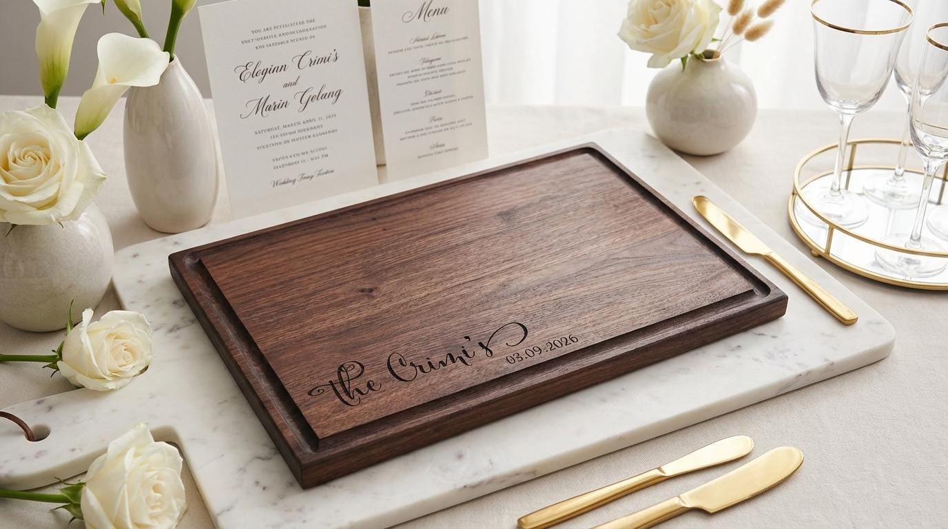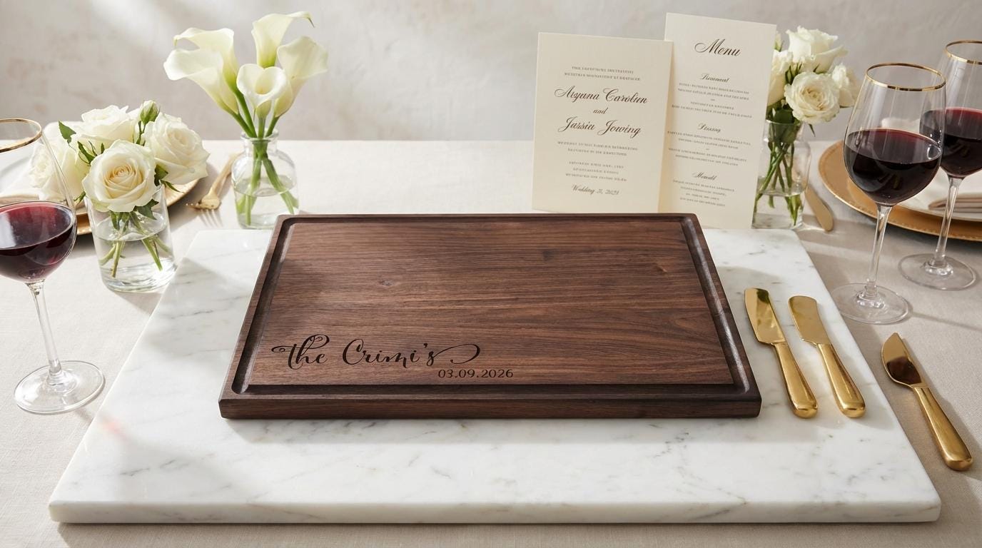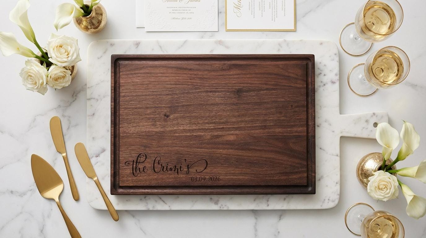 Celebrate their new chapter with this personalized family cutting board. Crafted from rich walnut wood with a deep juice groove, this custom charcuterie platter is the ultimate elegant wedding gift, 5th anniversary present, or housewarming keepsake.