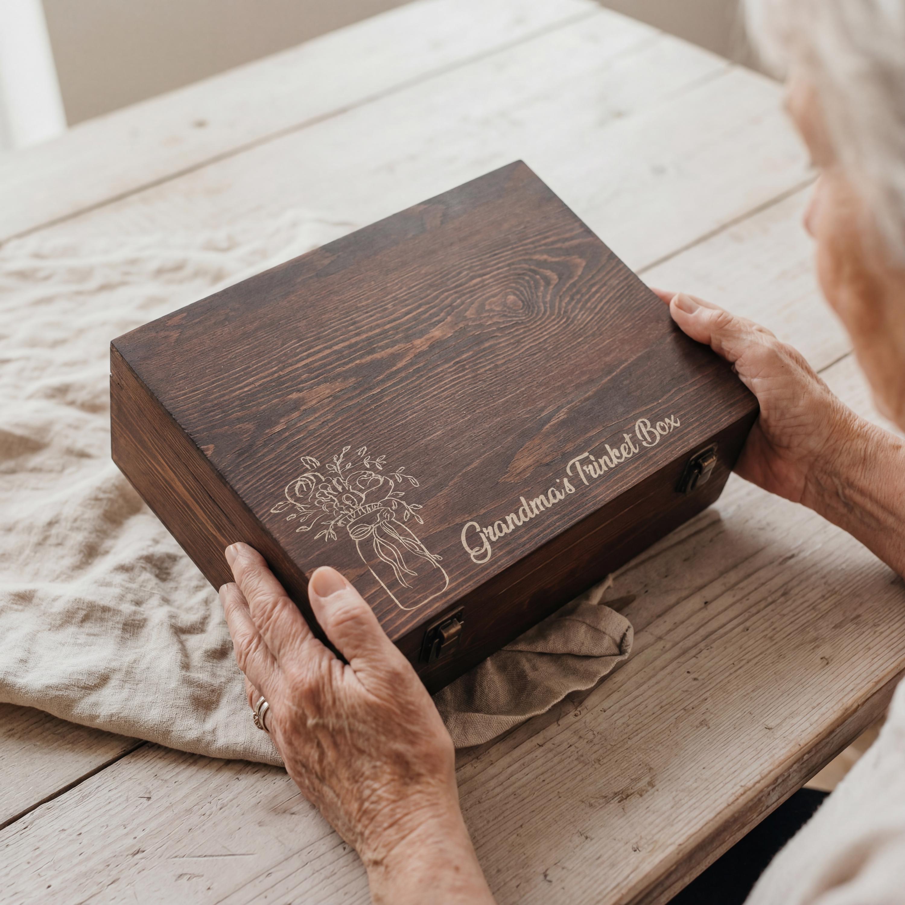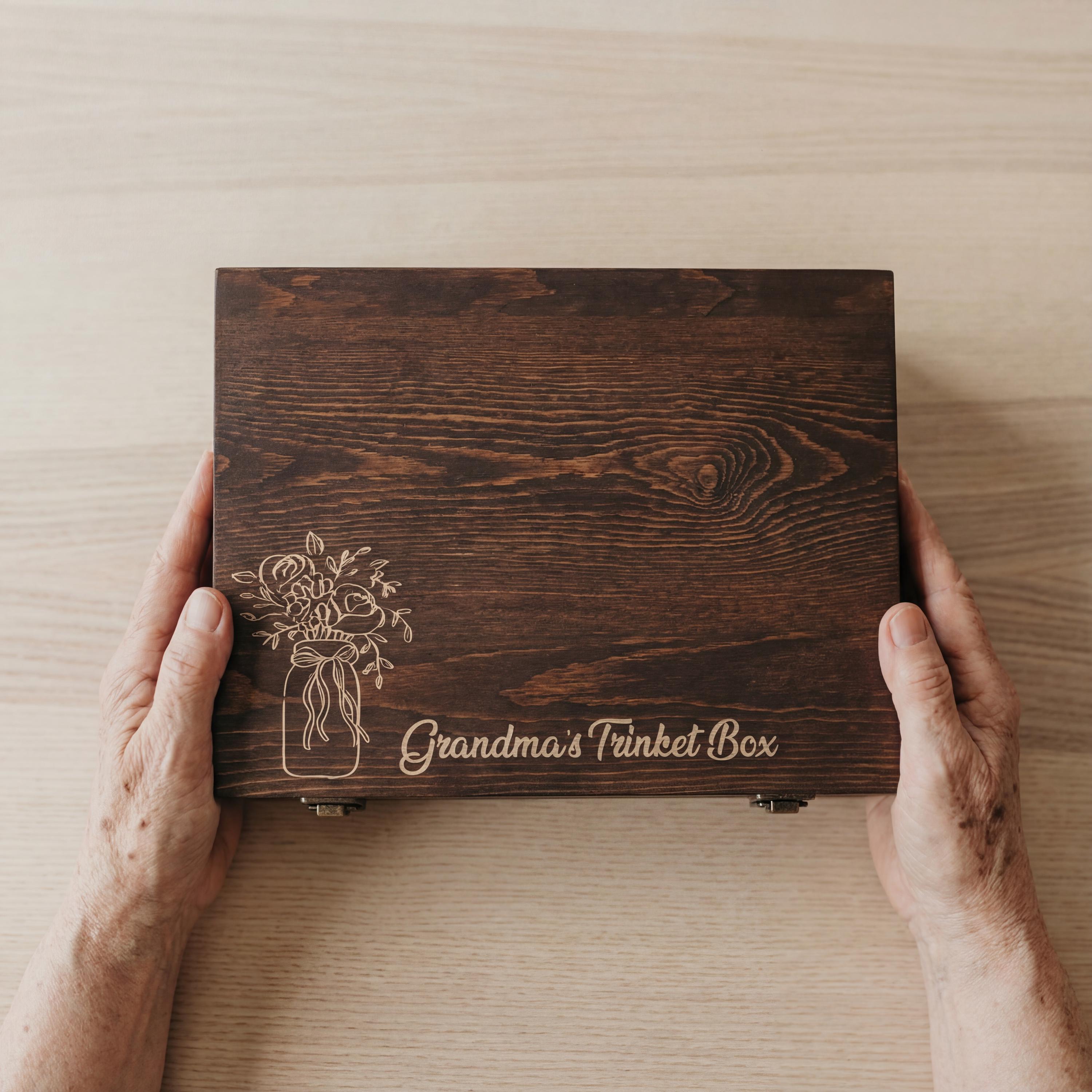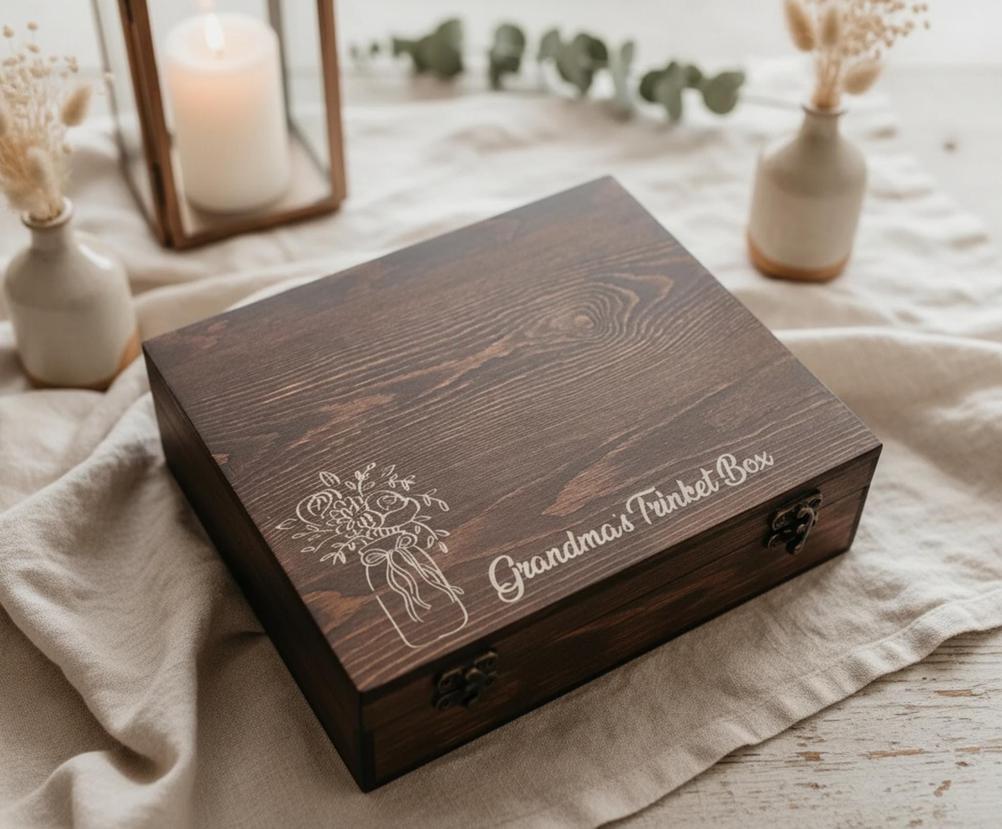 Personalized Floral Engraved Wooden Keepsake Box - Rustic Grandma Gift