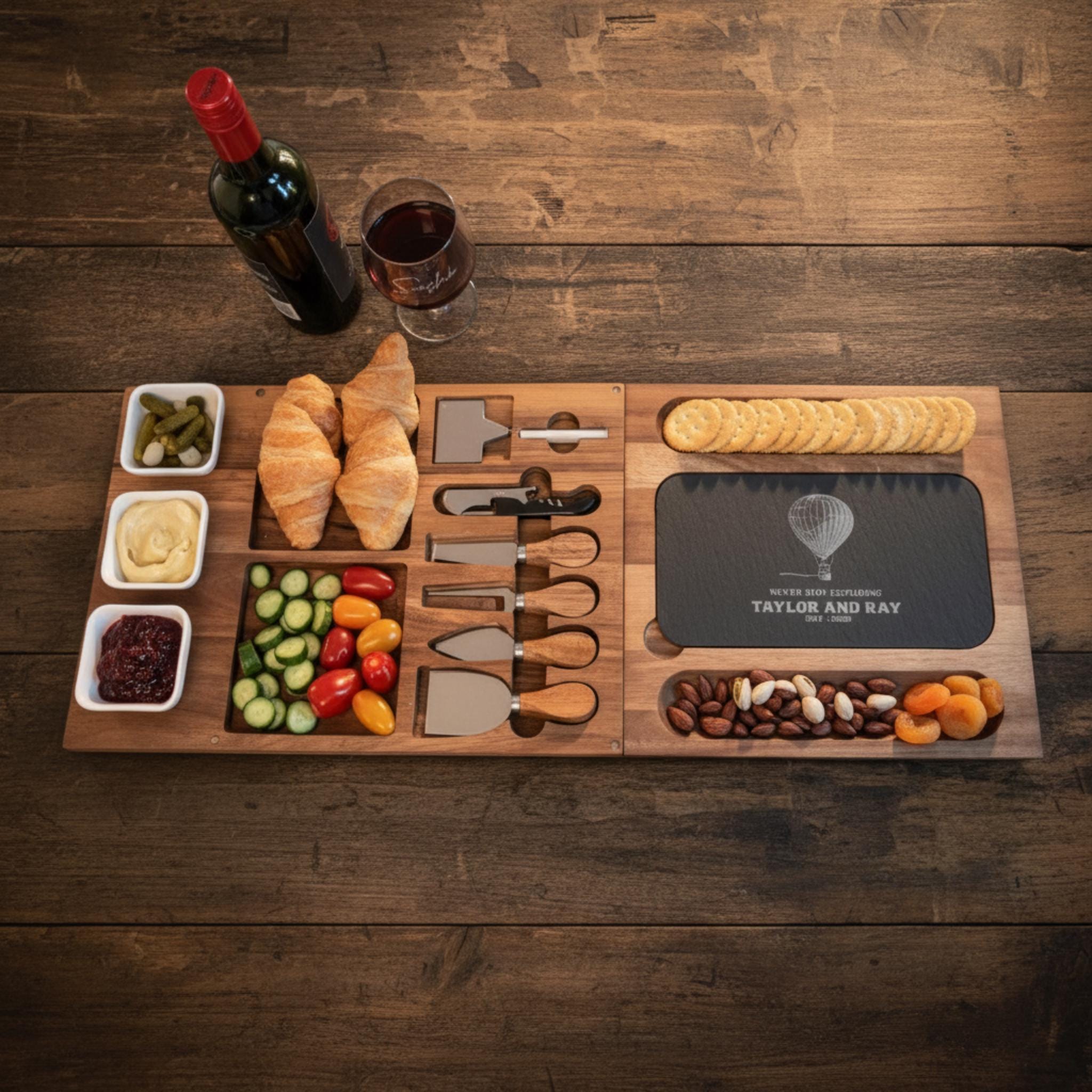 Personalized Charcuterie Board: Adventure Time - Engraved Cheese Board with tool, Hosting, Housewarming Gift for a Couple who Love Exploring