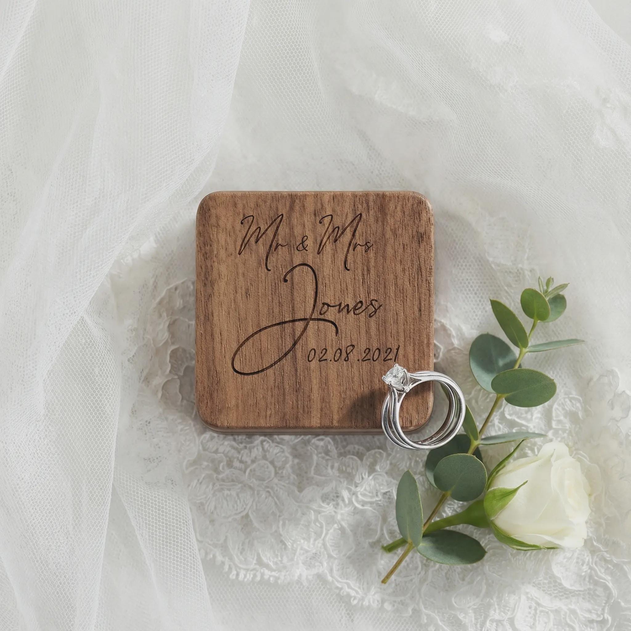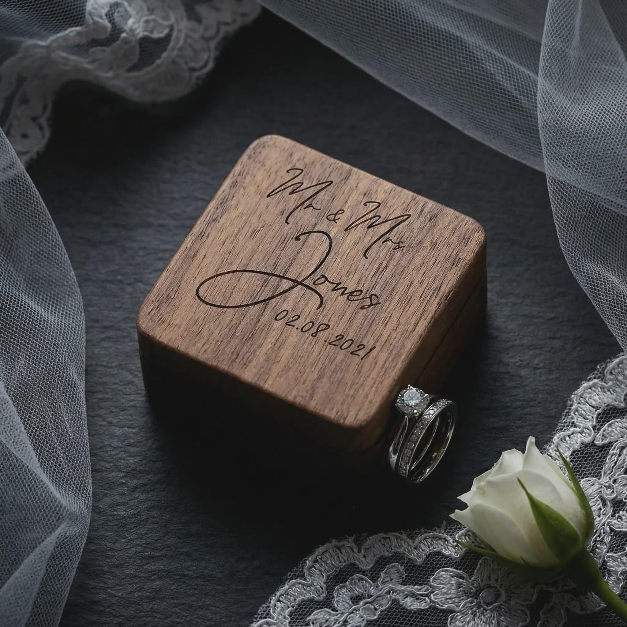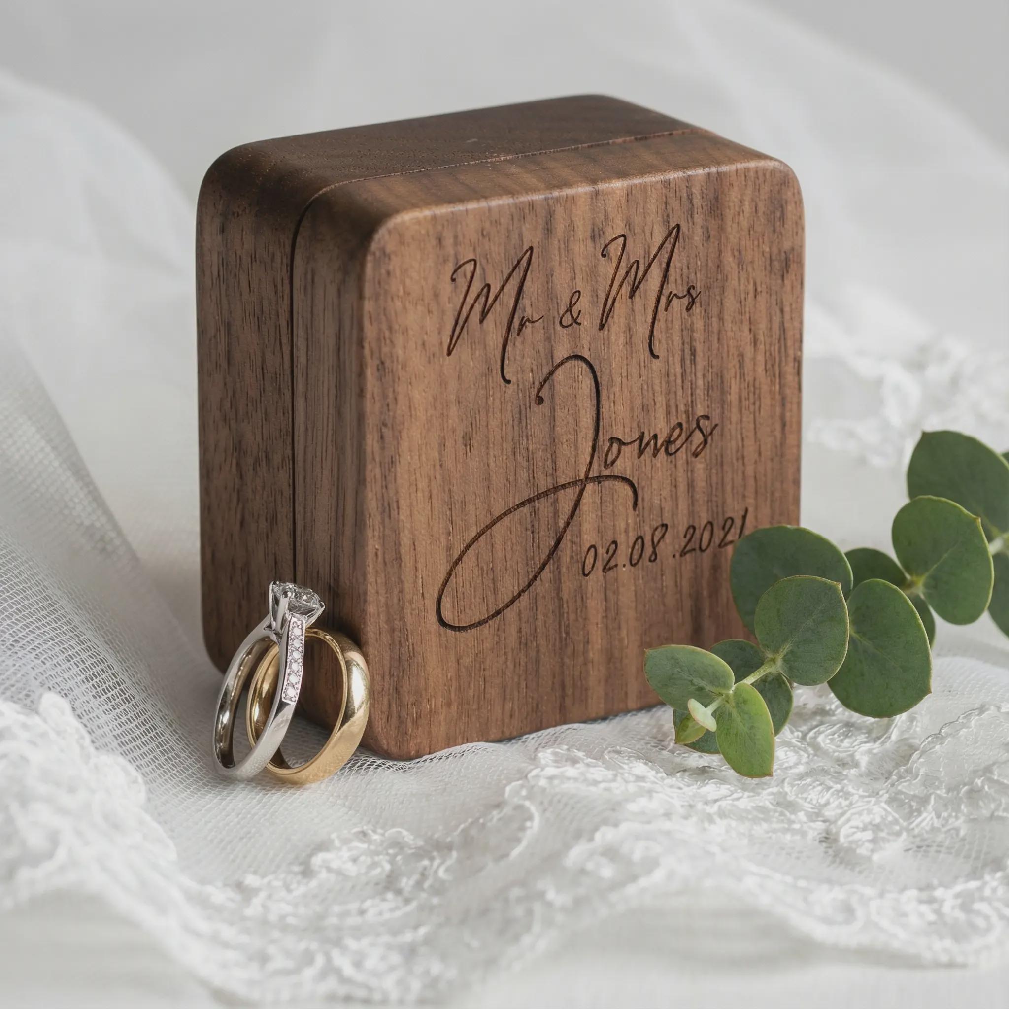 Wedding Ring Box | Personalized Walnut Wood Case & Custom "Mr and Mrs" Ceremony Prop