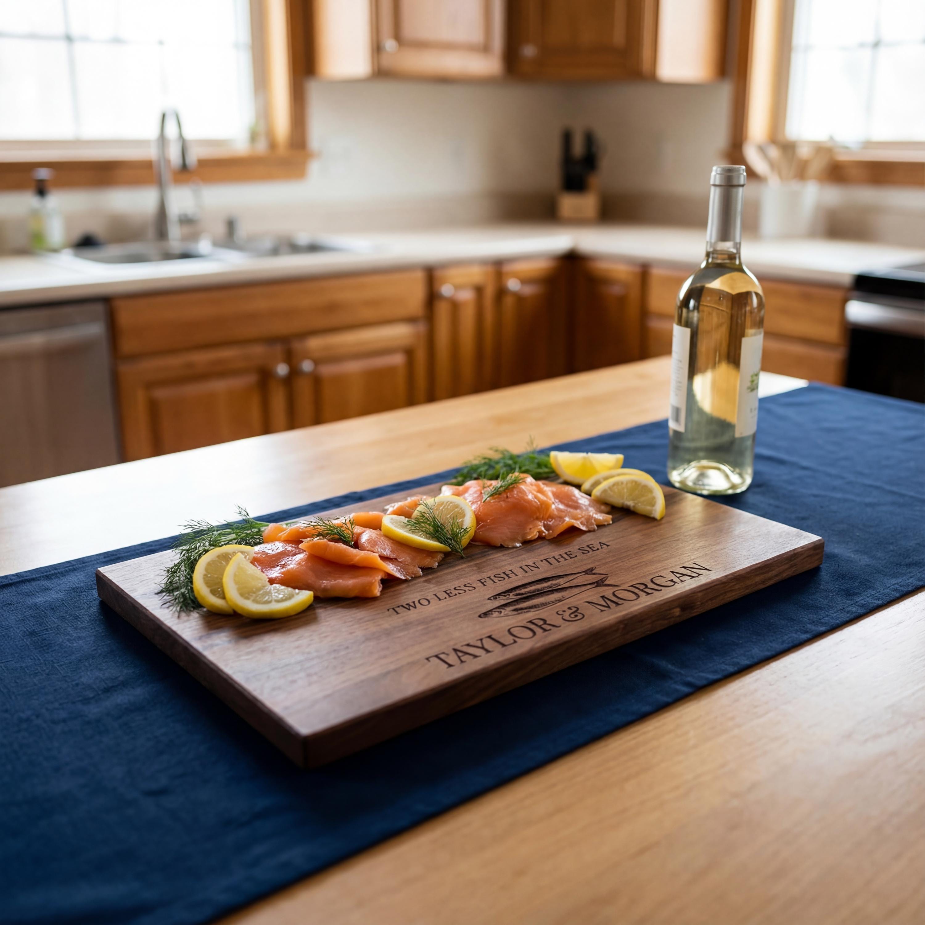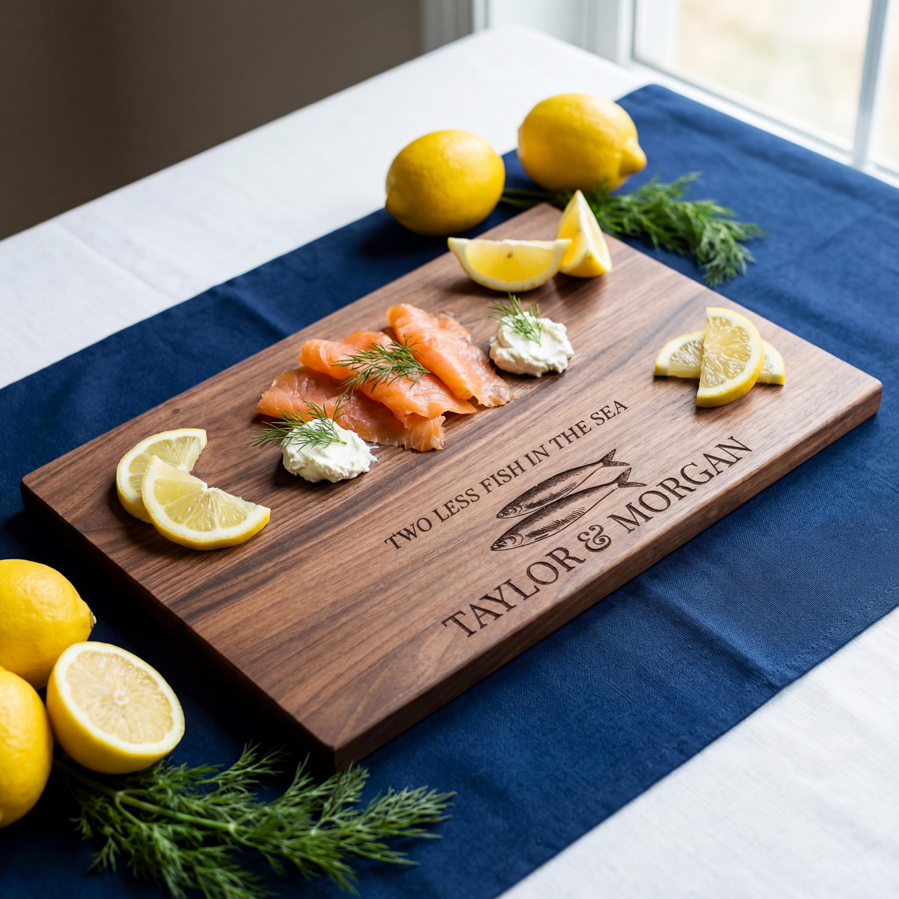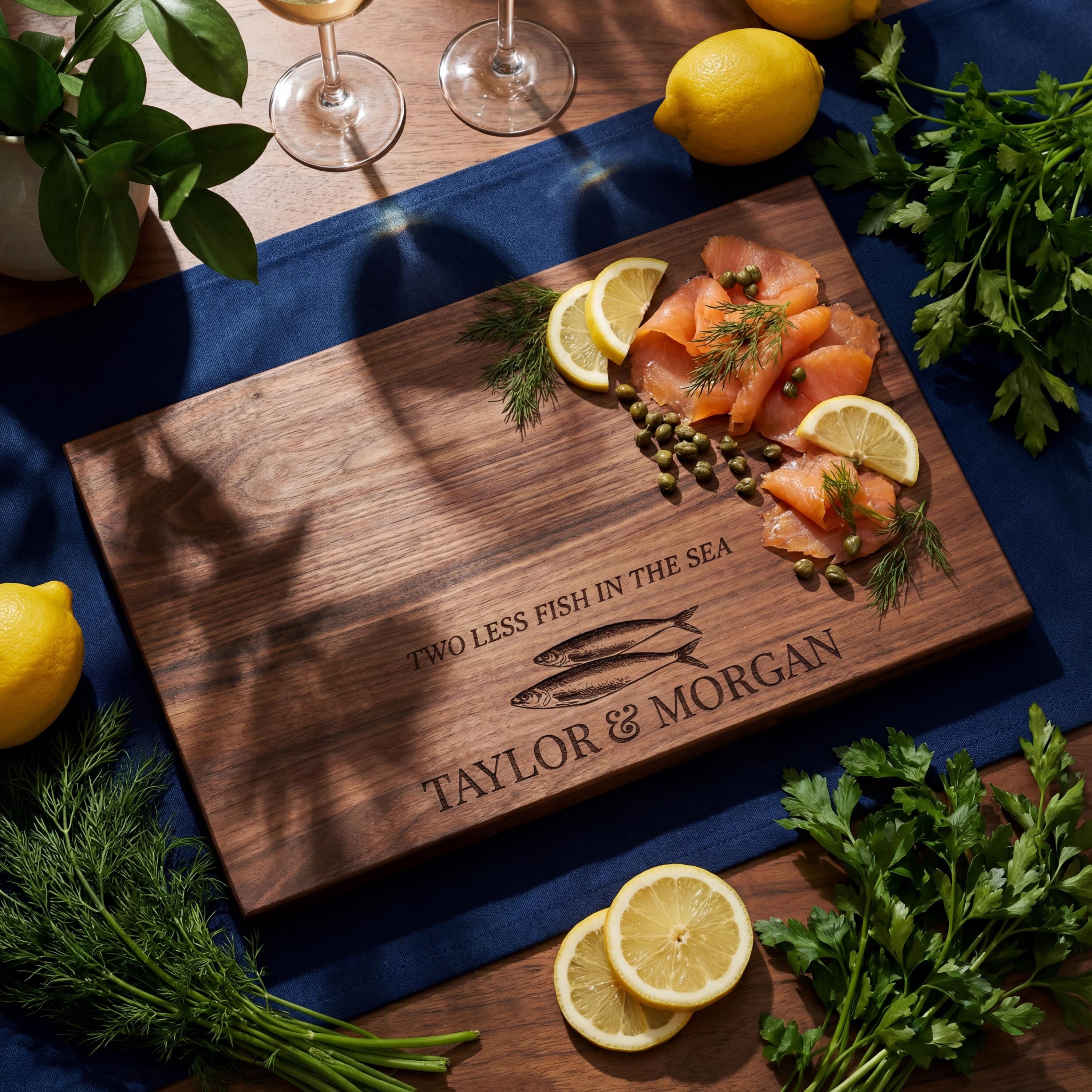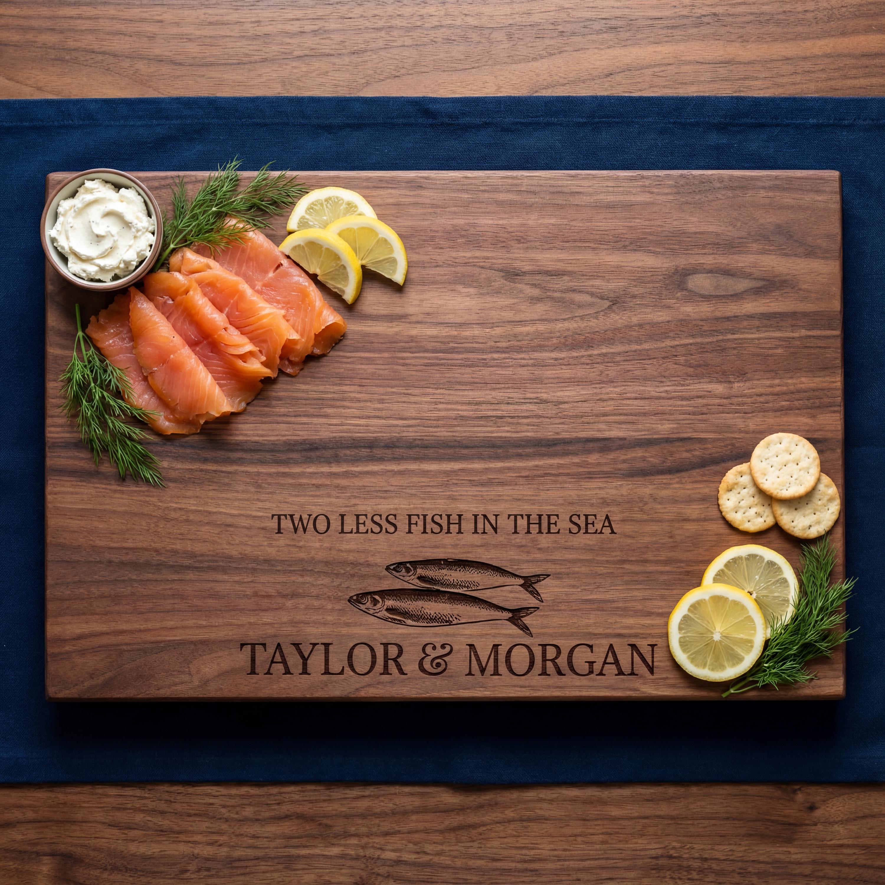 Celebrate the catch of a lifetime with this personalized fishing cutting board. Featuring the romantic 'Two Less Fish in the Sea' engraving, this walnut charcuterie platter is the ultimate fisherman's wedding gift, engagement present, or lake house decor.