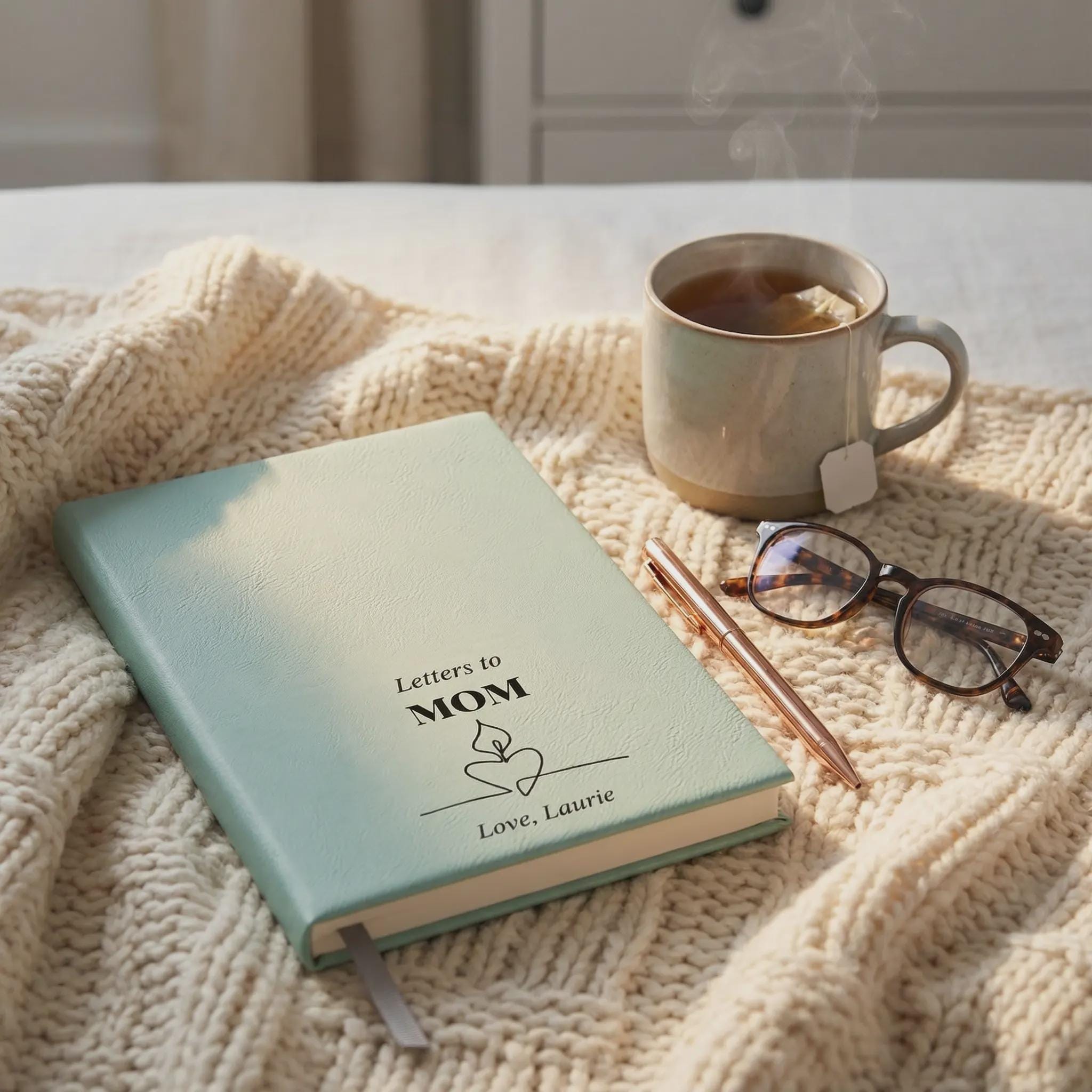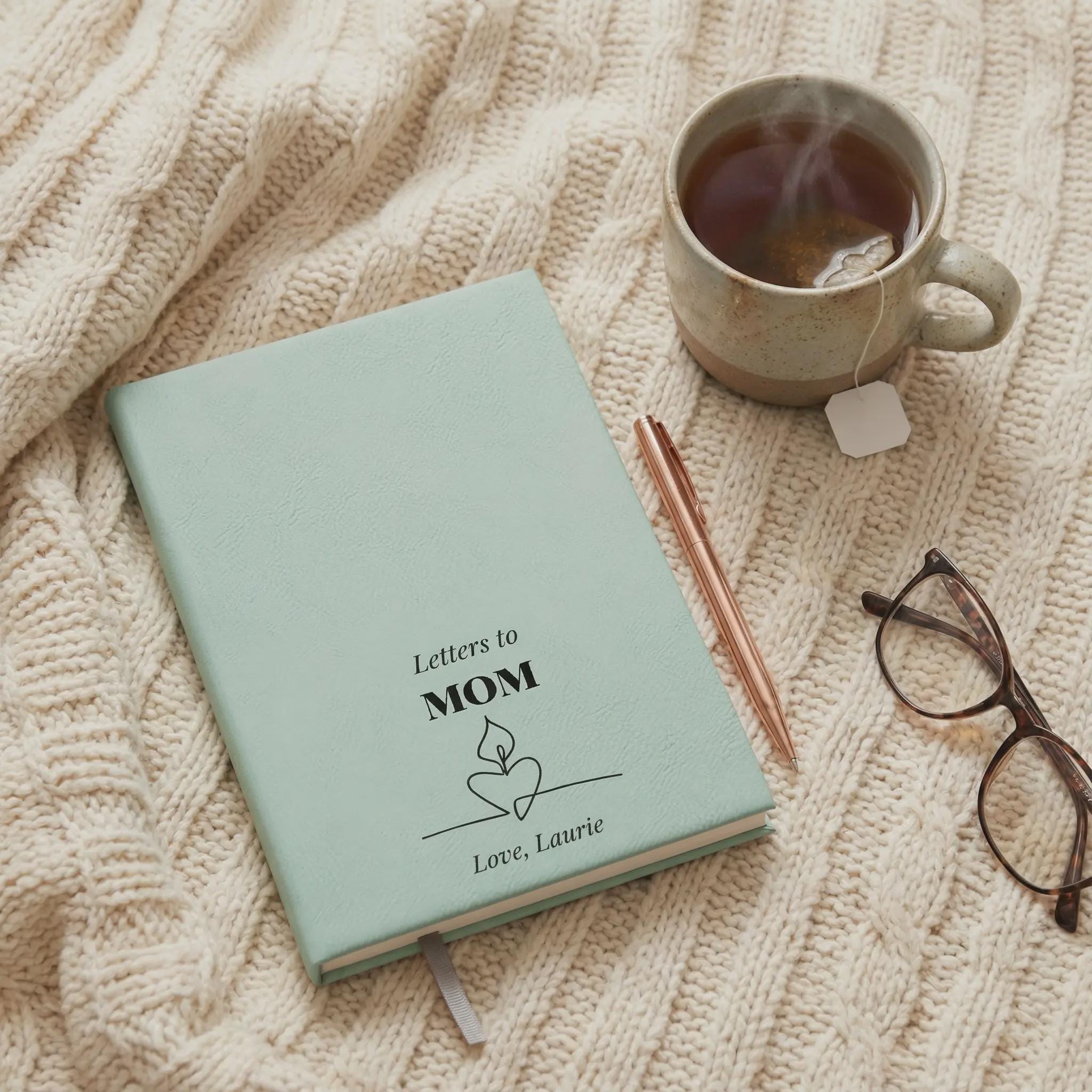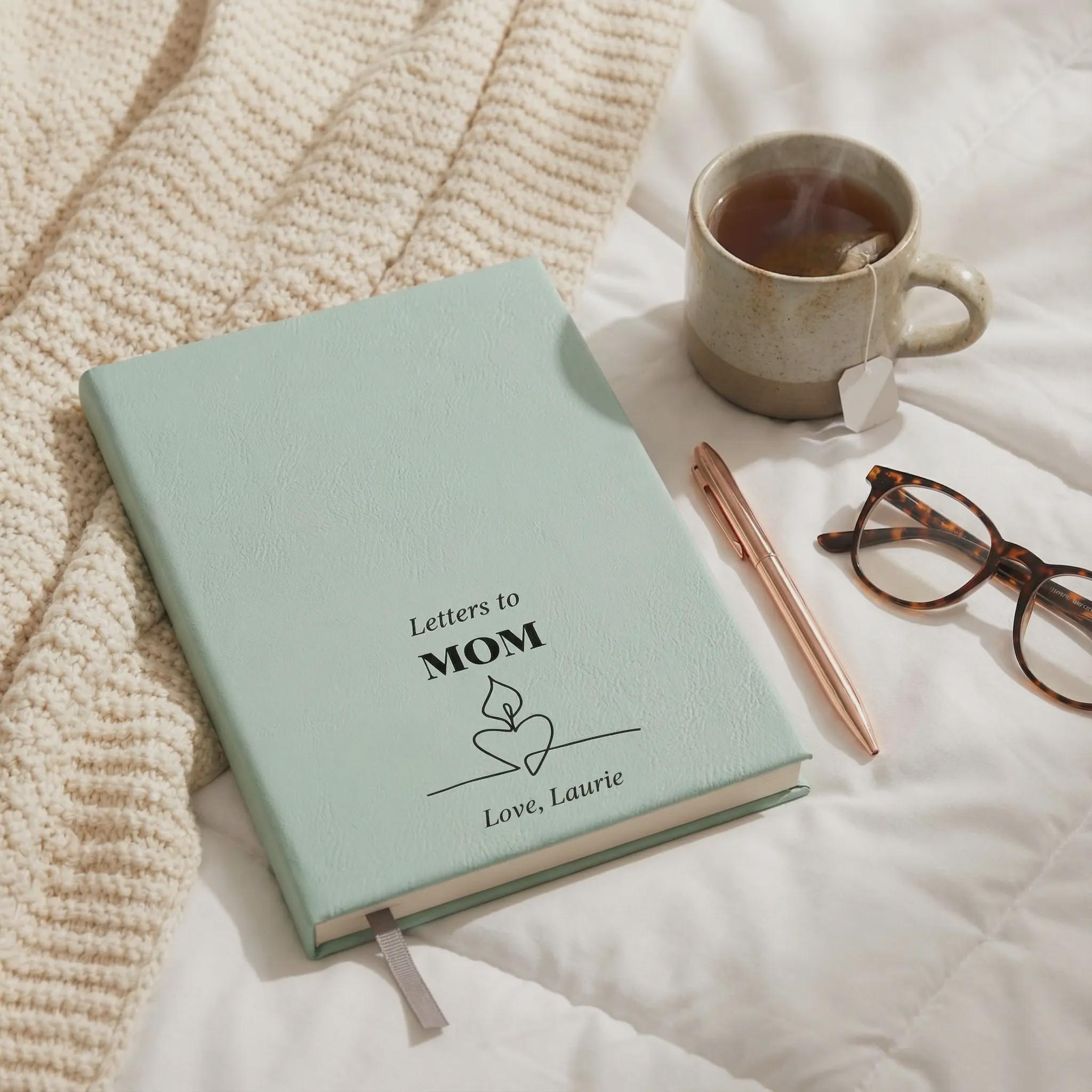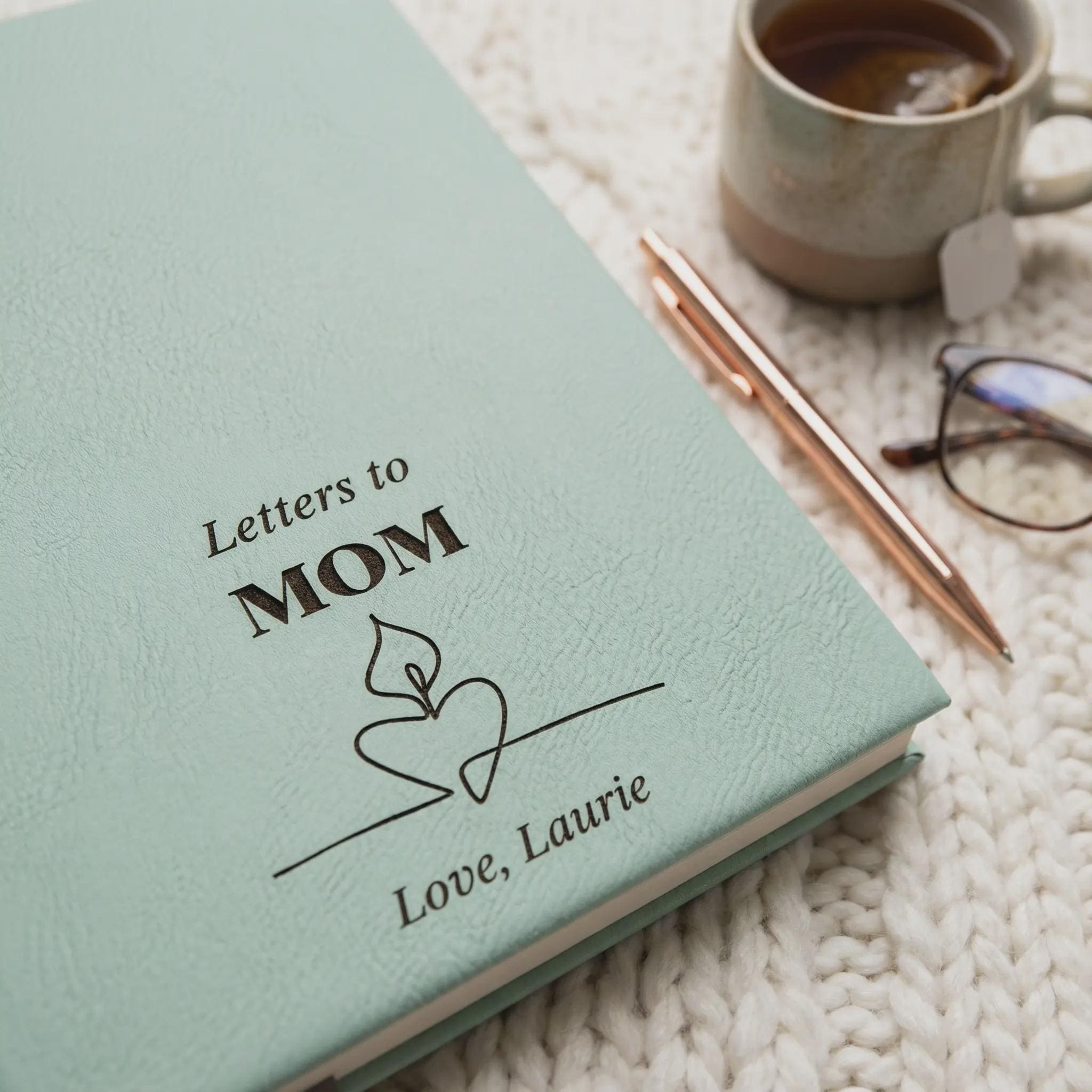 Keep the connection alive with this personalized 'Letters to Mom' journal. Featuring a custom name engraving and soft teal cover, this vegan leather notebook is a touching memorial keepsake or long-distance gift for Mom.