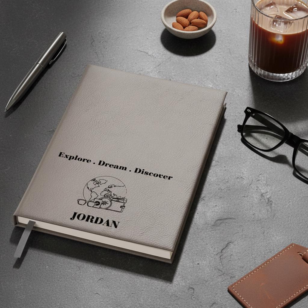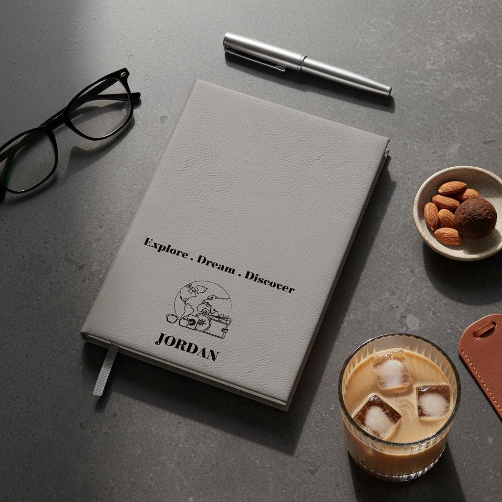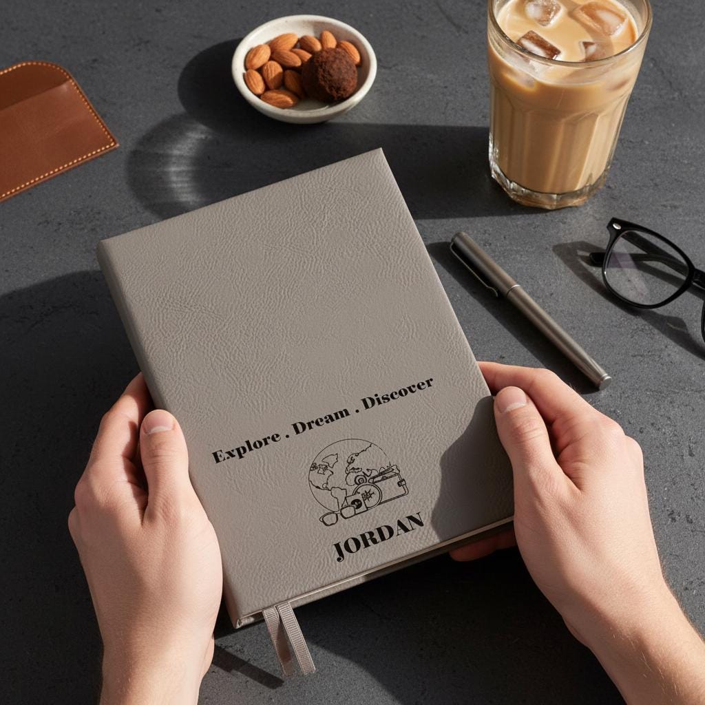 Capture every mile of your journey in this personalized vegan leather travel journal. Featuring the inspiring "Explore. Dream. Discover" quote and a custom-engraved world map, this elegant taupe diary is the ultimate companion for globetrotters and adventure seekers. Whether you’re looking for a unique graduation present, a retirement logbook, or a high-quality customized stationery piece for your own wanderlust, this durable and stylish book is designed to hold a lifetime of memories.